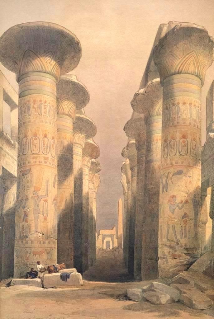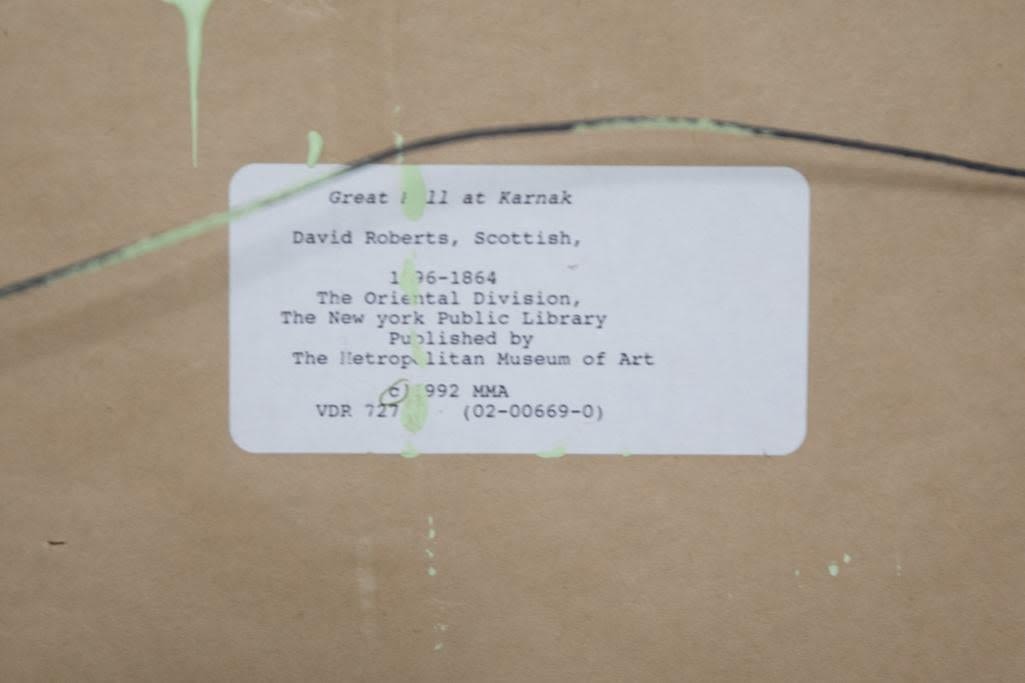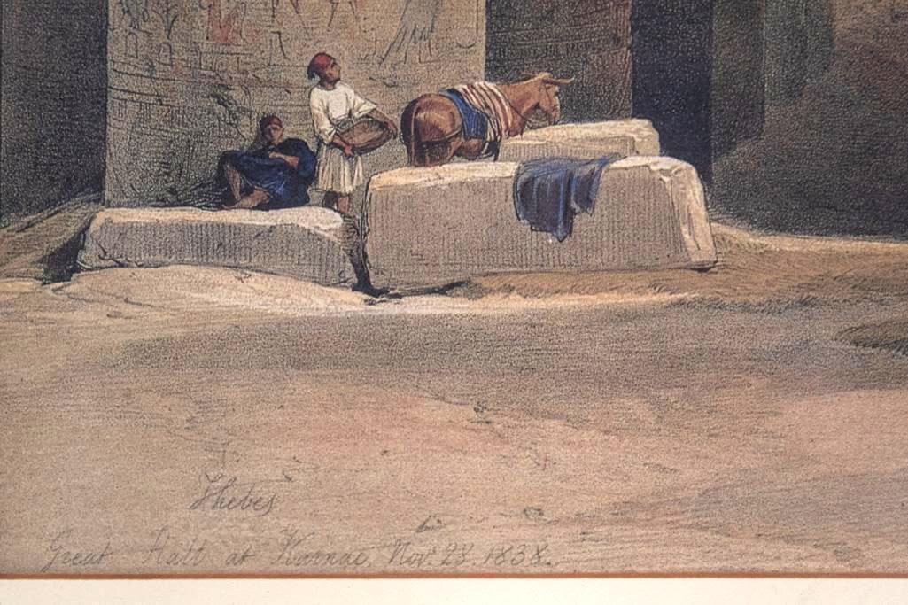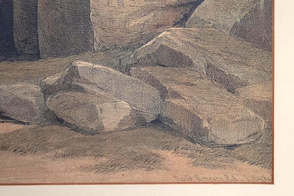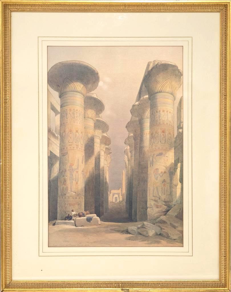 Signed David Robert Hand colored engraved print of Great Hall at Karnack dated 1838. Measures 21.25"W x 27"H Framed