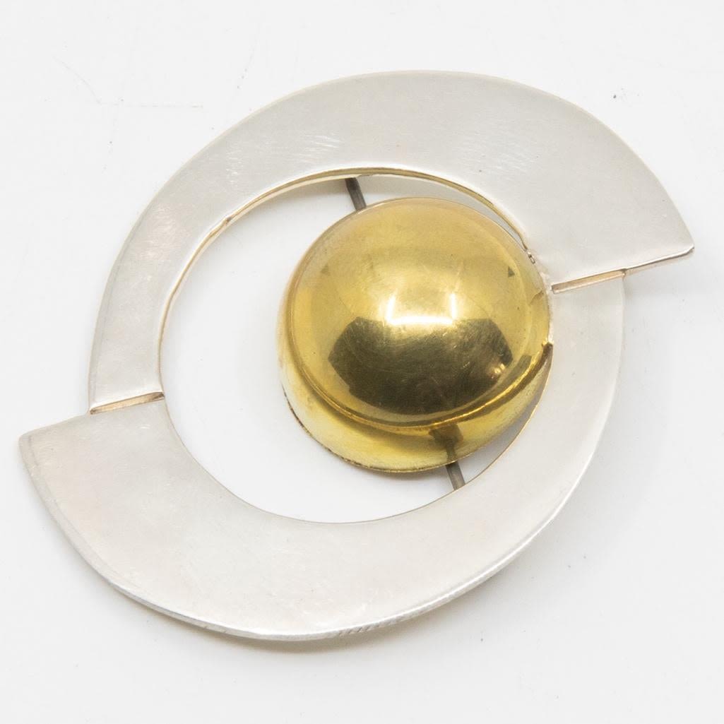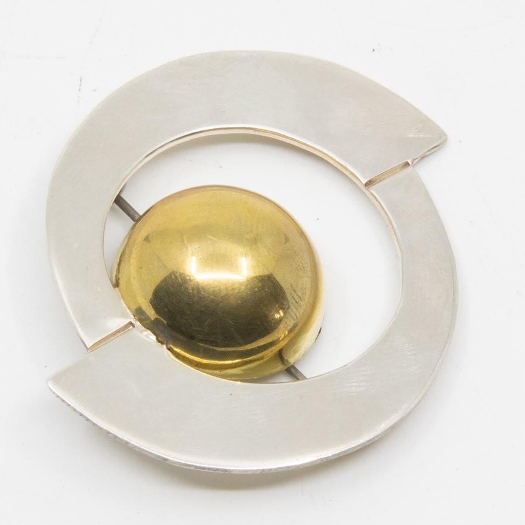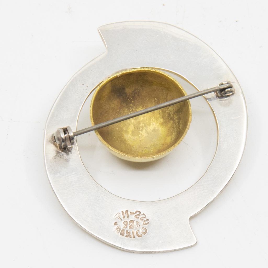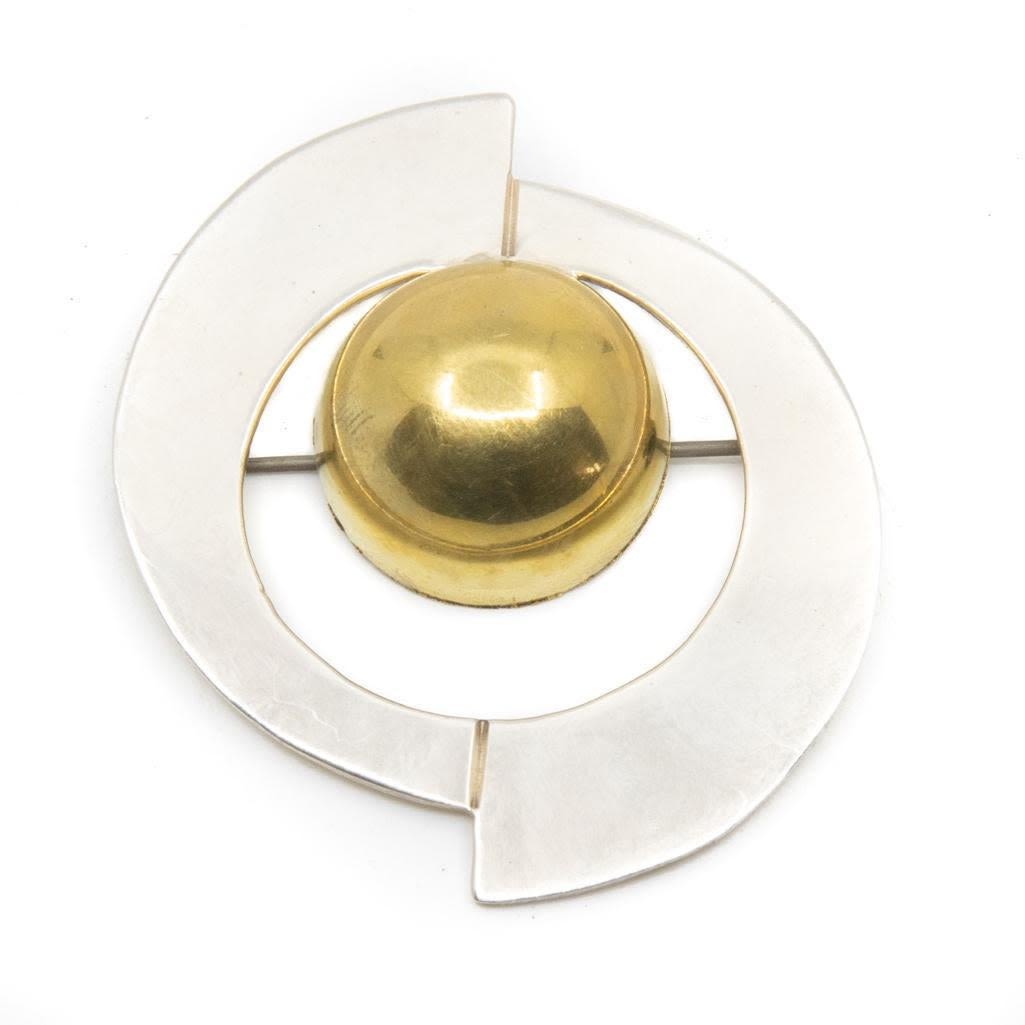 Mid Century Taxco Mexico Sterling/Gold plated vermeil gold brooch artists marked on reverse. Weighs 12.9 DWT and measures 1.75"D