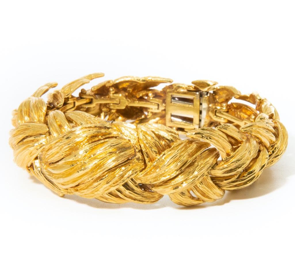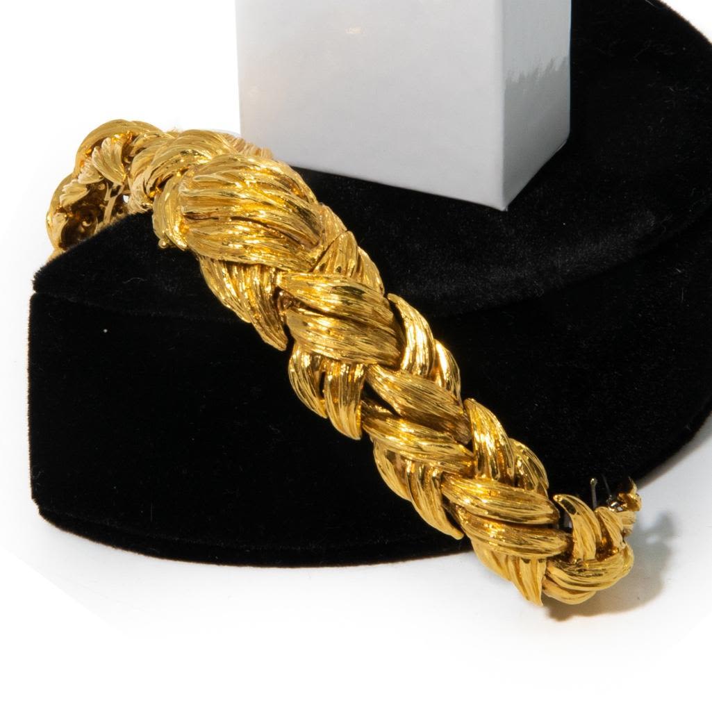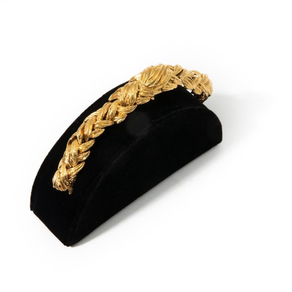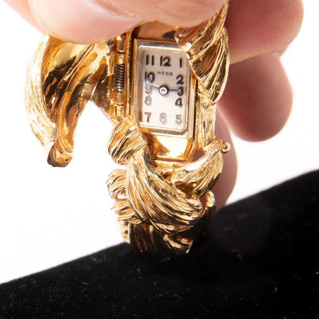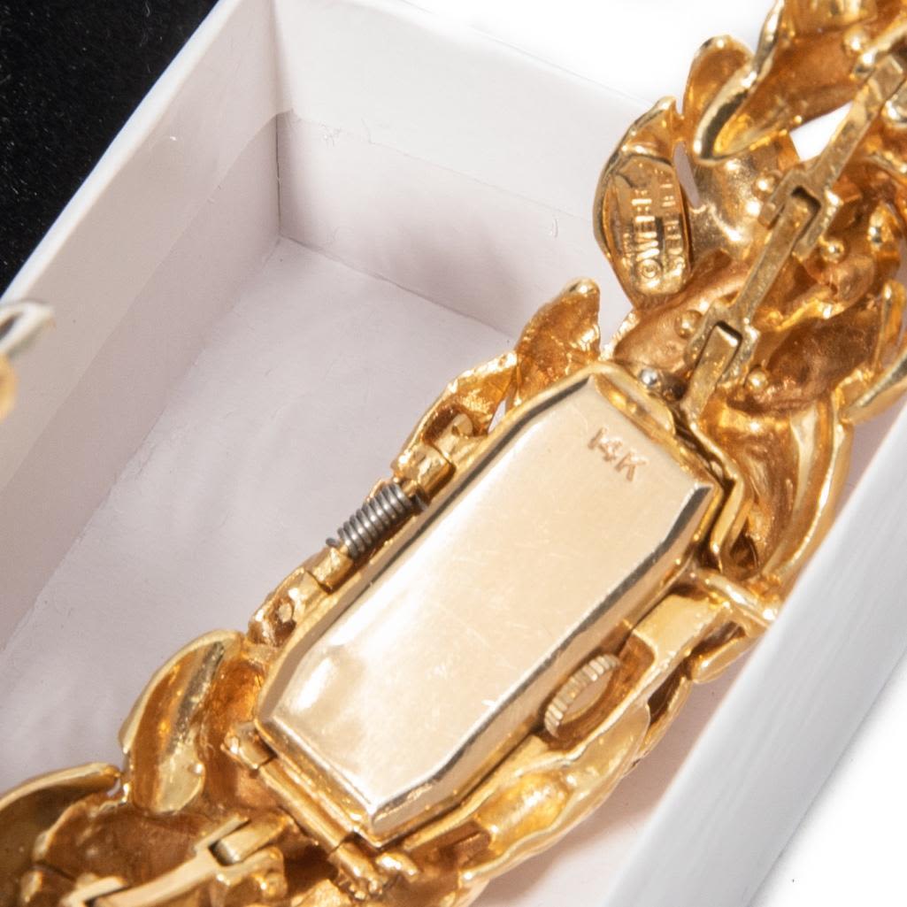 18k gold David Webb textured finish bracelet with watch (case is 14k gold). Bracelet is 6.5" long and 20mm wide at widest (watch) point. watch is manual wind movement, working order. Dial signed Webb, with black Arabic markers. Marked Webb 18k on the bracelet, and 14k on the case back. Weight – 8.79.3 grams.