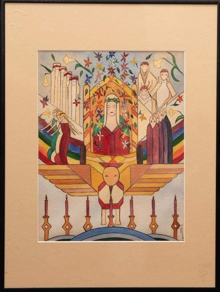 Art Deco watercolor scene from Dante’s Divine Comedy. signed "Jane Jolliffe" l.r., Watercolor and gouache on paper/board, sight sizes to 10 1/2 x 8 1/2 in