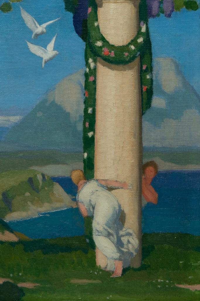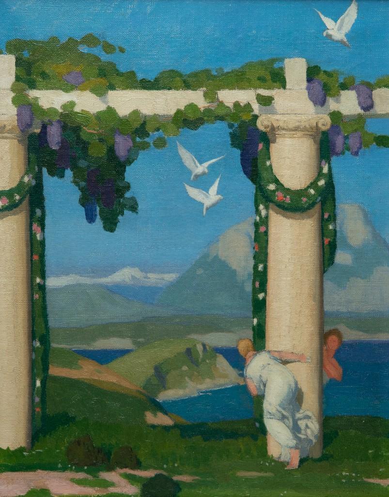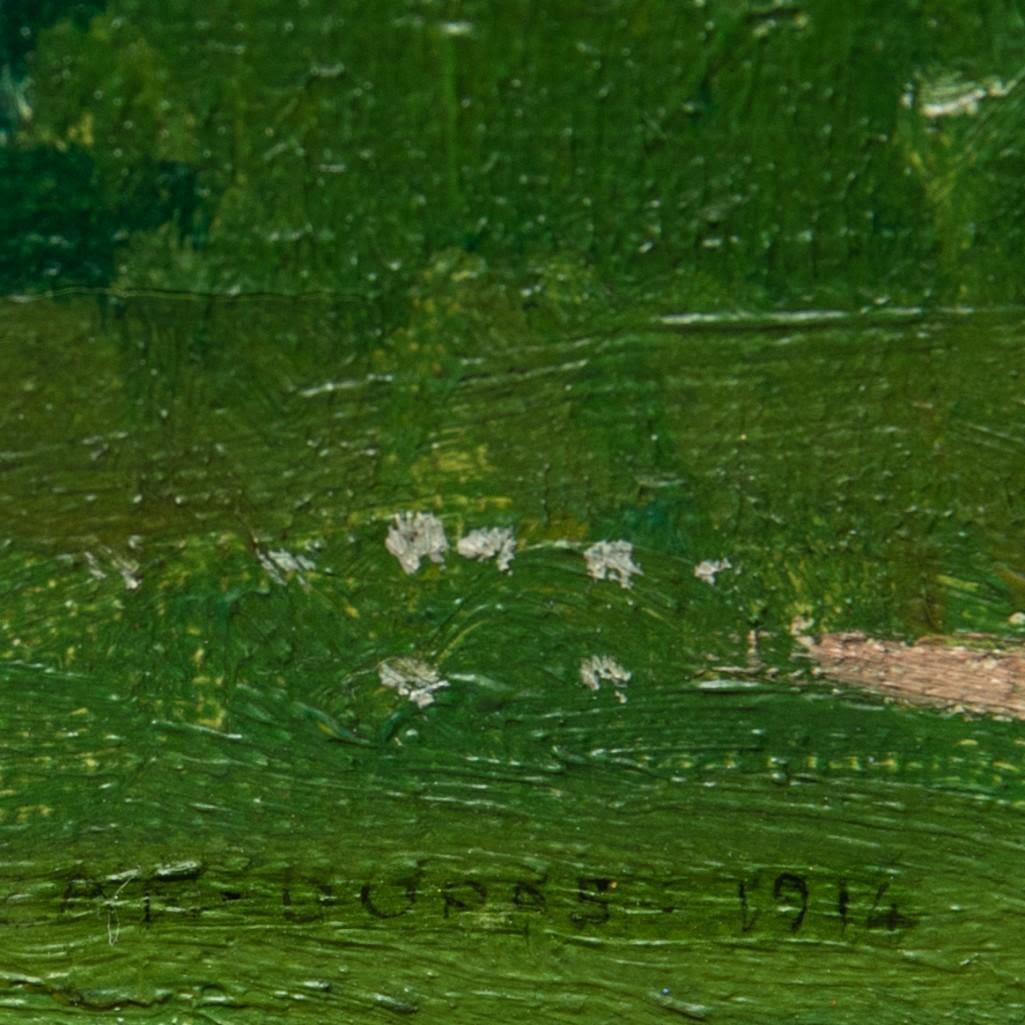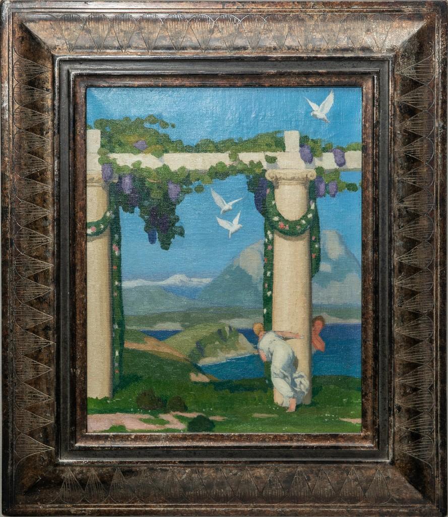 Jean Theodore Dupas Early 20th Century Signed and Dated "Hide and Seek" Oil on Canvas l. 16"H x 14"W. One of the most important art deco period artists, Jean Dupas is known for painting and at deco glass design. He was born in Bordeaux in 1882. He studied with Carolus-Duran and Albert Besnard at l’École des Beaux-Arts de Bordeaux.Dupas was awarded the Grand Prix de Rome in 1910. He exhibited at the Salon de la Société des Artistes Français and received several awards at the salon, including a Gold Medal in 1922. In 1925 Dupas finally received international fame when he was asked by Emile-Jacques Ruhlmann to decorate his pavilion at the ExpositionInternationale des Arts Décoratifs et Industriels in Paris. He was awarded the Légion d’Honneur in 1926.