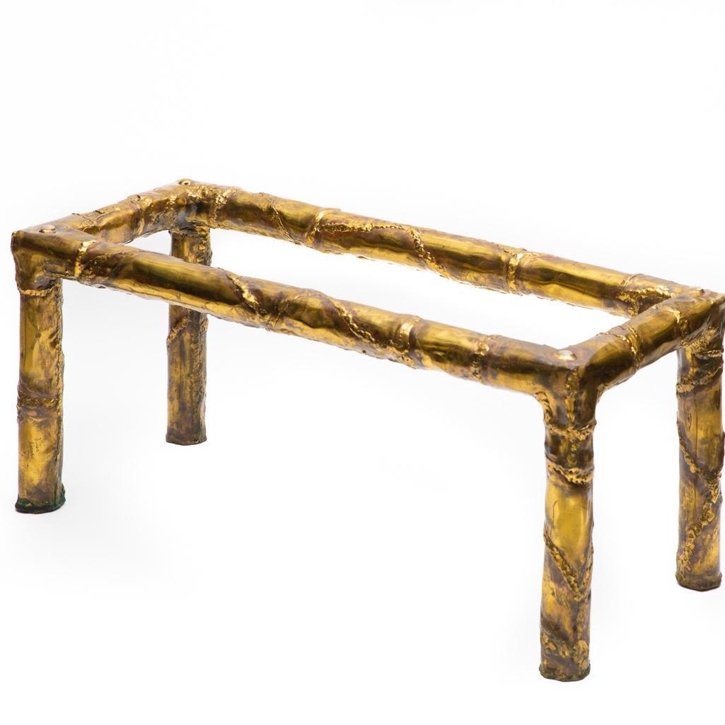 Silas Seandel Signed Mixed Metal Coffee Table. Measures 16"H x 22" x 44" Seandel studied sculpture and economics at the University of Pennsylvania. He graduated in 1950 and opened a studio in 1963, and for over 40 years has commissioned creative pieces of functional art, or sculptured furniture. Seandal has been profiled by a number of publications during his career, including Interior Design magazine in 1982 (Vol. 53, Issue 12) and Hudson Magazine in 2008 (Vol. 4 Issue 1, 2008). He was also profiled in a chapter of Modern Americana: Studio Furniture From High Craft to High Glam by Julies Iovine and Todd Merill (Rizzoli 2008), describing him as one of the premier metal sculptors in the United States in the late 20th century. Seandal’s works are all handmade in his studio located in the Chelsea neighborhood of Manhattan He uses solid metals such as brass, bronze, steel, copper, etc. There are no enamels, no veneers, or unnatural materials, and all colors are the results of acids and heat treatments which Seandel has developed.