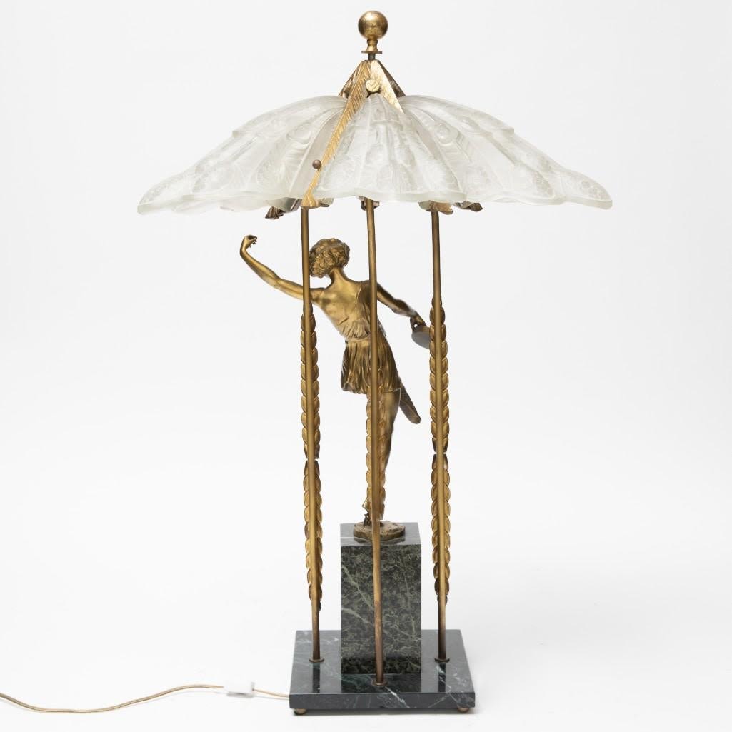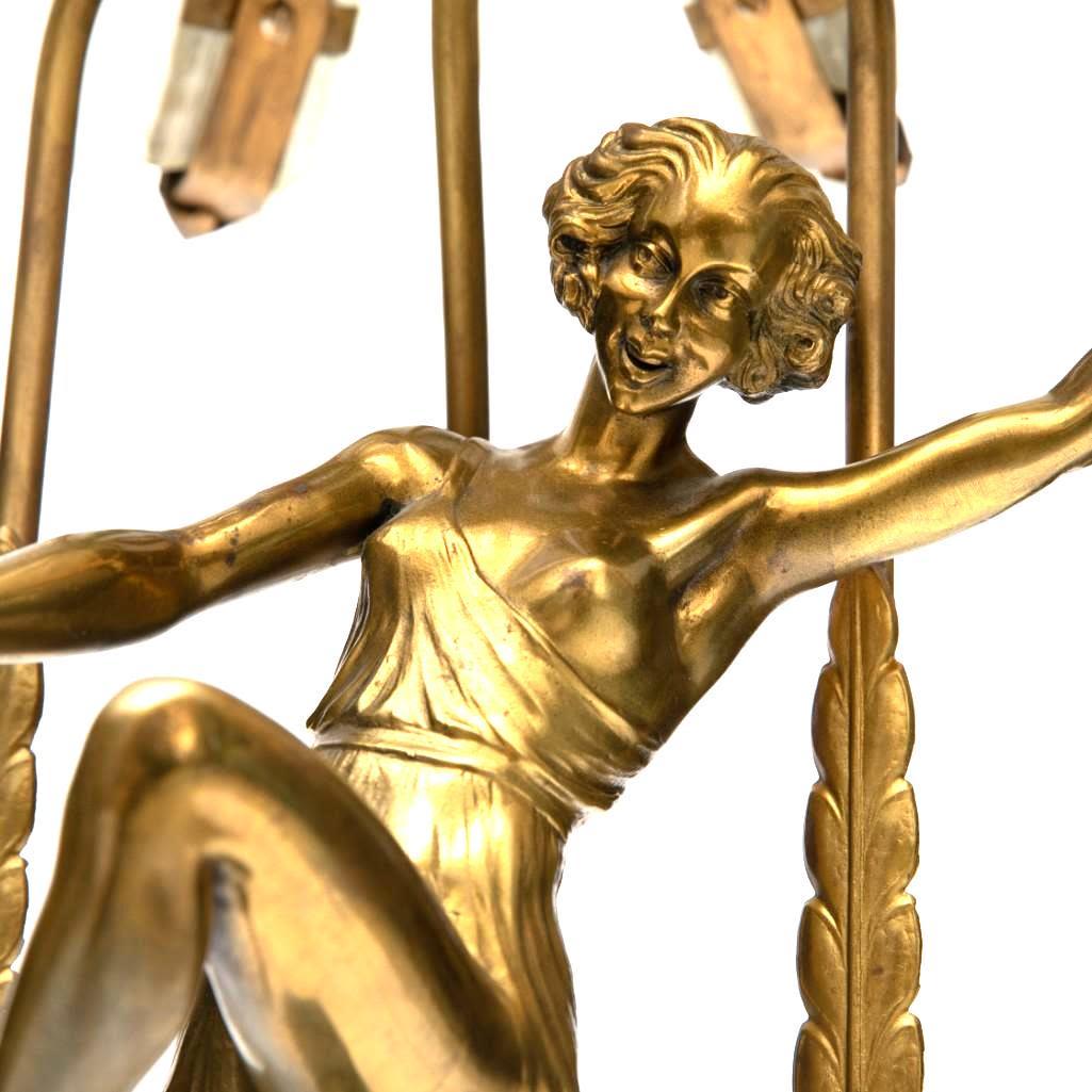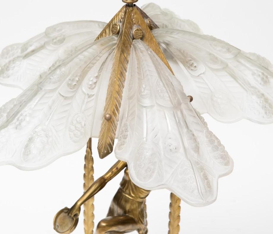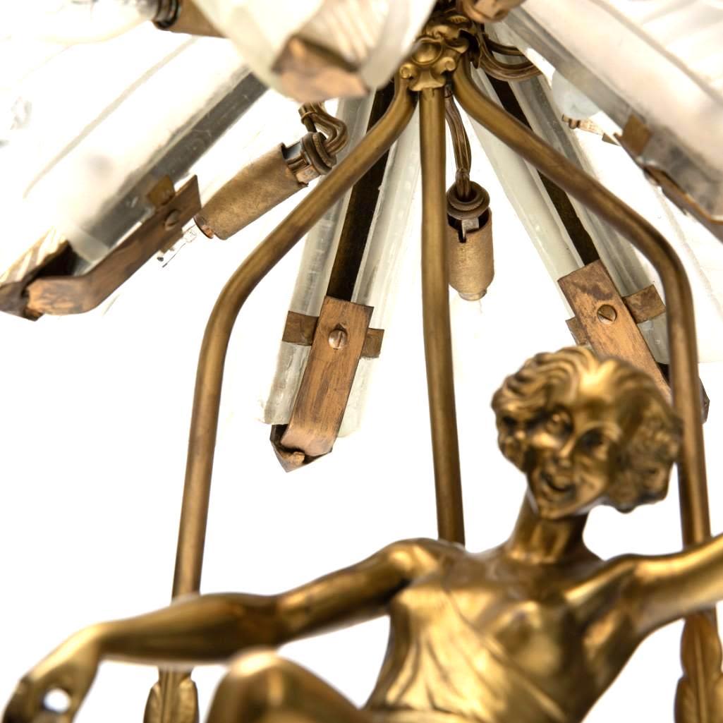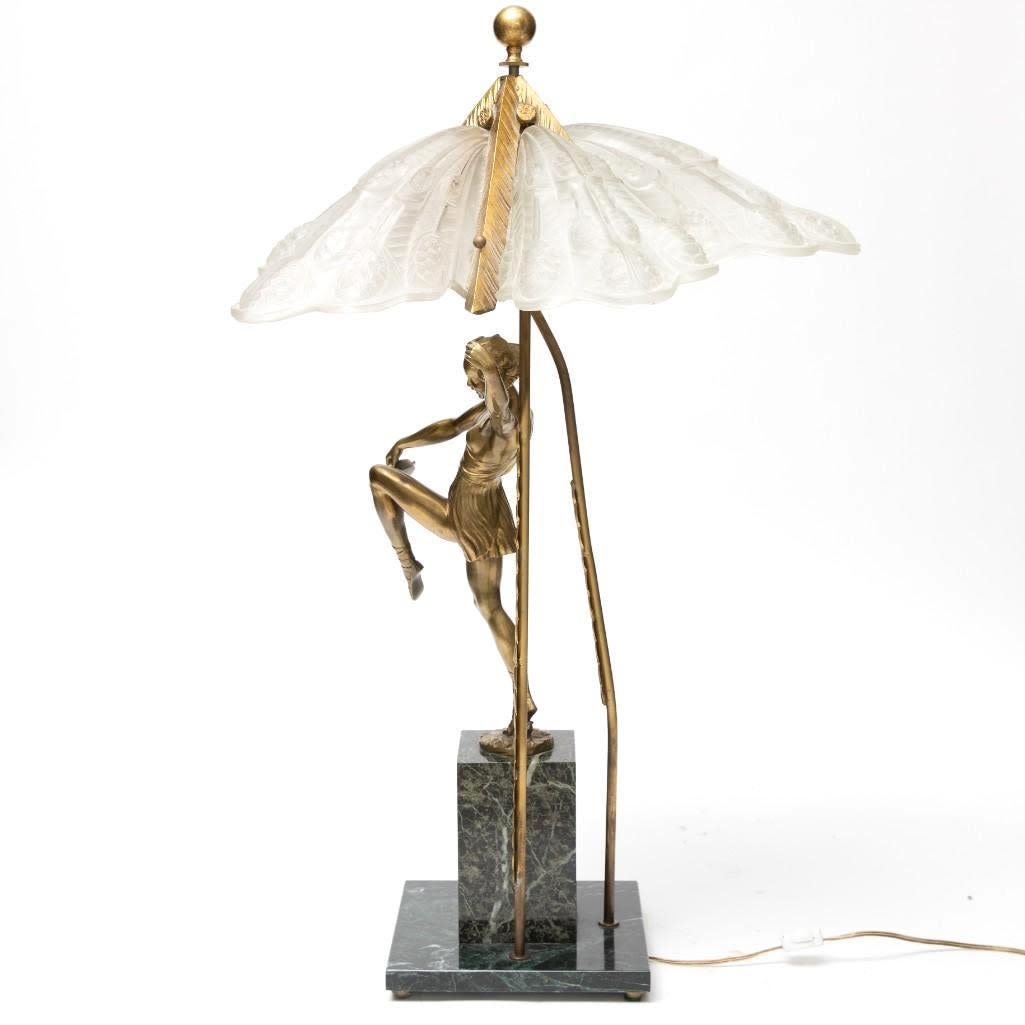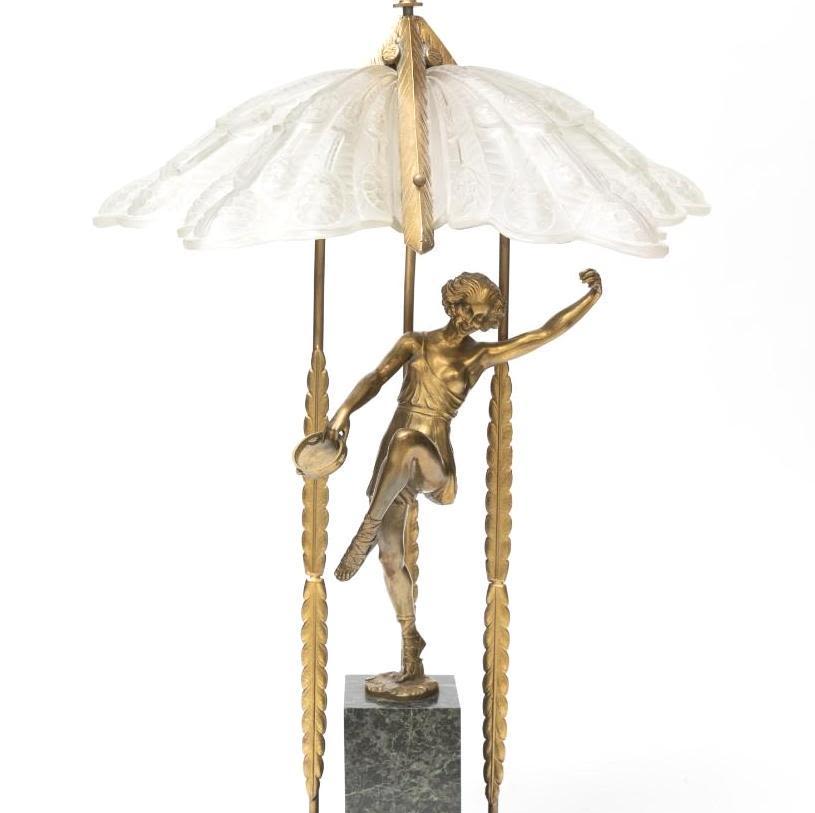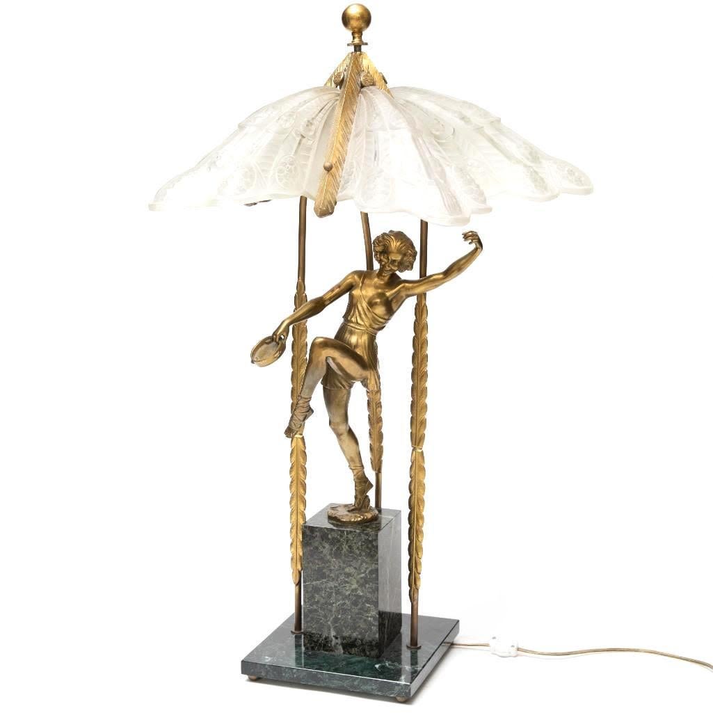 Tall Art Deco Brass and Frosted Glass Lamp Depicting a dancer with tambourine. Height 33 1/2 inches, diameter 23 inches.