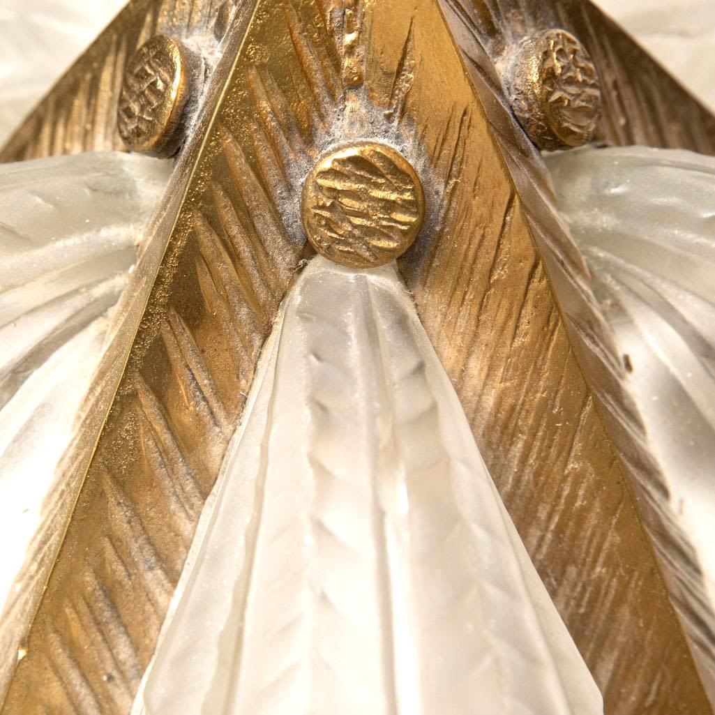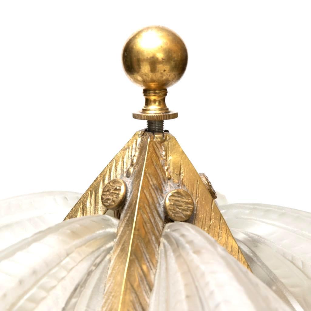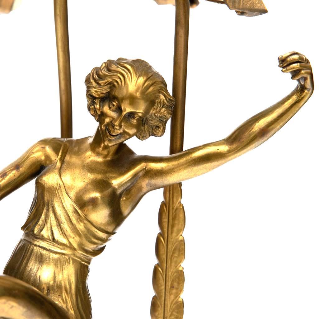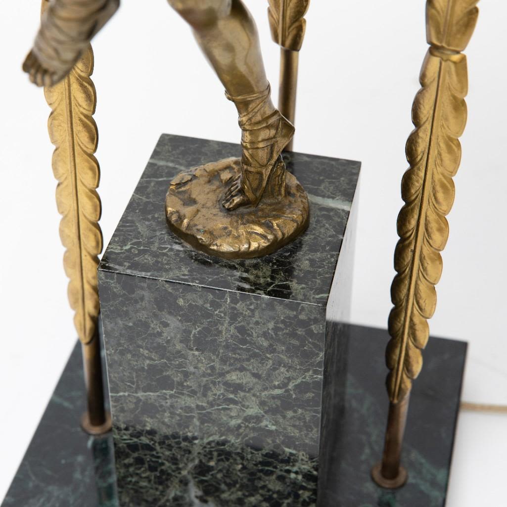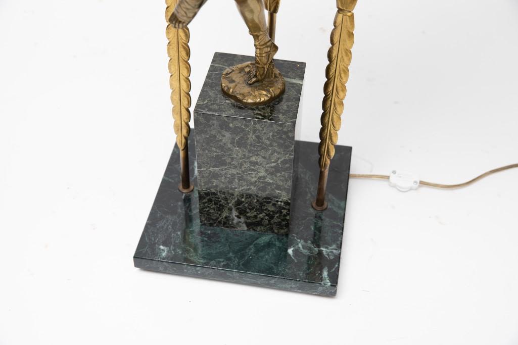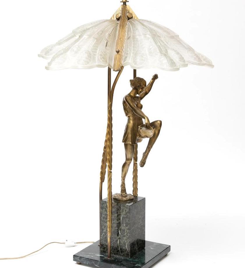 Tall Art Deco Brass and Frosted Glass Lamp Depicting a dancer with tambourine. Height 33 1/2 inches, diameter 23 inches.