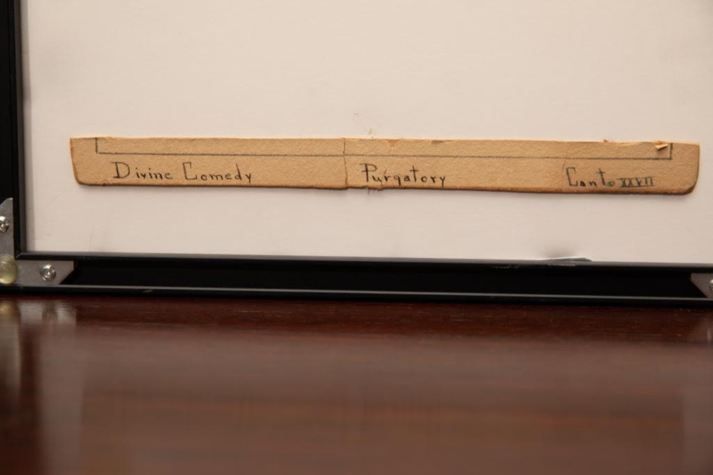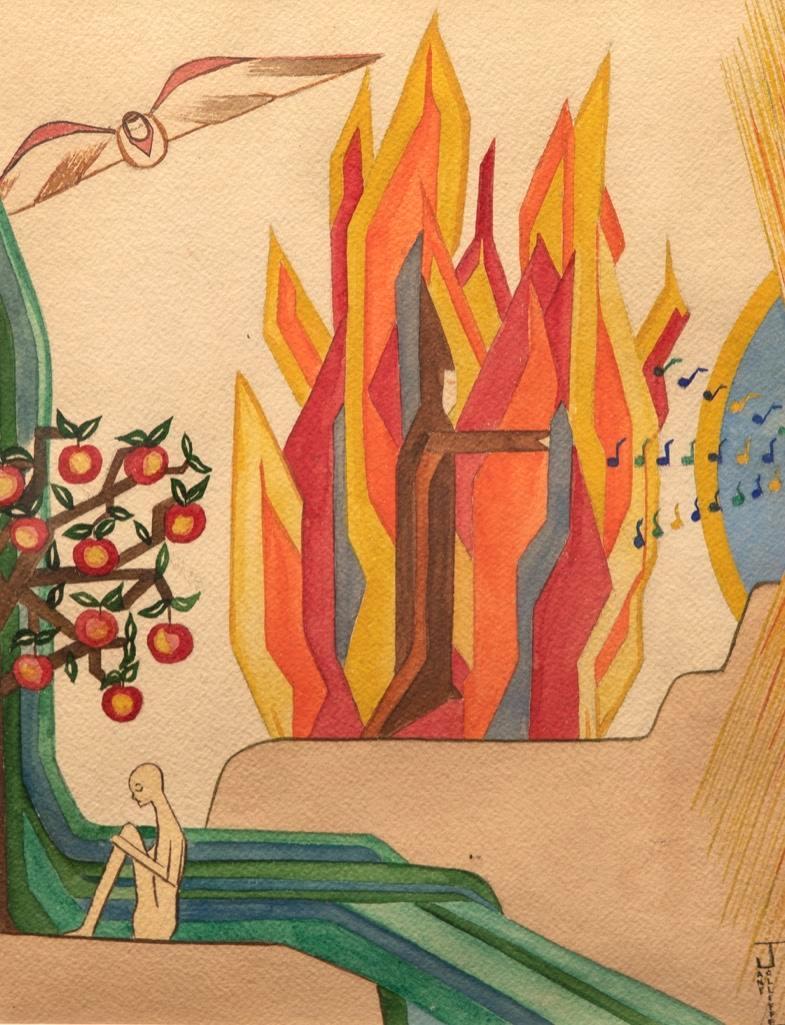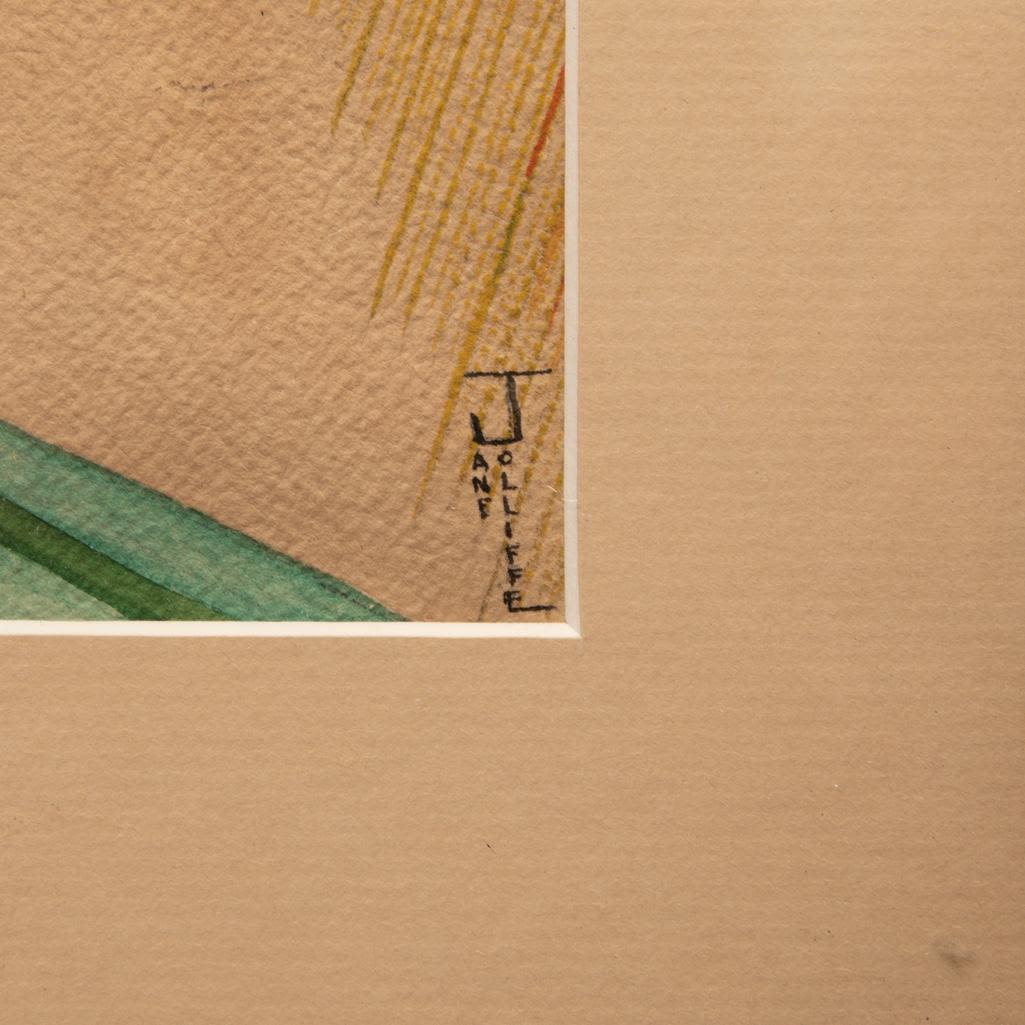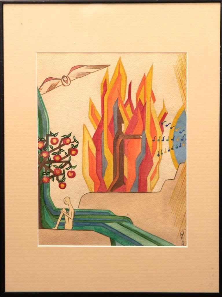 Art Deco watercolor scene from Dante’s Divine Comedy. signed "Jane Jolliffe" l.r., Watercolor and gouache on paper/board, sight sizes to 10 1/2 x 8 1/2 in