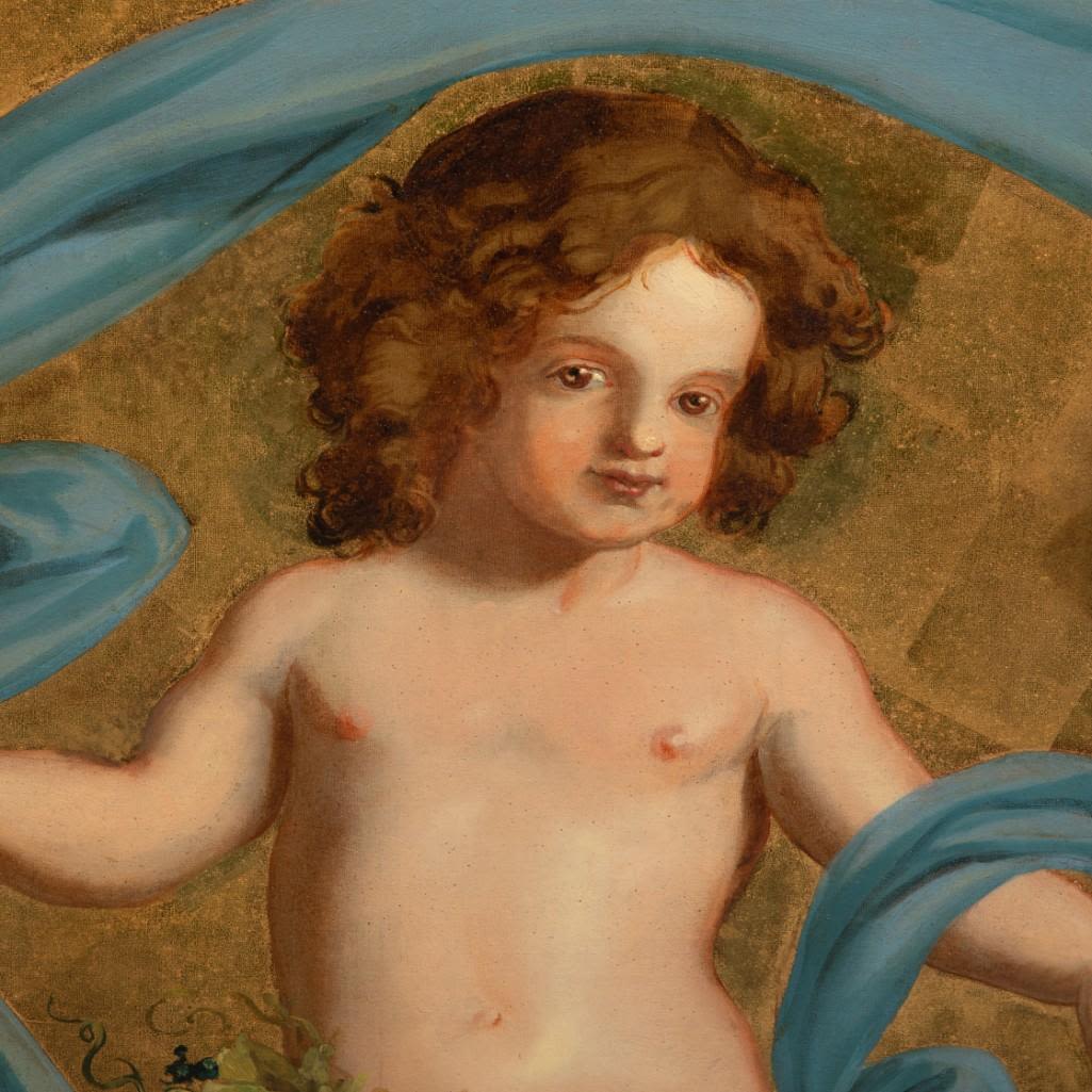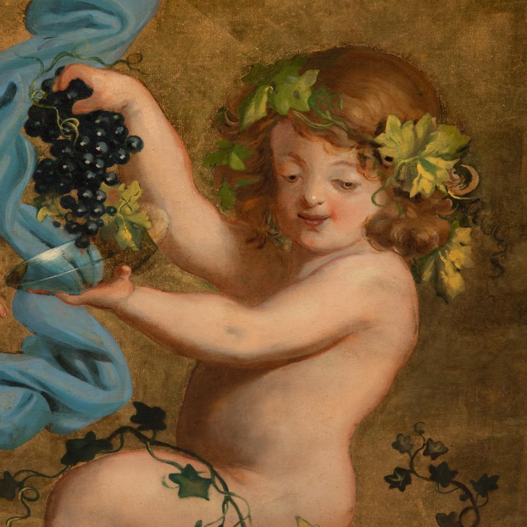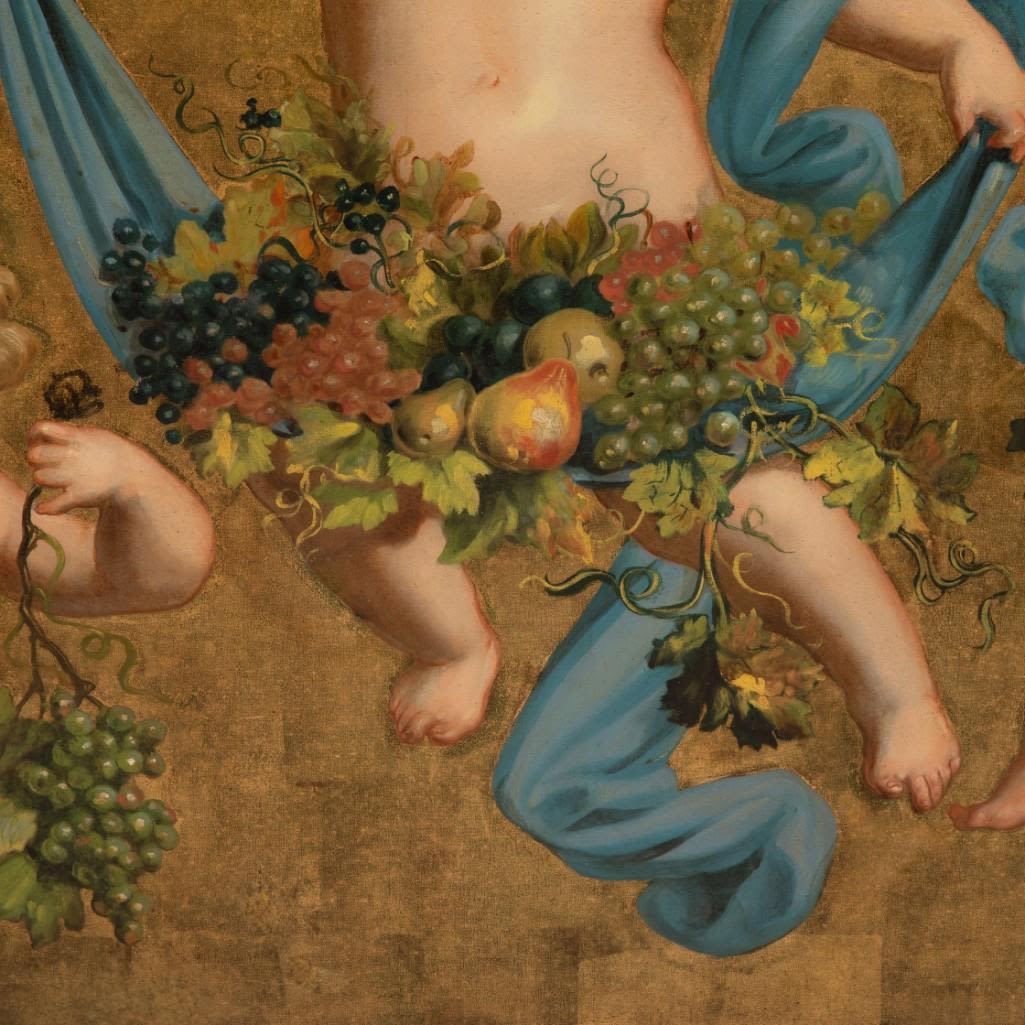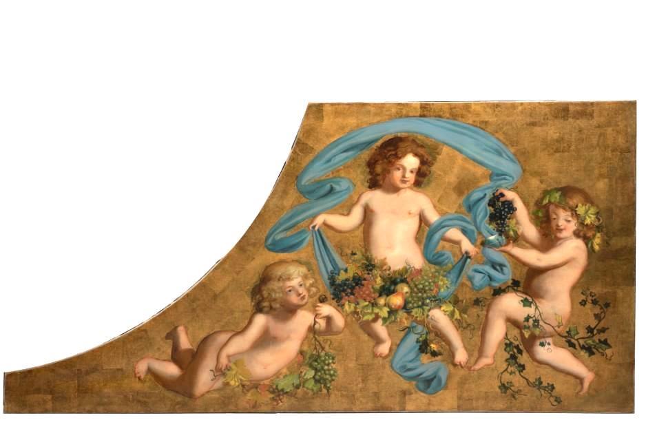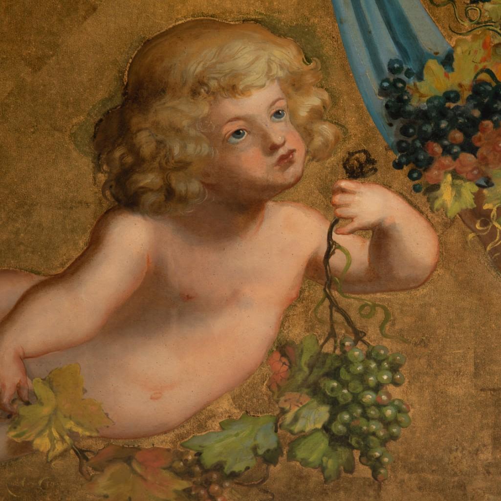 Attributed to Hans Makart Kries Architectural Oil painting on canvas Cavorting Putti with Garlands of Fruits and Flowers. Applied gold leaf throughout. Unframed. 39.5" x 80"