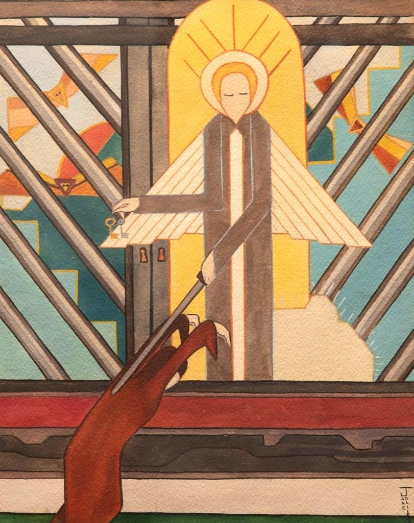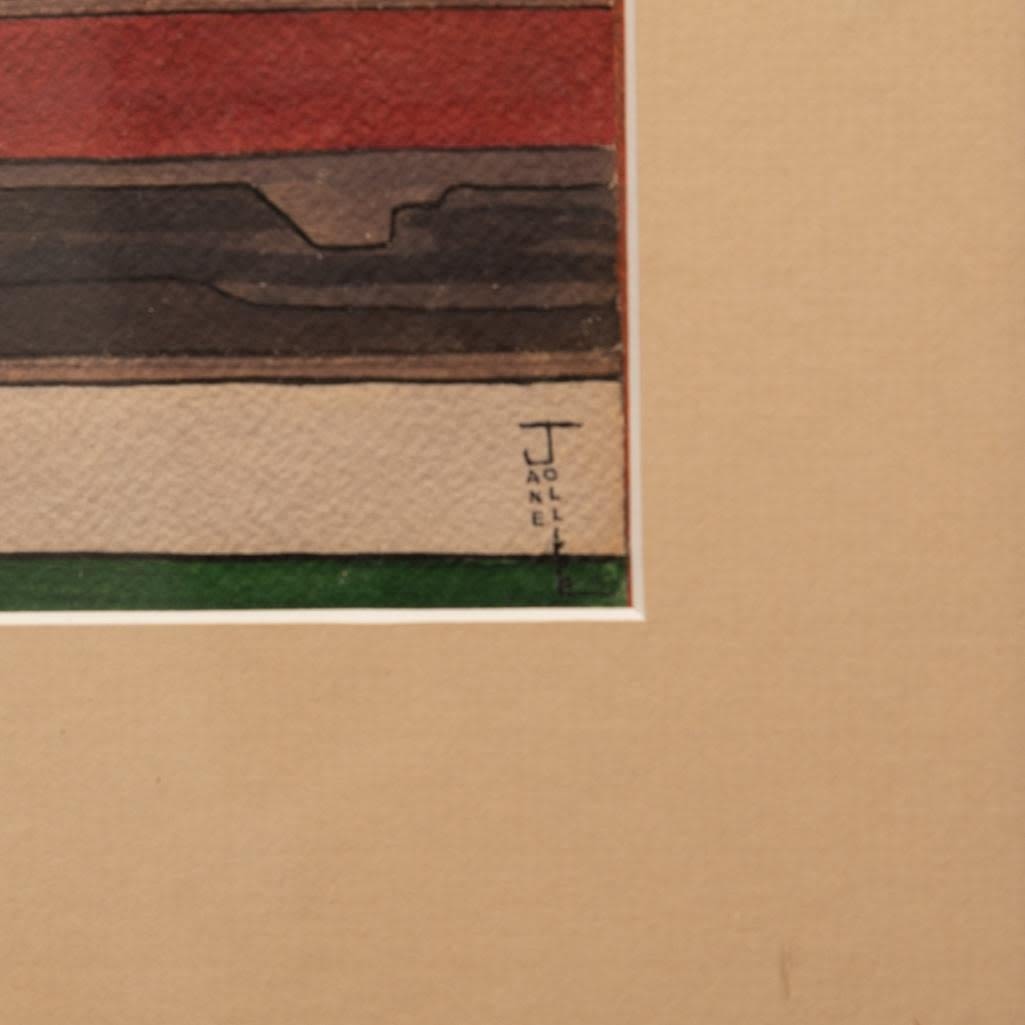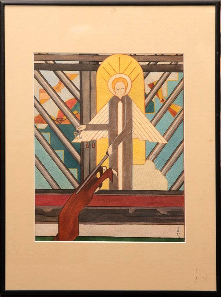 Art Deco watercolor scene from Dante’s Divine Comedy. signed "Jane Jolliffe" l.r., Watercolor and gouache on paper/board, sight sizes to 10 1/2 x 8 1/2 in