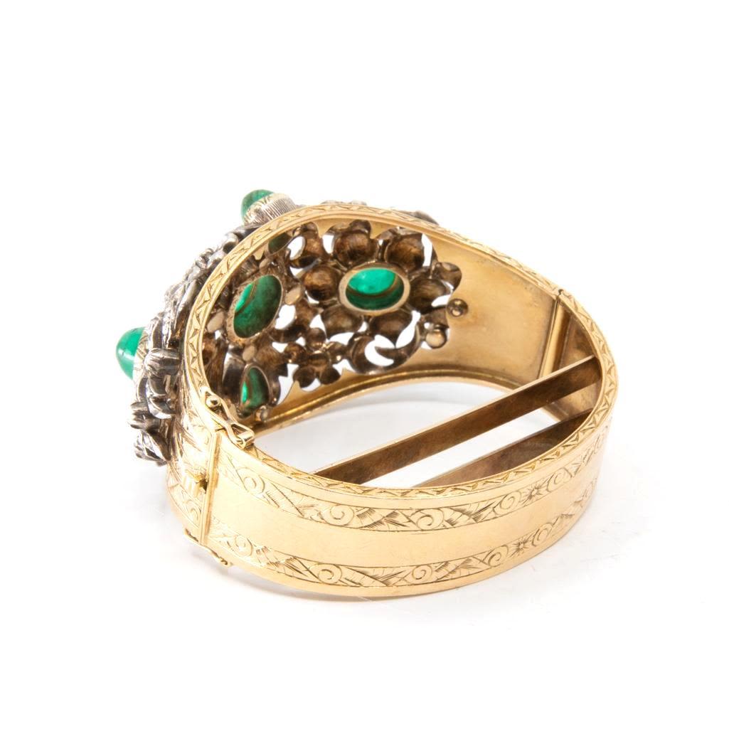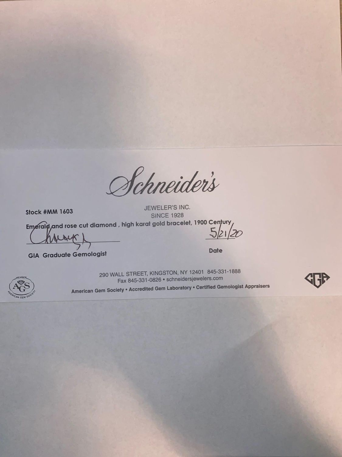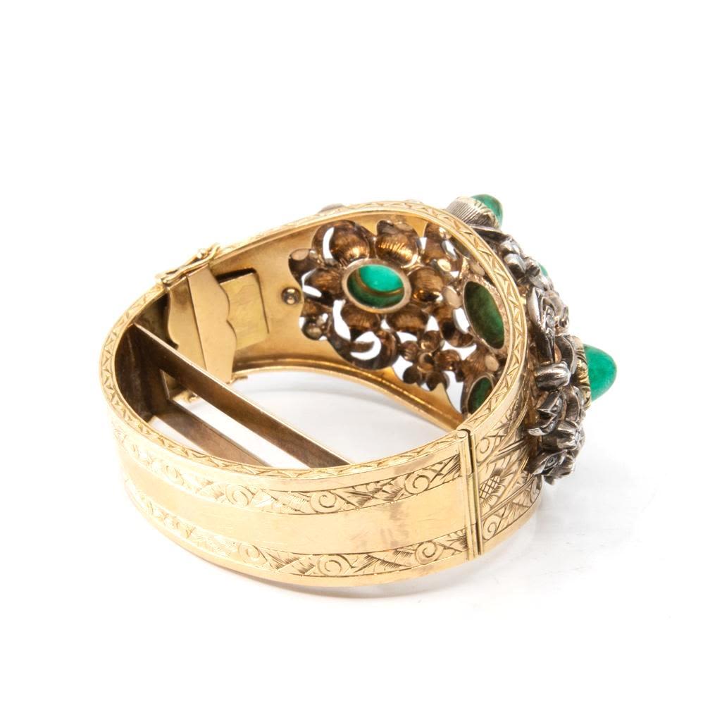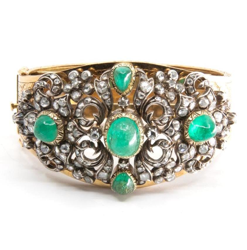 Mid 19th century 22 carat white and yellow Gold, Emerald, and Diamond Bracelet, the hinged bangle set with cabochon emeralds and rose-cut diamonds set in 22 carat white gold. engraved accents, 48.2 dwt, interior cir. 6 3/4, wd. 1 5/8 in., hallmarks. This lot is accompanied by a GIA appraiser letter from an independent and well respected firm established over 75 years ago.