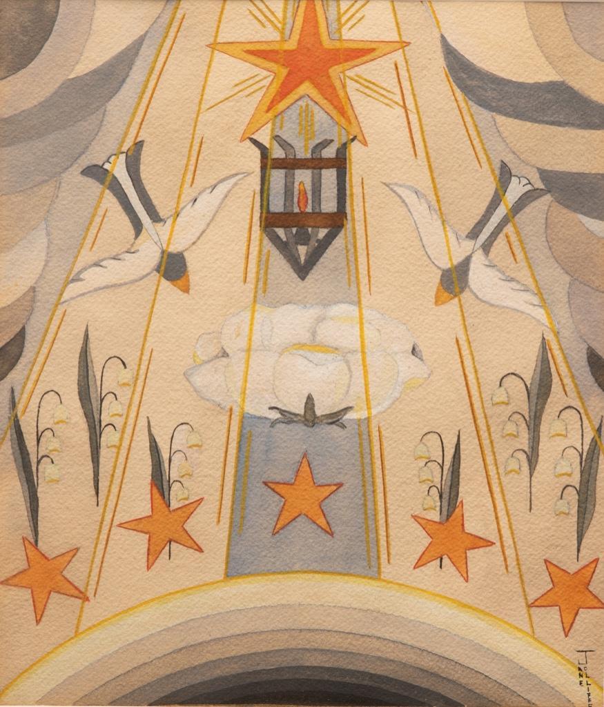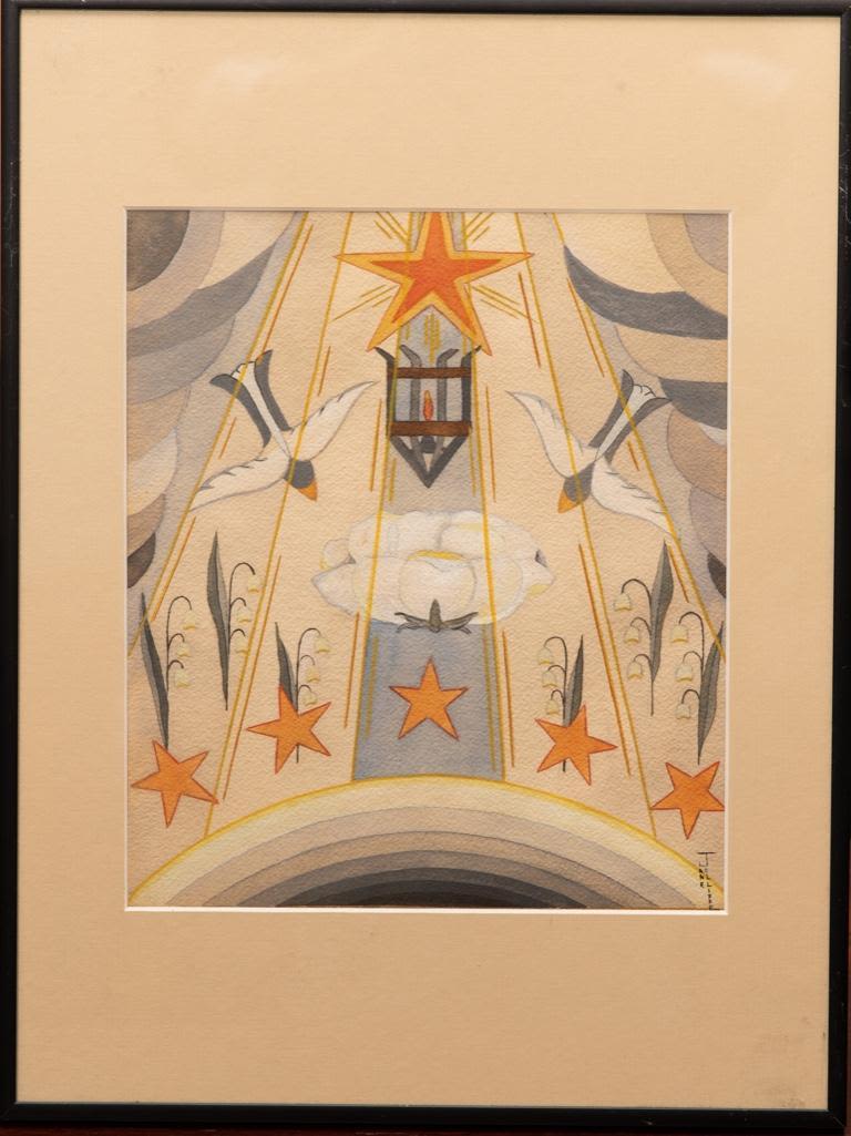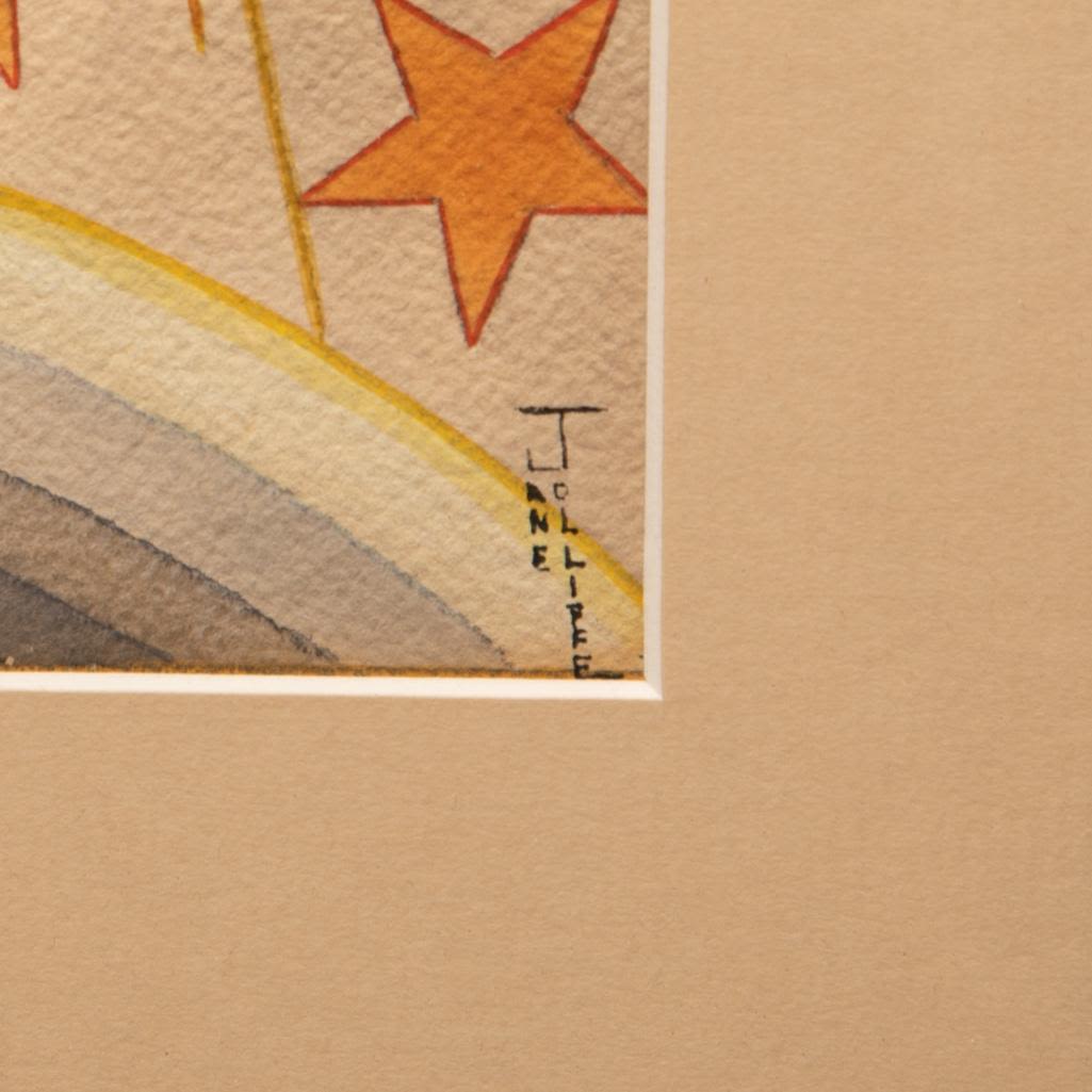 Art Deco watercolor scene from Dante’s Divine Comedy. signed "Jane Jolliffe" l.r., Watercolor and gouache on paper/board, sight sizes to 10 1/2 x 8 1/2 in