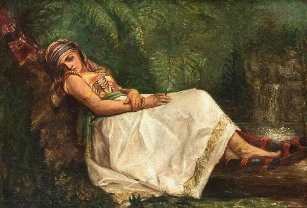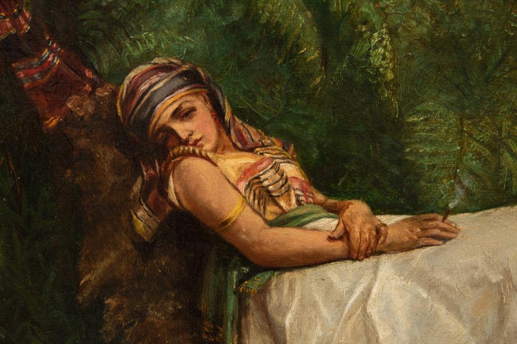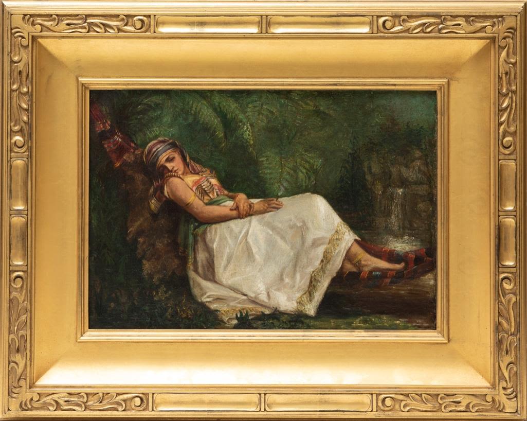 Orientalist 19th century painting, harem girl in forest. Painting on Canvas: 19.5" x 13.5" in a frame: 30" x 23.75"