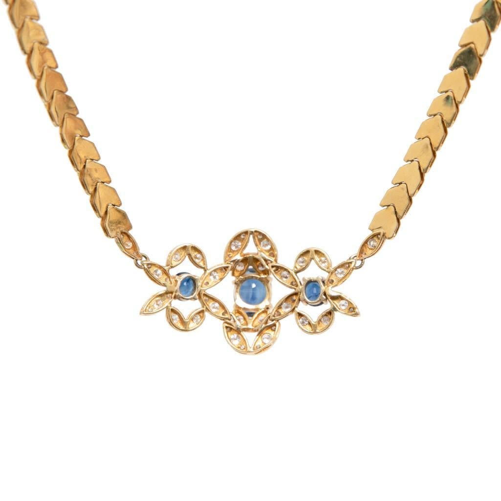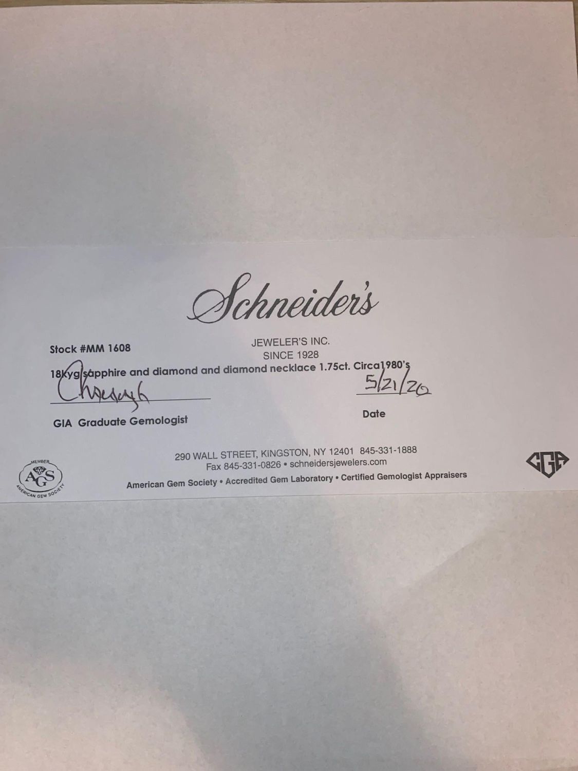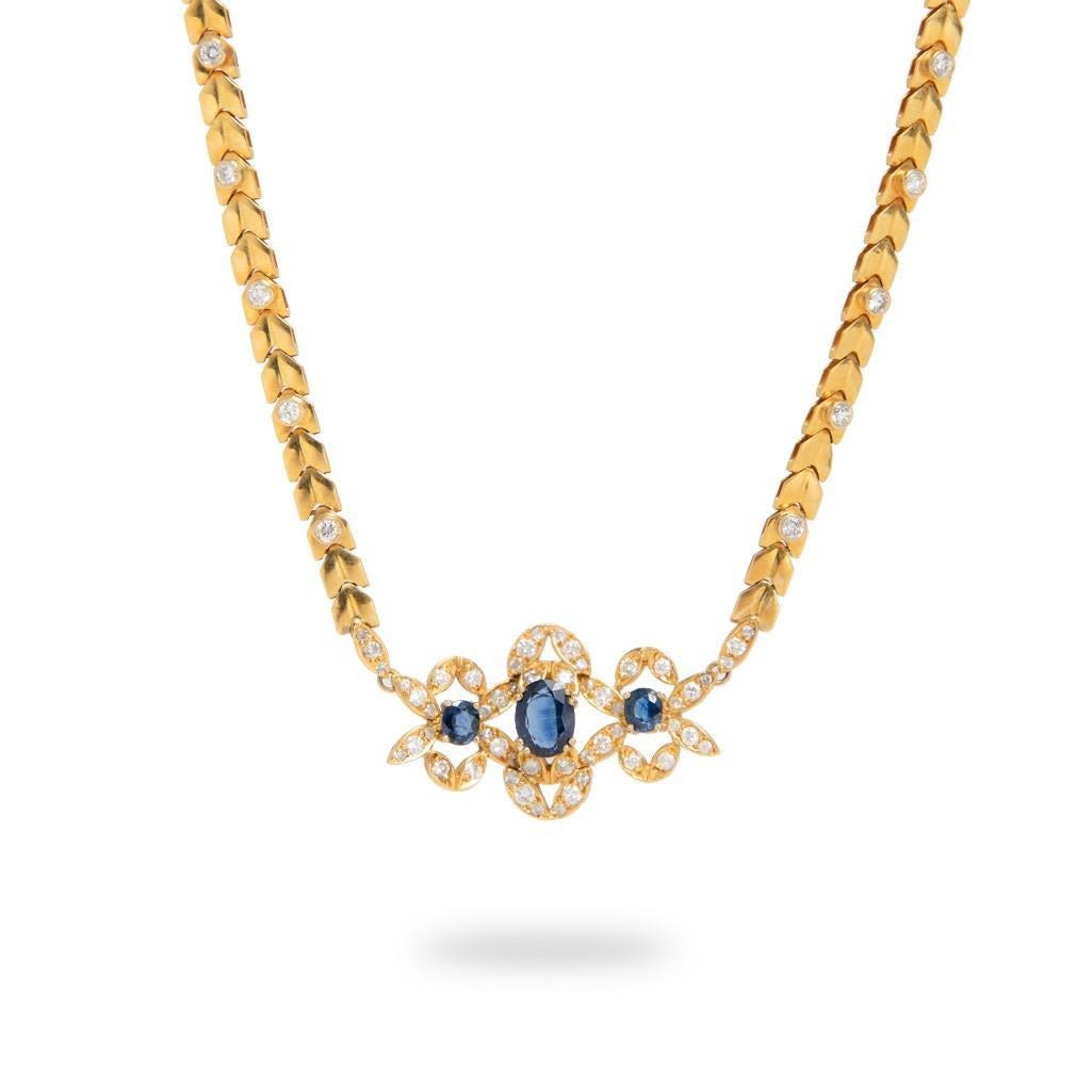 A Yellow Gold, Sapphire and Diamond necklace containing one oval shape mixed cut sapphire measuring approximately 9.00 x 6.95 x 3.20 mm, two oval shape mixed cut sapphires and 66 round brilliant cut diamonds weighing approximately 1.75 carats total. Measure 18"L and weighs 19.4dwt approx. This lot is accompanied by a GIA appraiser letter from an independent and well respected firm established over 75 years ago.