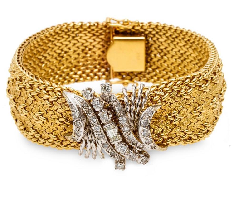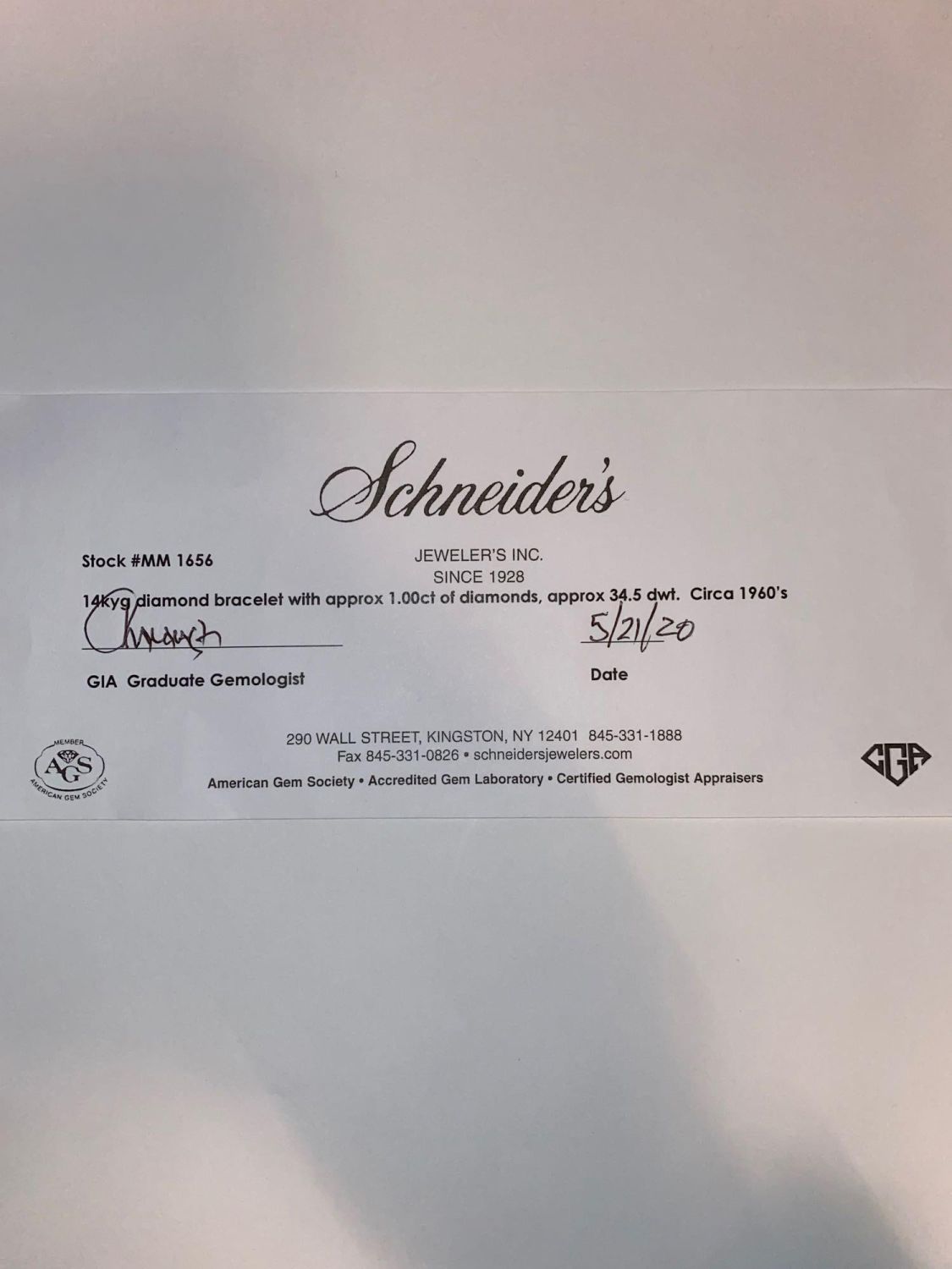 14k Gold and Diamond Bracelet Marked ’14k’, with approx. 1.00 carat of round and baguette diamonds set in white gold. 71/2 in., 34.5 dwts. This lot is accompanied by a GIA appraiser letter from an independent and well respected firm established over 75 years ago.