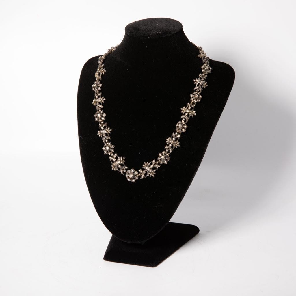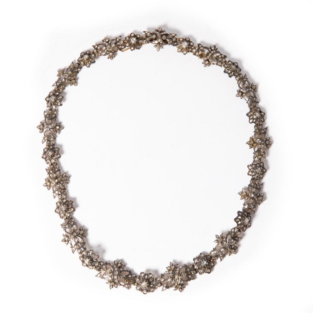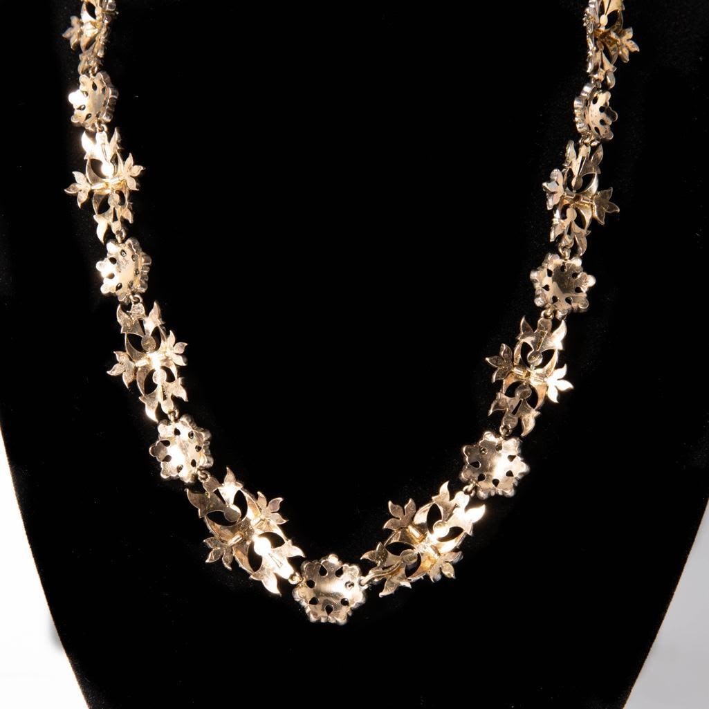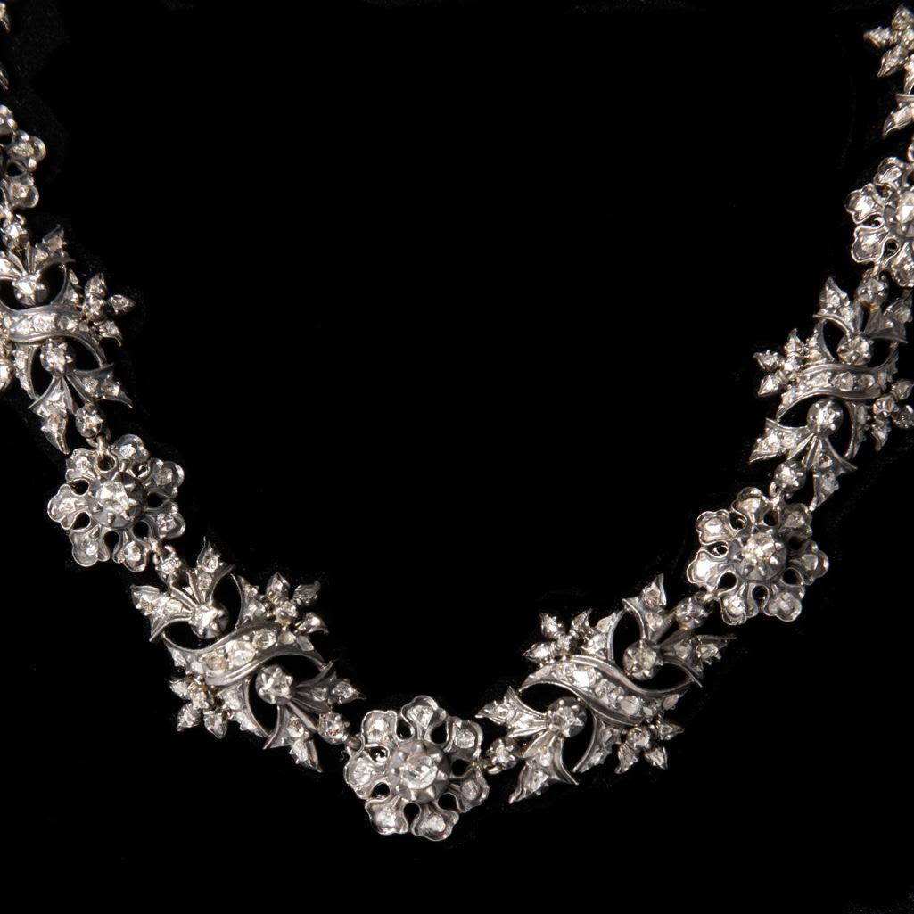 Mid 19th Attributed to Charles Tiffany Magnificent rose cut diamond necklace. The necklace contains 494 rose cut diamonds, the bottom is gold and the top is silver.The clasp has a maker’s mark of CT, in a box.