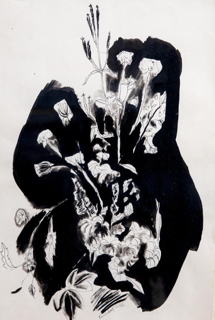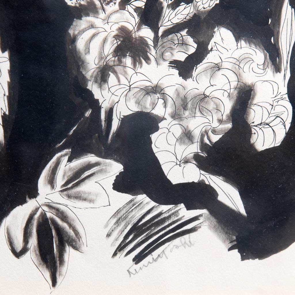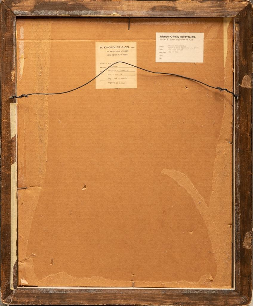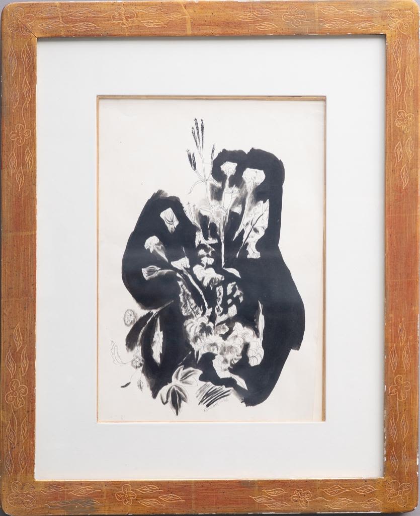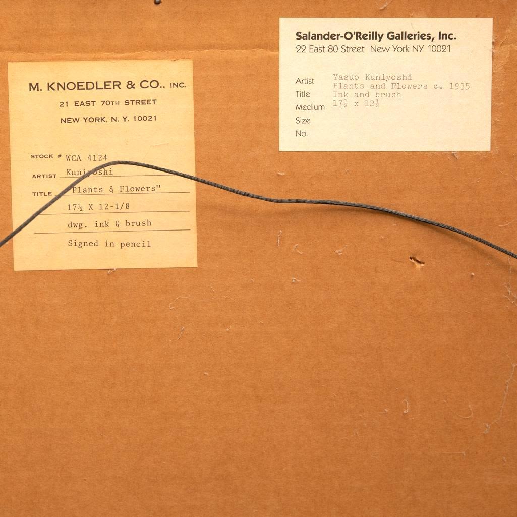 "Plants & Flowers", Yasuo Kuniyoshi, signed 17.5" by 12.25", ink & brush, several labels: M. Knoedler & Co, Salander-O’Reilly Galleries inc. Painter and photographer of art. His languid women in repose from the 1930s are significant, but he also painted still life and landscapes. He was the first president of Artists Equity and co founder of the American Artists Congress. After immigrating to the United States in 1906, Kuniyoshi lived briefly in Seattle, then moved to Los Angeles and subsequently to New York where he studied at the Robert Henri School, the Independent School, and at the Art Students League. Hamilton Easter Field, patron and friend of Robert Laurent, befriended Kuniyoshi and provided a studio in Maine in 1918 and 1919. Kuniyoshi supported himself as a photographer during the twenties and joined the WPA print division in the 1930s. He was active in the American Artists Congress until internal divisions split the group in 1940. A social realist during much of his career, Kuniyoshi has ranged stylistically from experiments with hard-edged volumetric form and distorted space to fluid strokes and soft edges akin to the work of his friend Jules Pascin. During the last five years of his life, especially, Kuniyoshi’s sympathetic social realist themes gave way to brilliant color and once again to geometric designs.