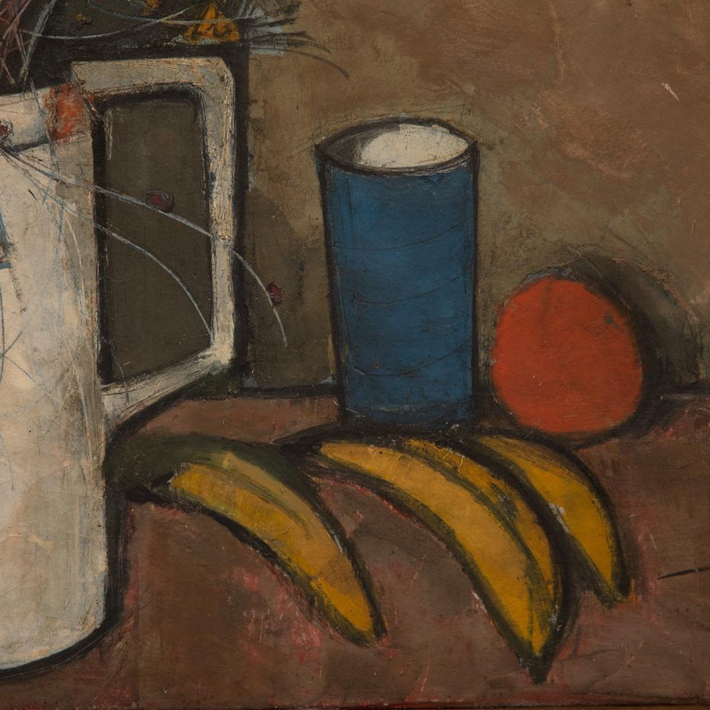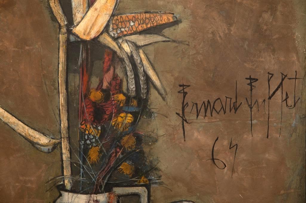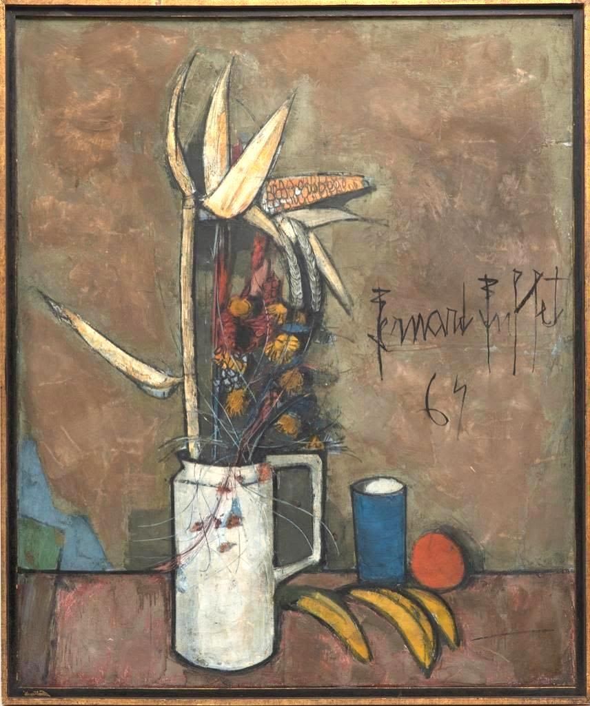 Bernard Buffet Signed Oil on canvas Still Life dated 1967. 30" x 36" In-painting and old repairs evident to lower portion of the painting, Buffet was born in Paris, France, and studied art there at the École Nationale Supérieure des Beaux-Arts (National School of the Fine Arts). Sustained by the picture-dealer Maurice Garnier, Buffet produced religious pieces, landscapes, portraits and Still-lifes. In 1946, he had his first painting shown, a self-portrait, at the Salon des Moins de Trente Ans at the Galerie Beaux-Arts. He had at least one major exhibition every year. In 1955, he was awarded the first prize by the magazine Connaissance des Arts, which named the ten best post-war artists. In 1958, at the age of 30, the first retrospective of his work was held at the Galerie Charpentier. Pierre Bergé was Buffet’s live-in lover until Bergé left Buffet for Yves Saint Laurent. Bernard Buffet was named "Chevalier de la Légion d’Honneur" in 1973.On 23 November 1973, the Bernard Buffet Museum was founded by Kiichiro Okano, in Surugadaira, Japan.