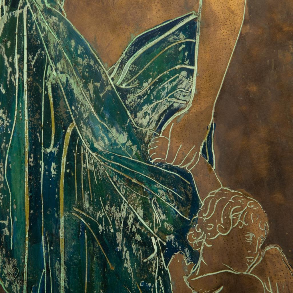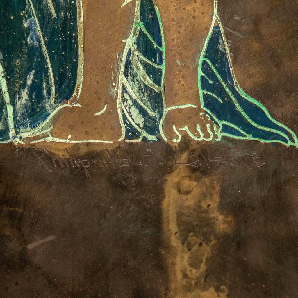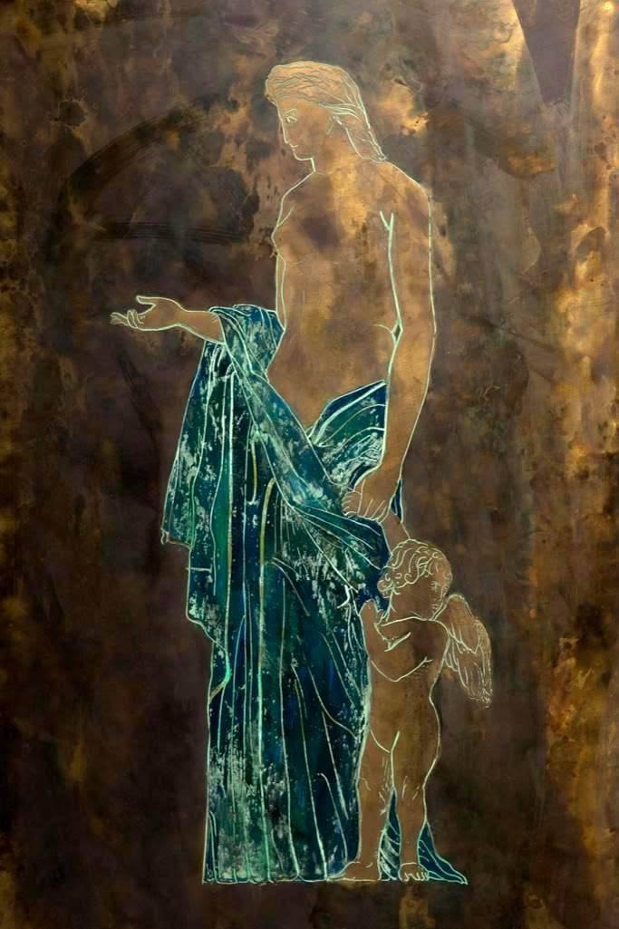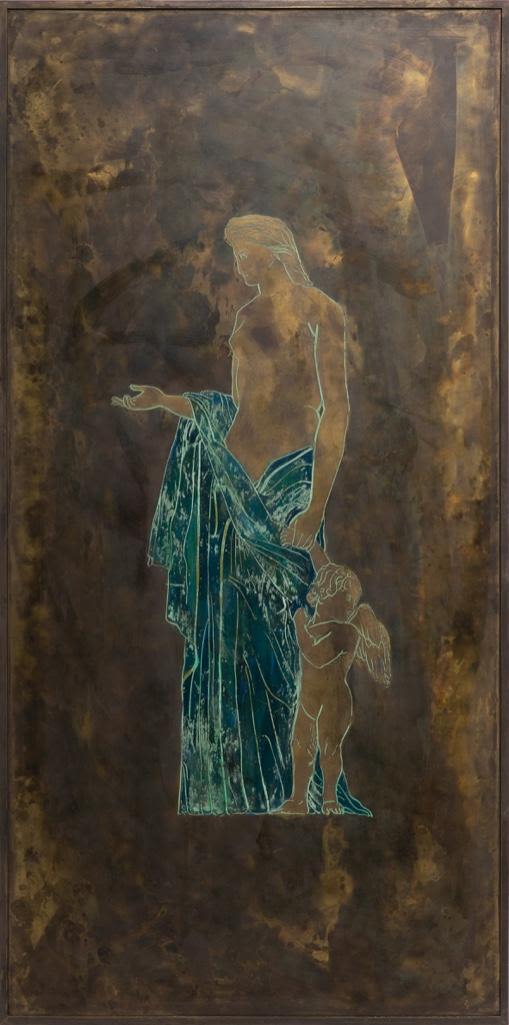 Philip and Kelvin LaVerne mid century modern Signed Classical Inspired Wall Sculpture, sculpture is made of patinated bronze, etched and with hand painted enamels by Philip & Kelvin LaVerne, American, 1960s (signed front bottom right "Kelvin + Philip LaVerne"). Within a bronze frame. This work depicts the partially draped goddess Aphrodite with Cupid. It is impressive in size and its composition is part of a group of works inspired by ancient mythology. it measures 48" x 24" approximate and is in good condition.