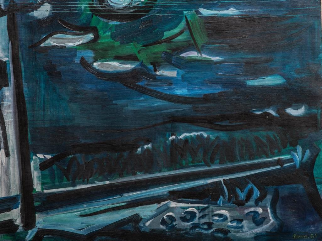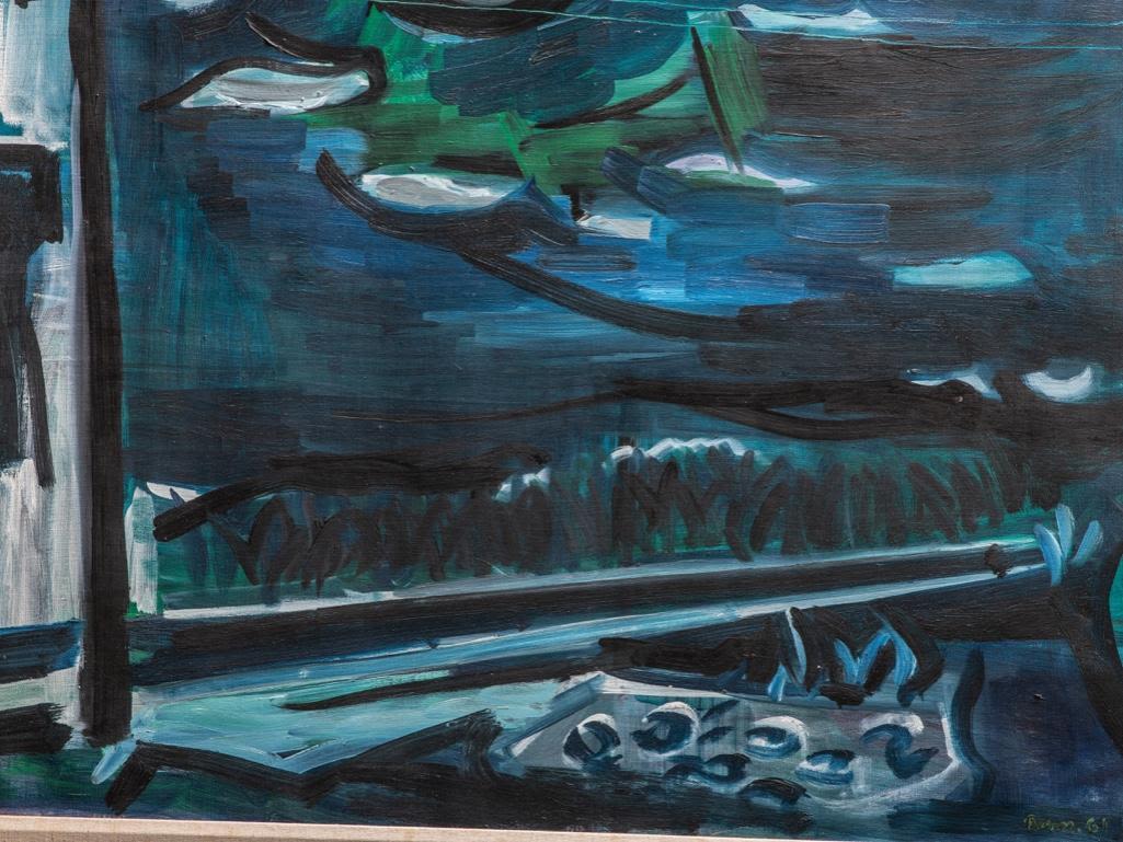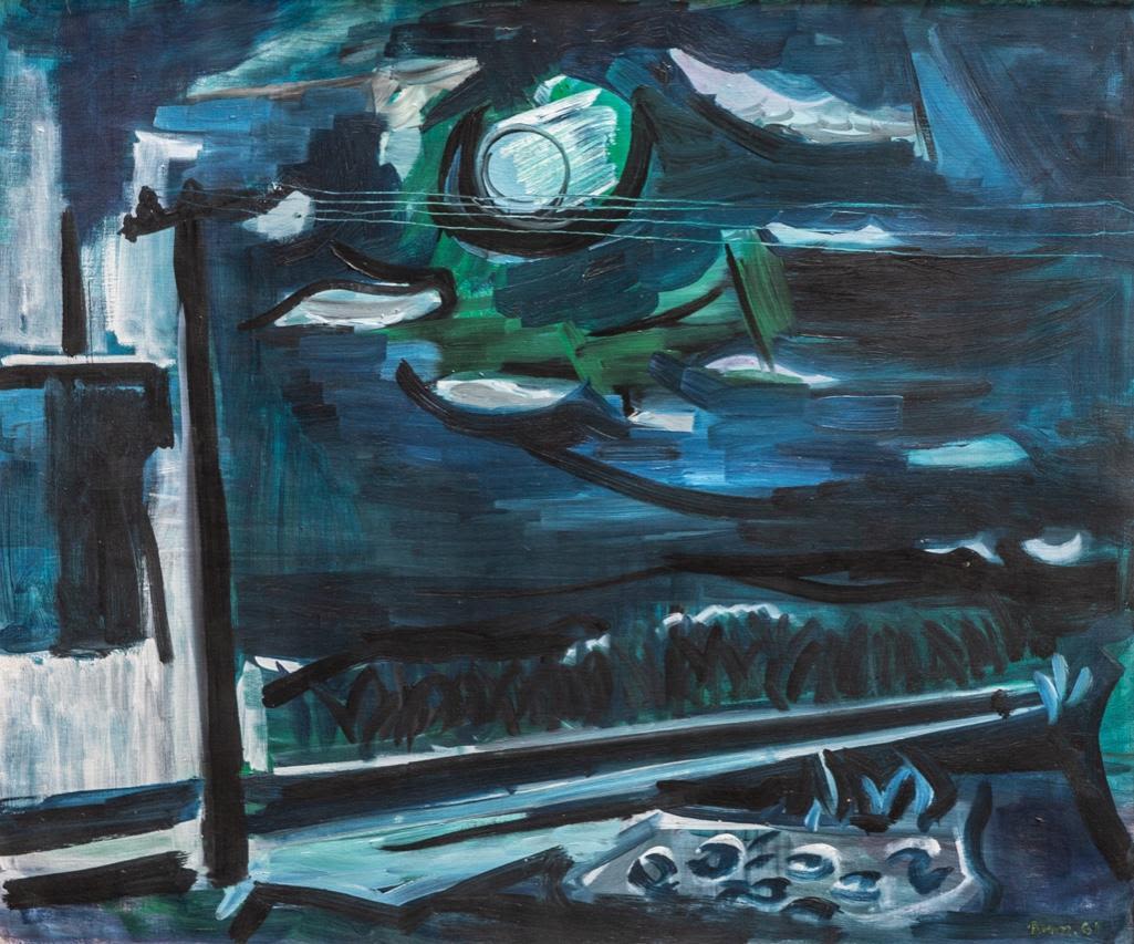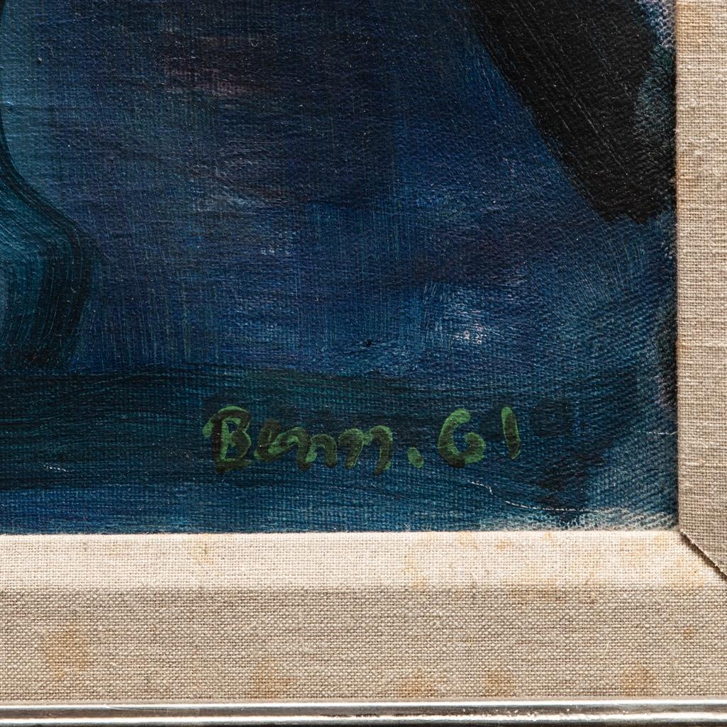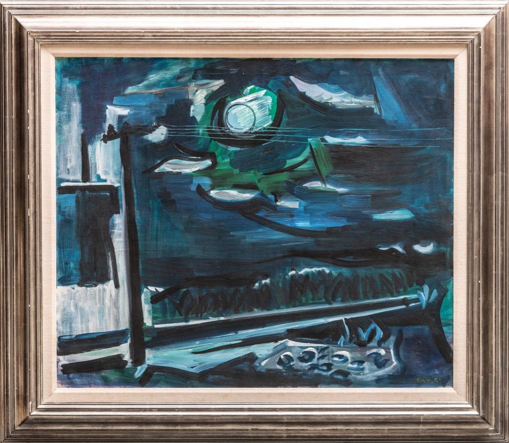 Ben Benn mid century modern signed oil on canvas Moon at Sag Harbor New York, 1961. Benn Benn was a pioneer American modernist whose independent style defied stylistic classification. Despite excursions into Cubism and Abstract Expressionism, Benn “seems always to have been a ‘subject’ painter. Considering this, it is remarkable that he remained visible at all during the 50’s and early 60’s, when prejudice against the representational amounted nearly to a proscription of it.”Benn’s prominence in the art world over 6 decades was reaffirmed at a 90th birthday show at the Hirshhorn Museum in Washington, D.C. in 1974. Benn had many solo exhibitions during his lifetime, including one at the Jewish Museum in 1965. His works are in many museums, including the Metropolitan Museum of Art, Whitney, and Hirshhorn Museum. 46" x 40"