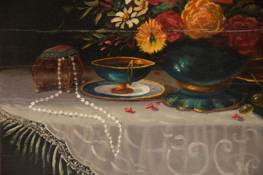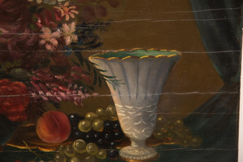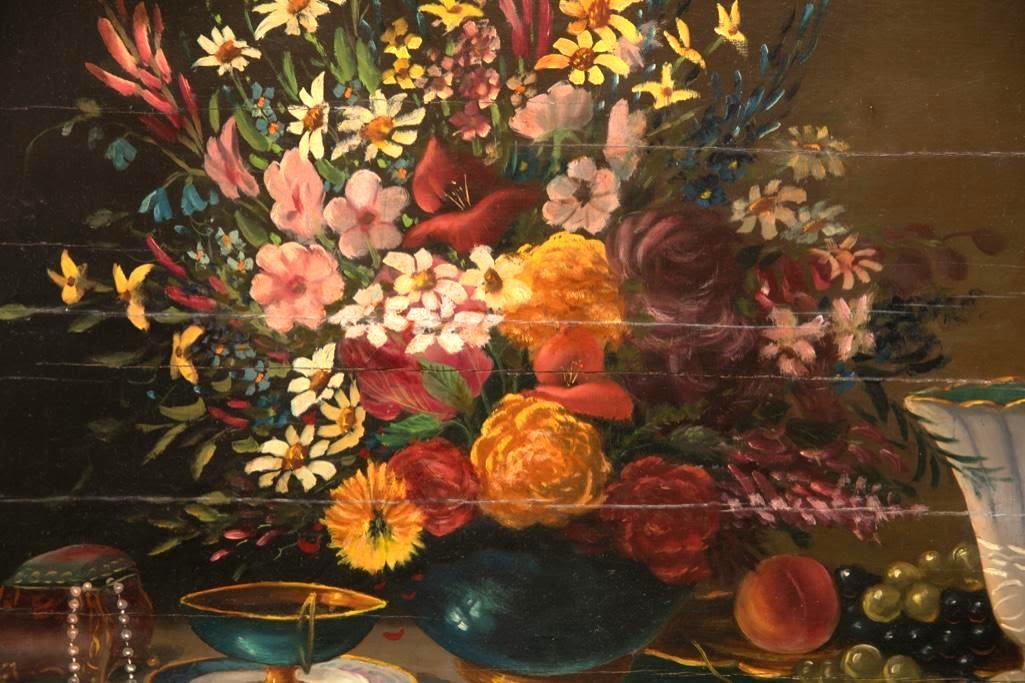 Antique still life oil painting on wood panel supported by cradle, late 18th or early 19th century approx 23" x 28"