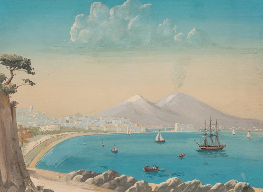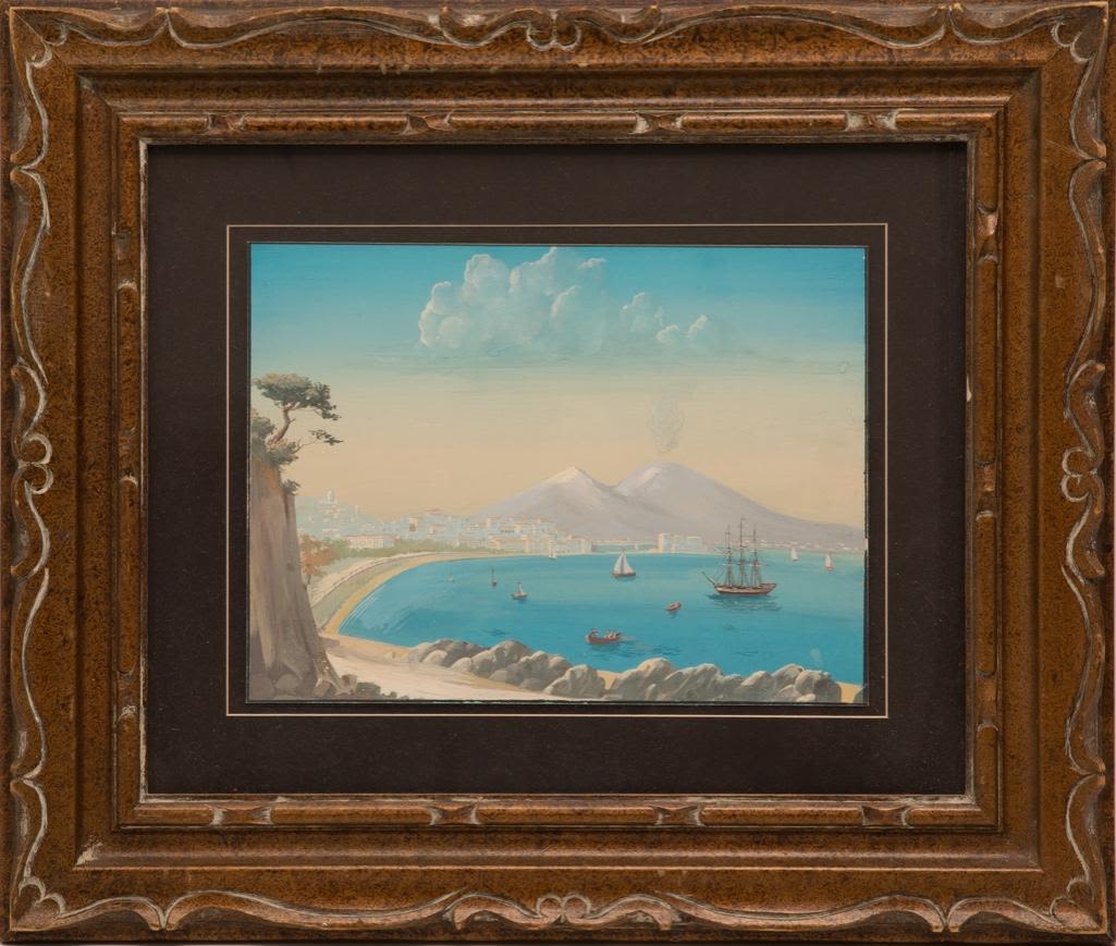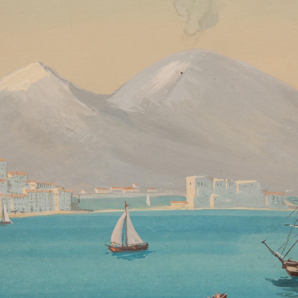 Italian 19th century watercolor of Naples harbor and Mt Vesuvius erupting. 25.5 x 21.75 Framed 10 x 14" visible art