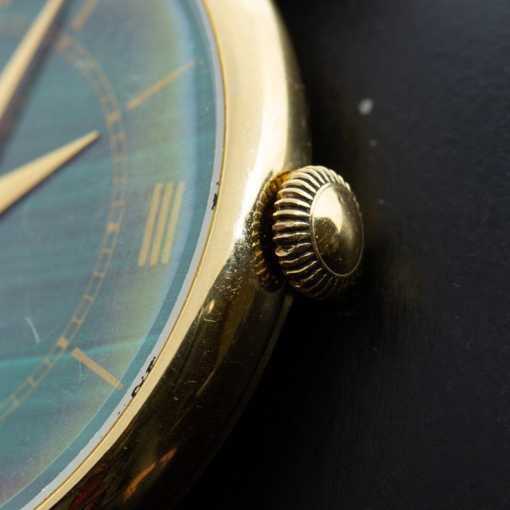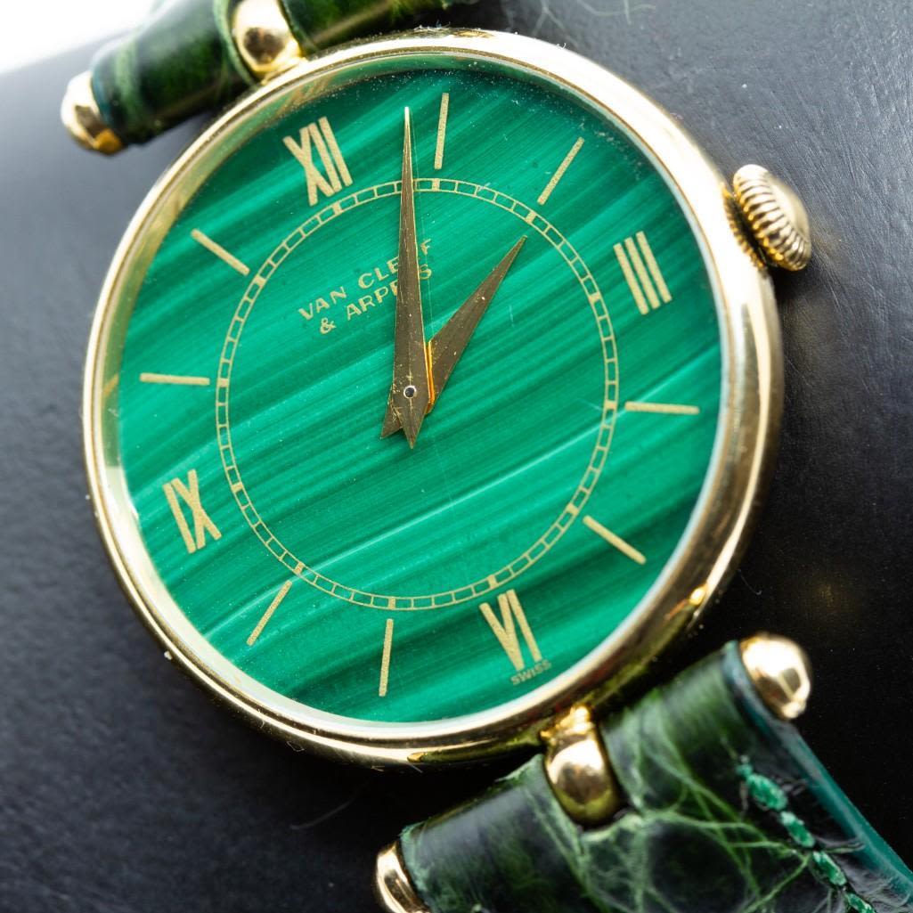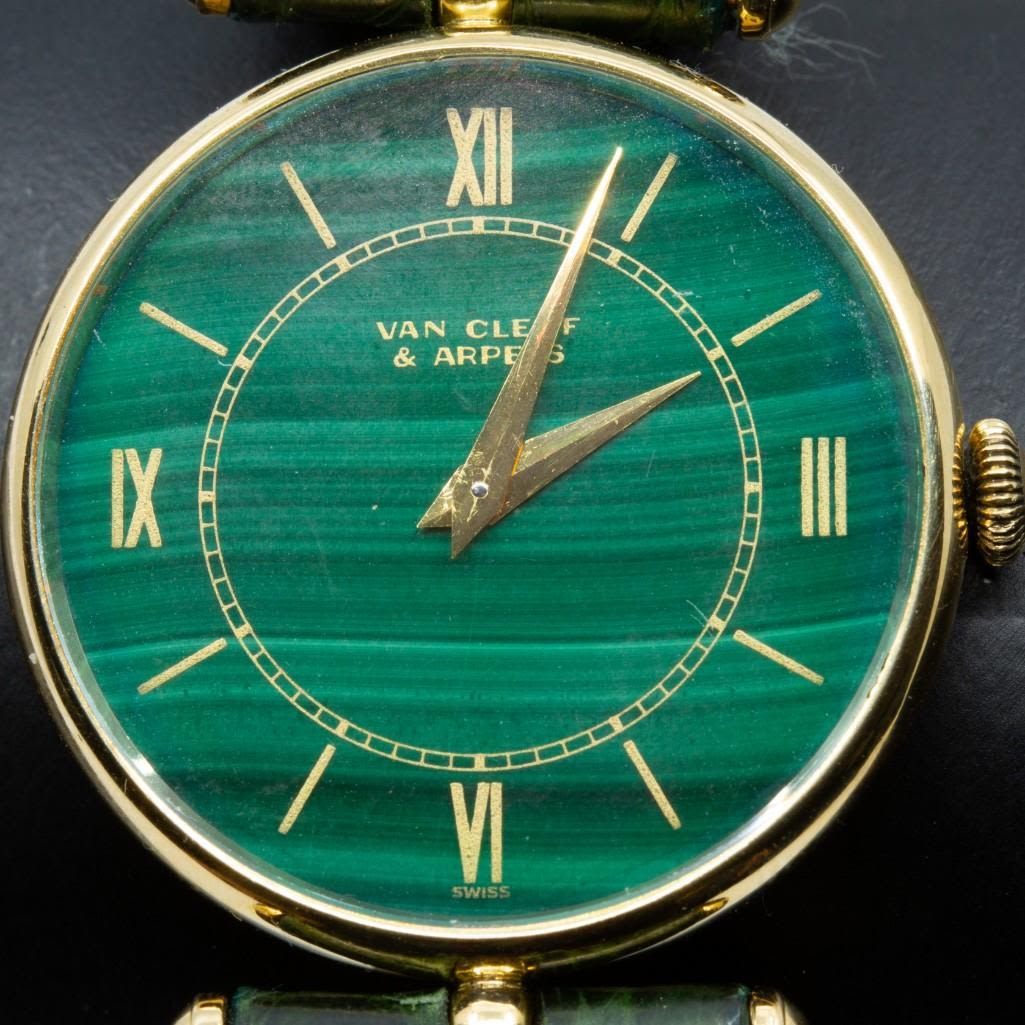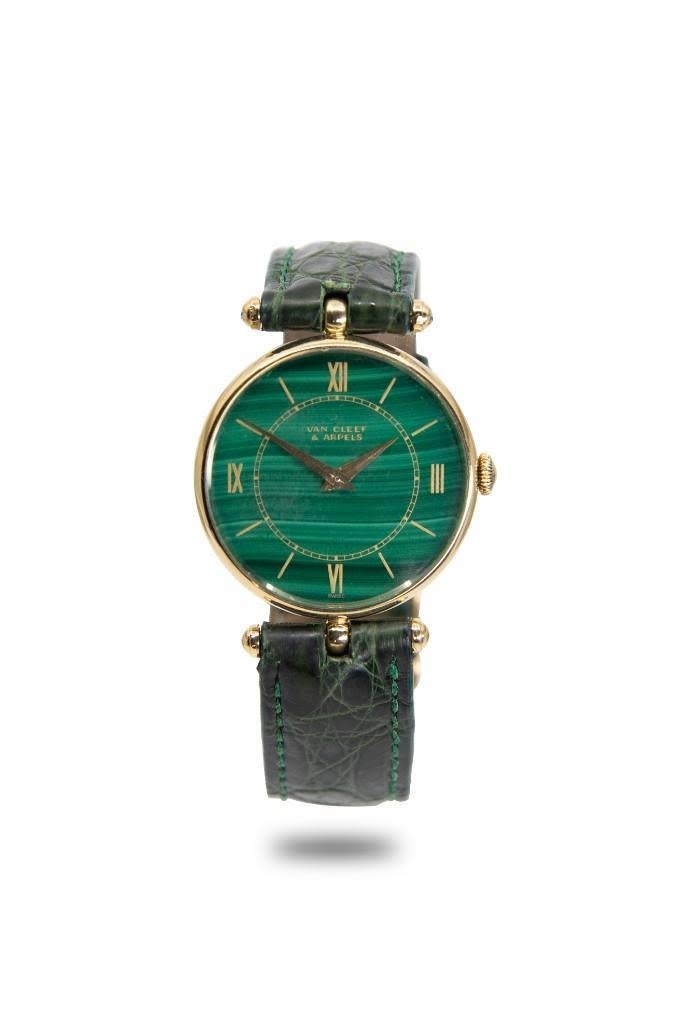 Van Cleef & Arpels 18K Yellow Gold Wristwatch With Malachite Dial. Offered is a authentic 18K gold Van Cleef and Arpels 17 jewel stem wind wristwatch. The watch has a Genuine Crocodile Band 16R Made in USA. The watch is signed on the face and on the movement it is signed Van Cleef & Arpels 895 Stem wind 2305232 17 jewels. The watch is in good condition and was running at the time of inspection. In 1896, Esther Arpels, the daughter of Salomon Arpels, a dealer in precious stones, married Alfred Van Cleef, whose family were sheet merchants living in the 19th arrondissement of Paris. That same year, Alfred Van Cleef and Salomon Arpels had already established a company with the aim of “founding and running a jewellery business”. In 1906, they registered the “Van Cleef & Arpels” trademark and opened a boutique at 22 place Vendôme. From 1909 to 1939, Van Cleef & Arpels prospered and opened boutiques in holiday resorts such as Deauville, Le Touquet, Nice and Monte-Carlo.. In 1942, the Arpels family emigrated to America and opened their first boutique in New York, on 5th Avenue. Later, Van Cleef & Arpels became the first French jewellers to open boutiques in Japan and China. Over the years, the firm was always managed by a descendant of the Arpels family, The company’s prestige stems from a long list of prominent commissions issued by royal and imperial courts, financiers and industrial magnates, which have enabled Van Cleef & Arpels to be active today not only in Europe and the United States, but also in Asia and the Middle East. Please note the gallery does not warranty the running condition of watches. Probably needs servicing.
