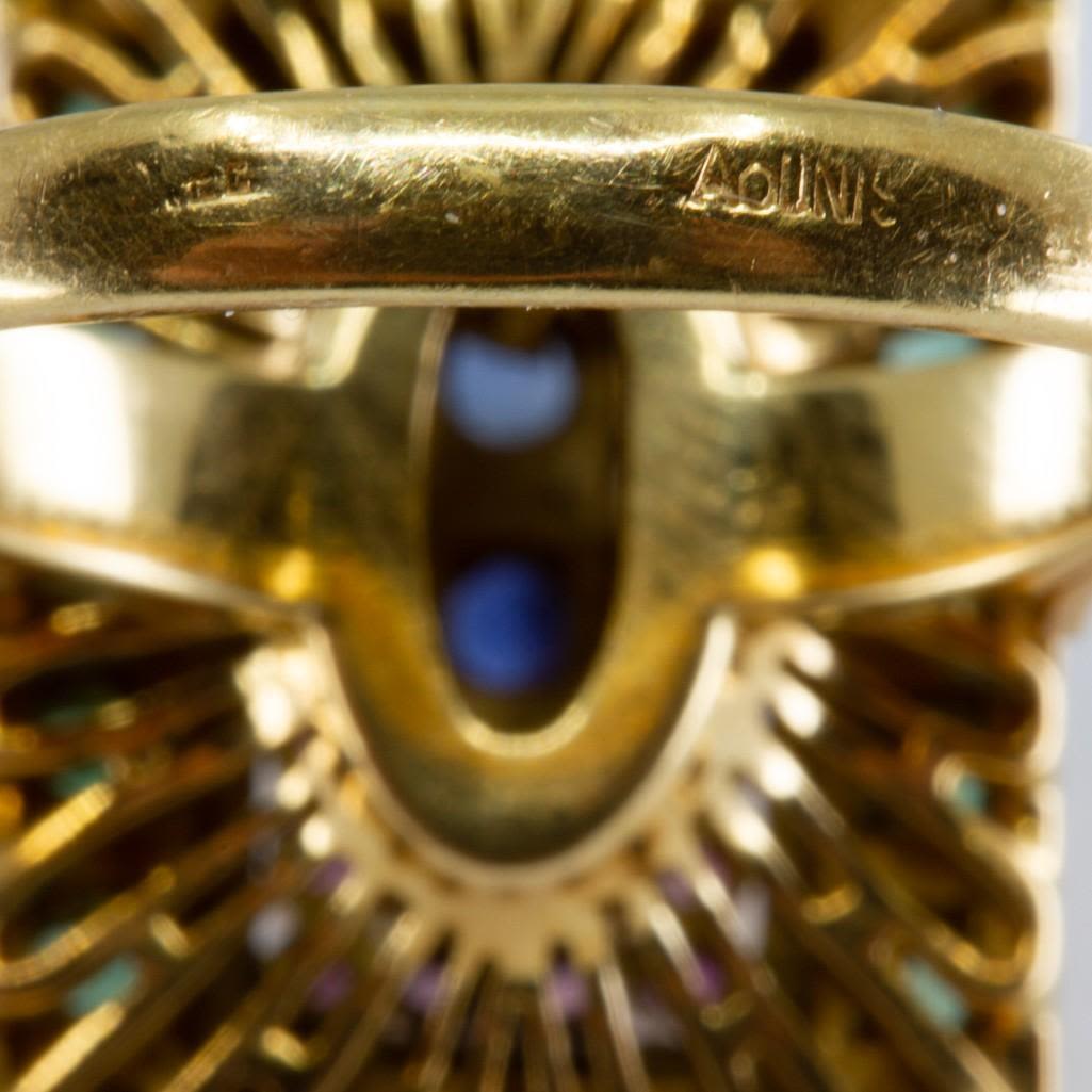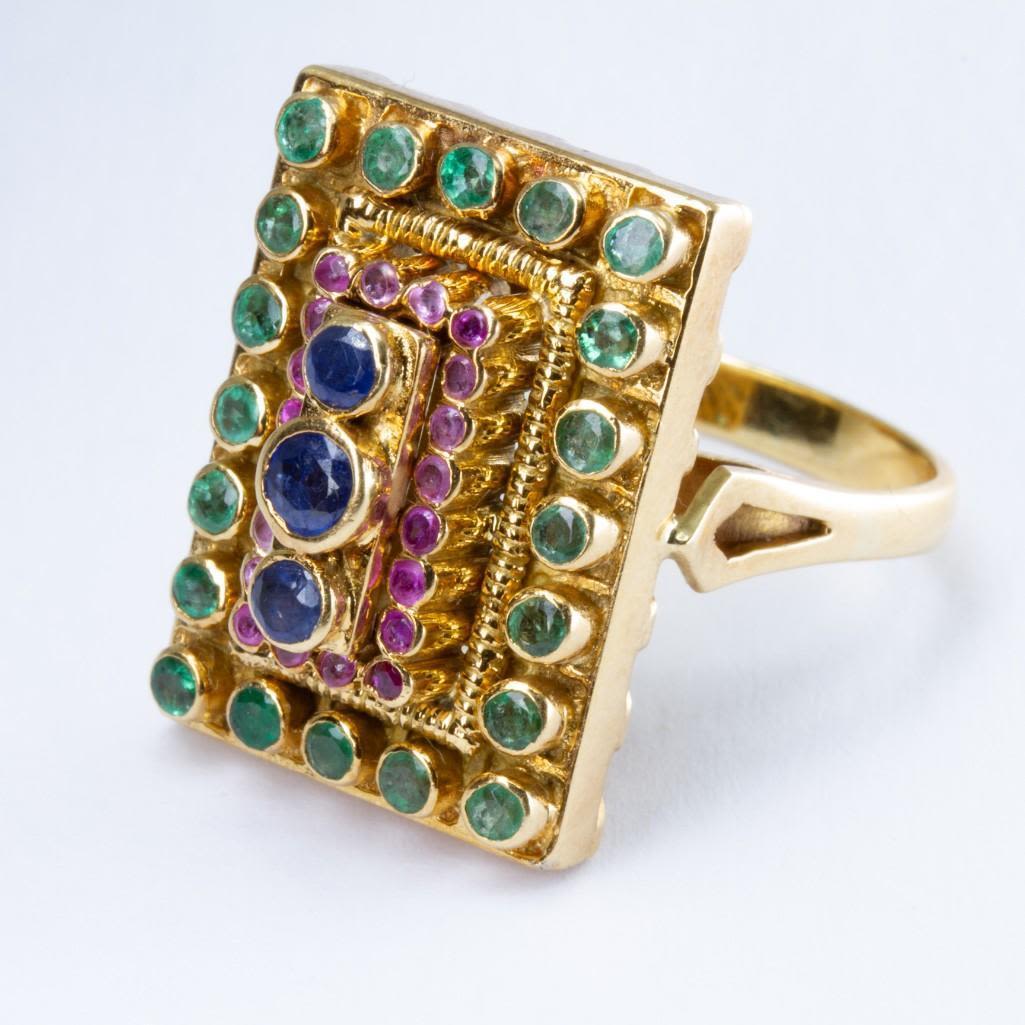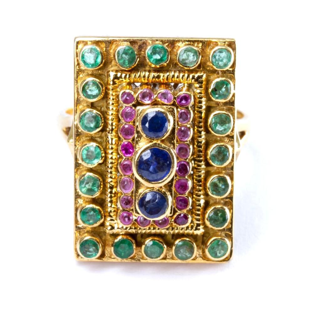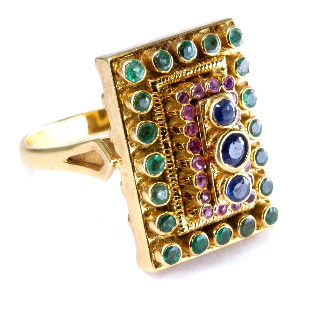 Ilias Lalaounis 18k Gold, Sapphire, Ruby and Emerald Ring, signed and marked ‘750’. Size 8, 9.4 dwts