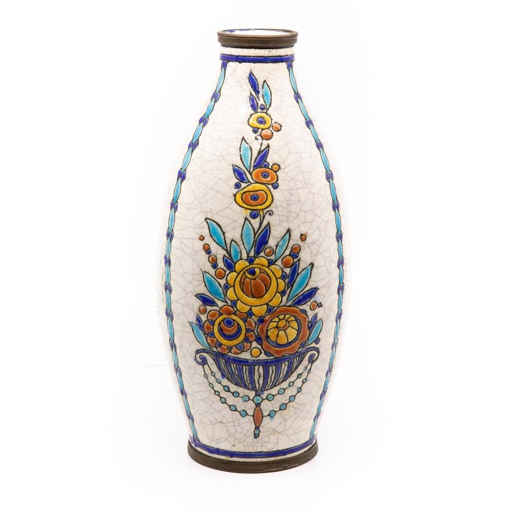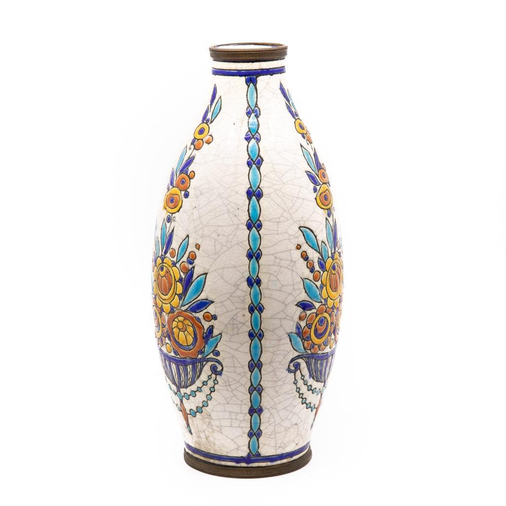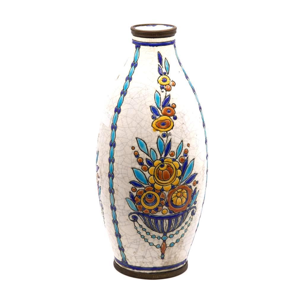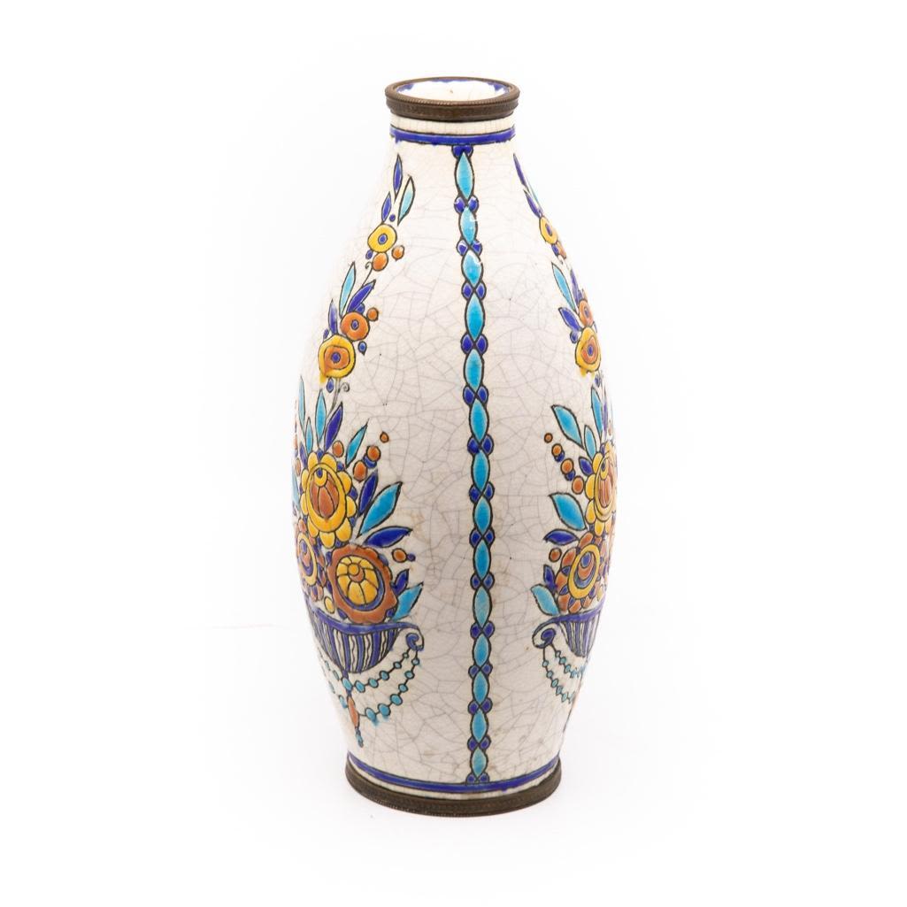 Boch Freres Keramis Catteau raised floral design, craquelure Circa 1925. 11"