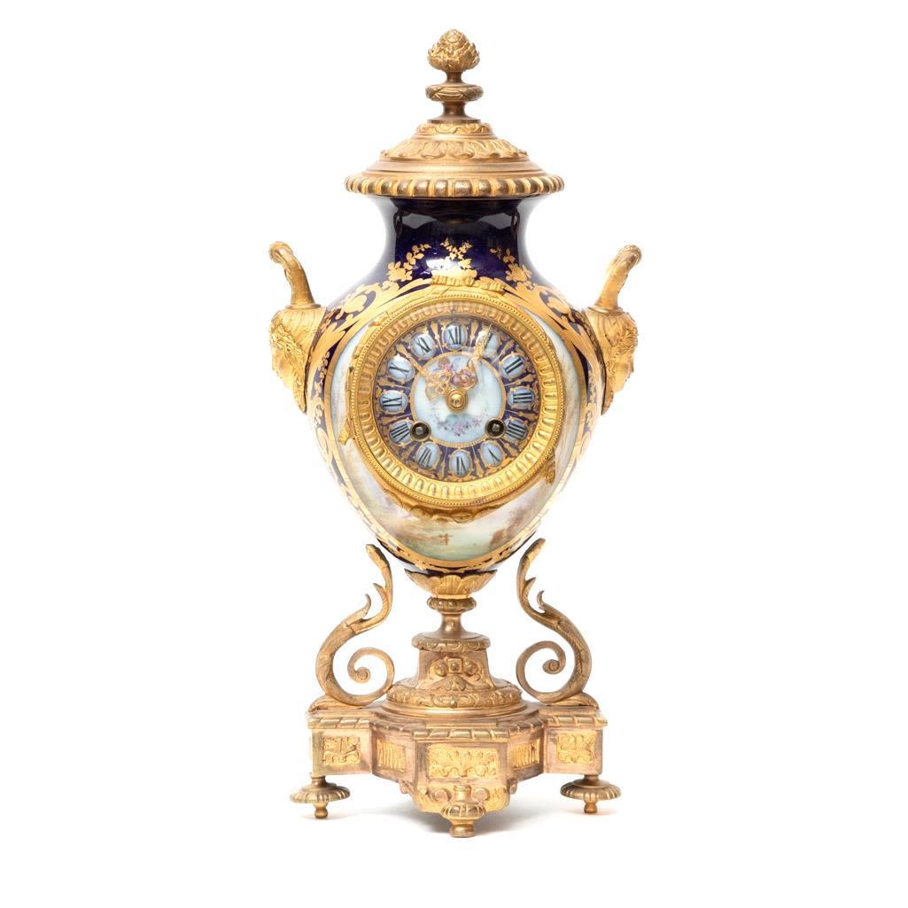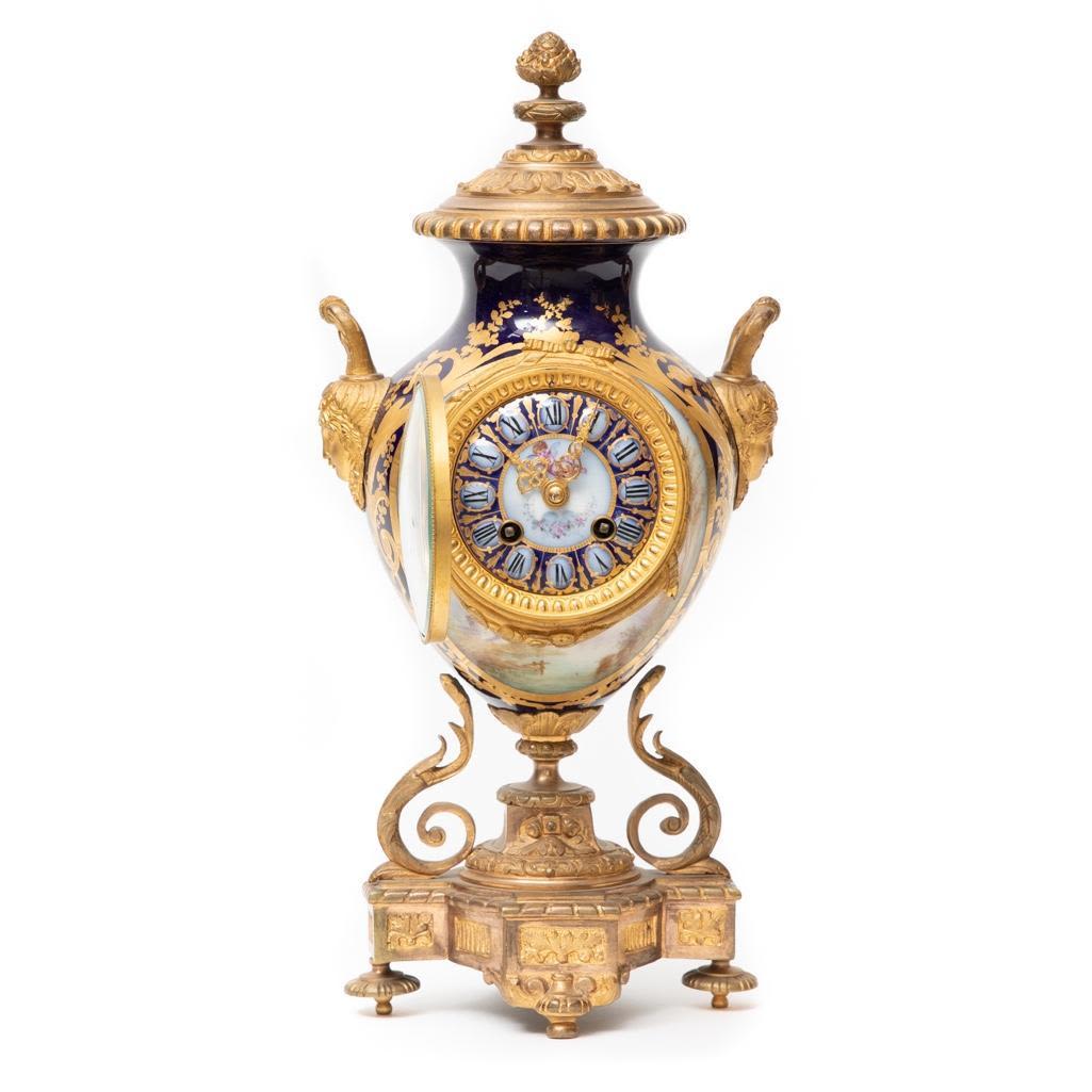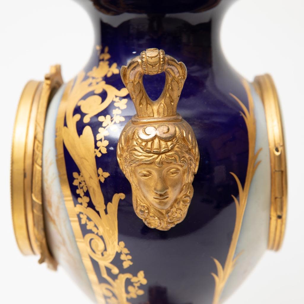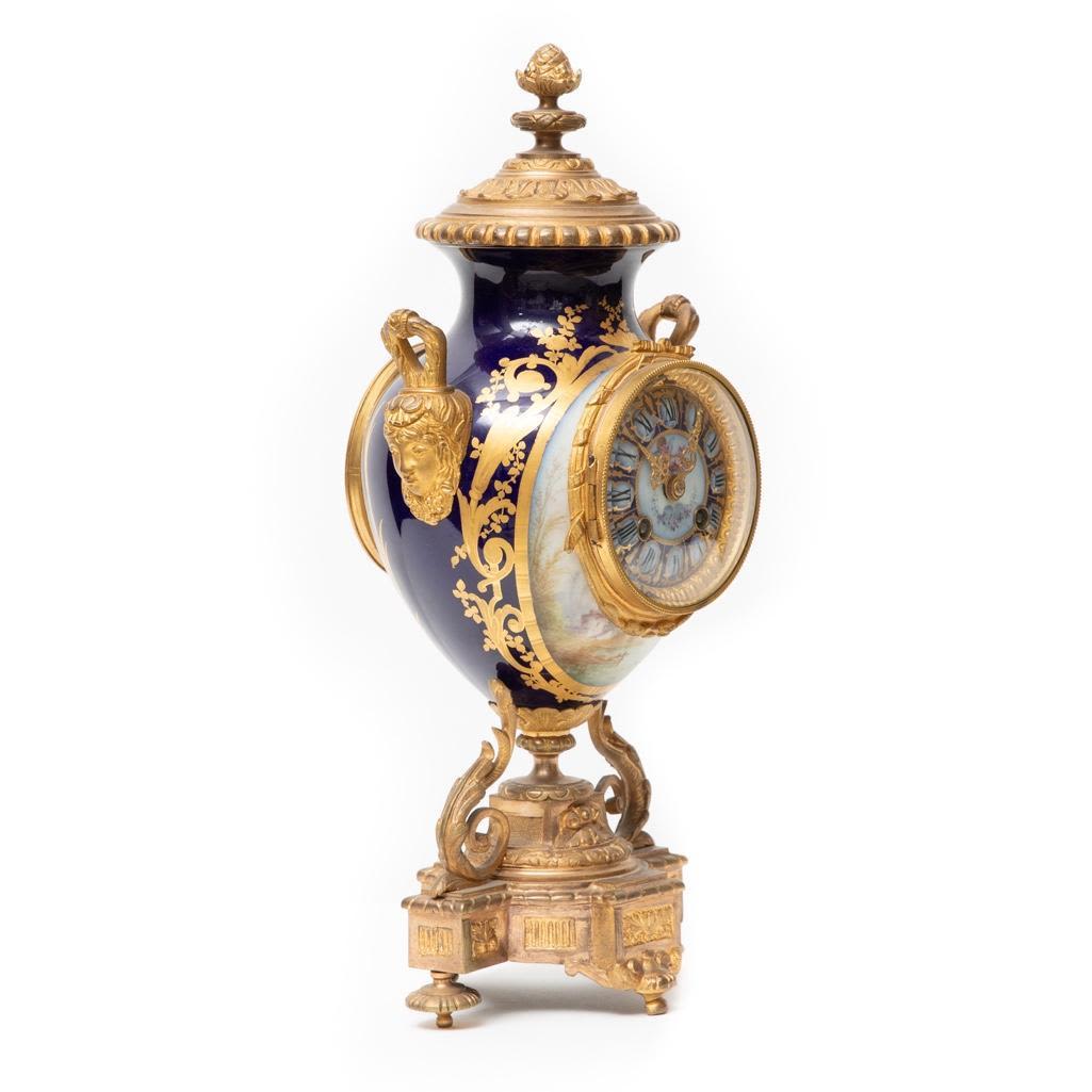 Sevres French porcelain and gilt bronze urn-form mantel clock, cobalt and gilt dial with Roman numerals and hand-painted cherub, masque handles at sides, movement stamped: "AG Mougin." 16" H x 7.5" W. Minor scratching to dial.