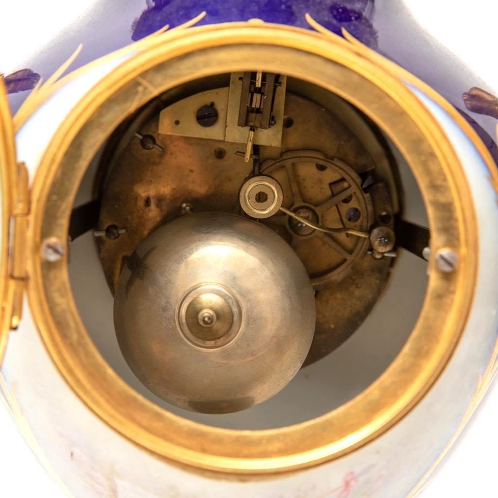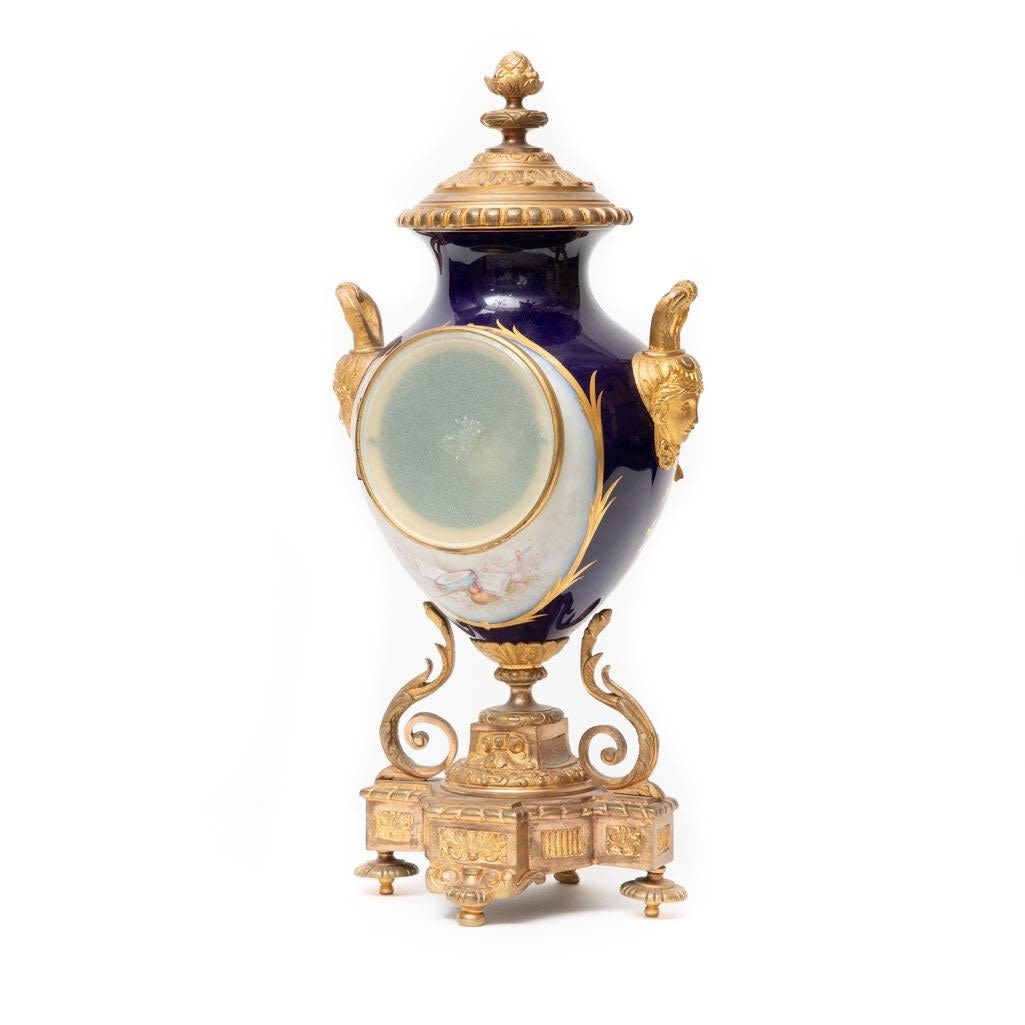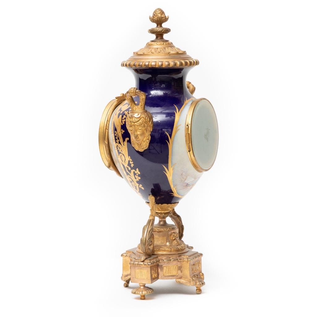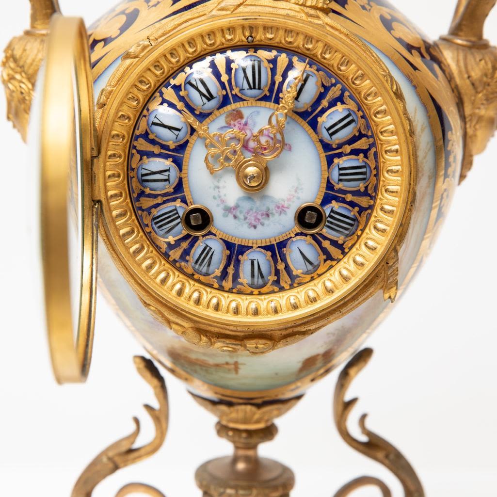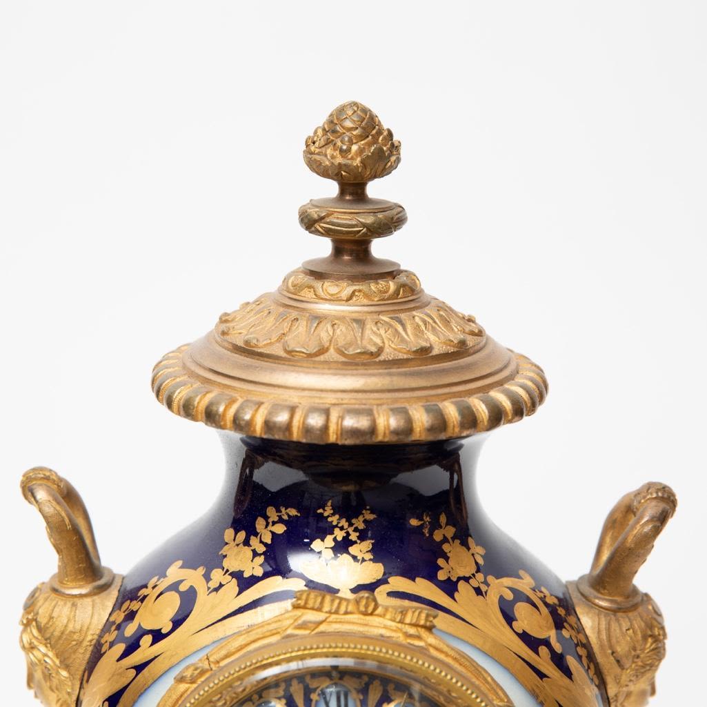 Sevres French porcelain and gilt bronze urn-form mantel clock, cobalt and gilt dial with Roman numerals and hand-painted cherub, masque handles at sides, movement stamped: "AG Mougin." 16" H x 7.5" W. Minor scratching to dial.