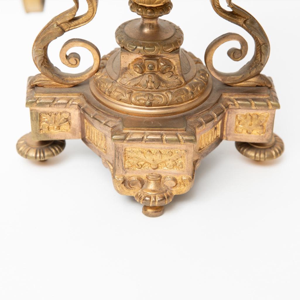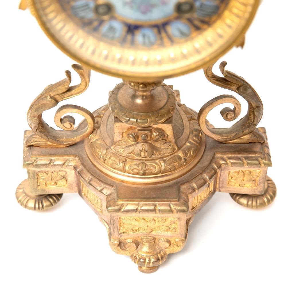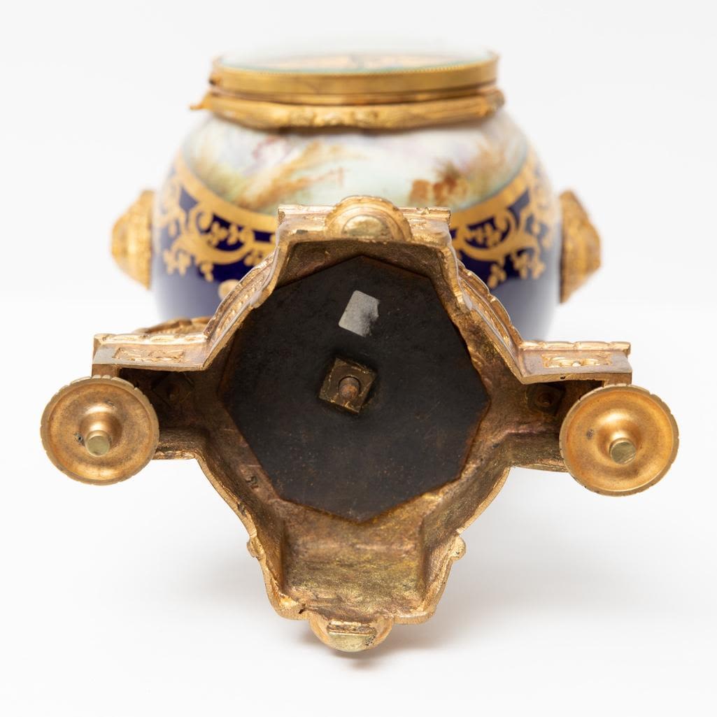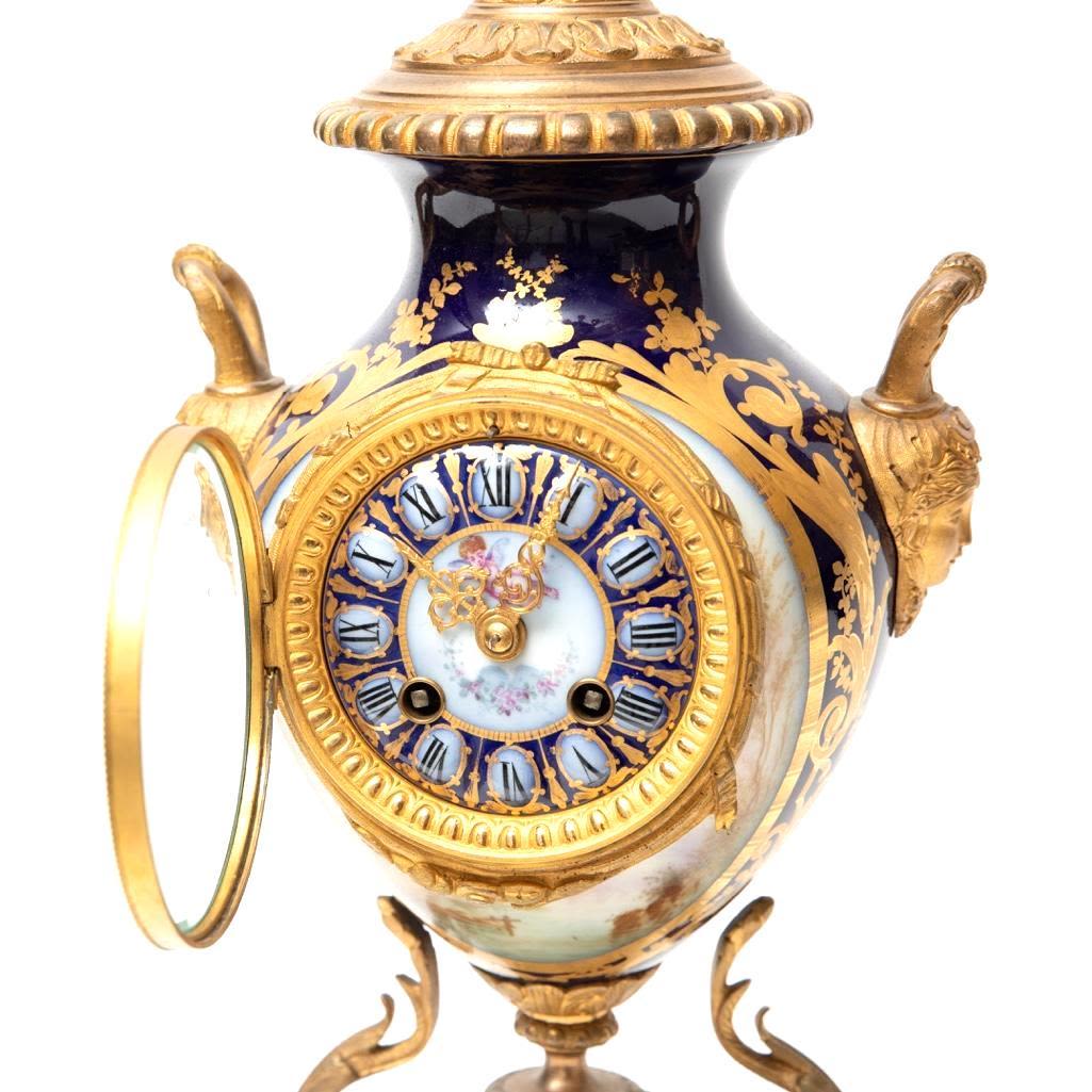 Sevres French porcelain and gilt bronze urn-form mantel clock, cobalt and gilt dial with Roman numerals and hand-painted cherub, masque handles at sides, movement stamped: "AG Mougin." 16" H x 7.5" W. Minor scratching to dial.
