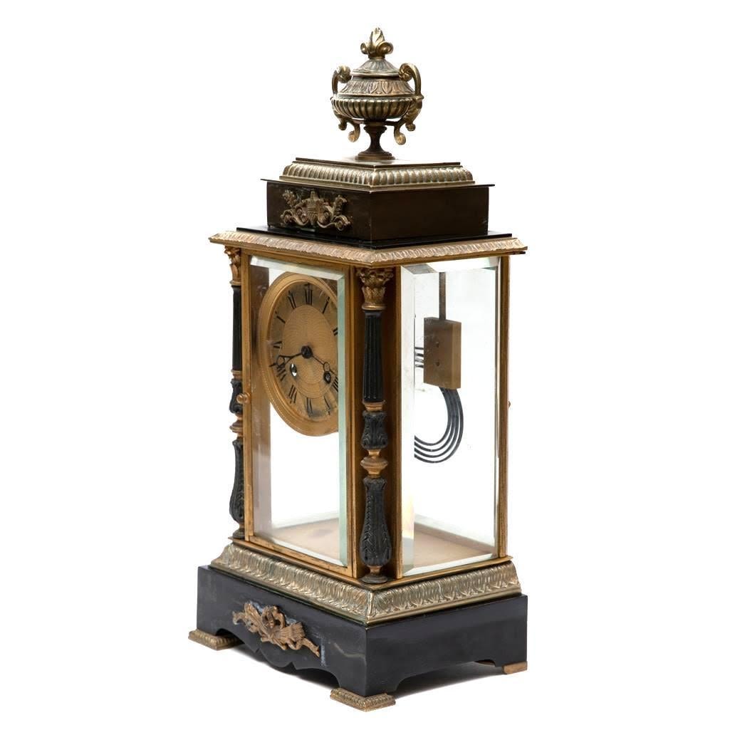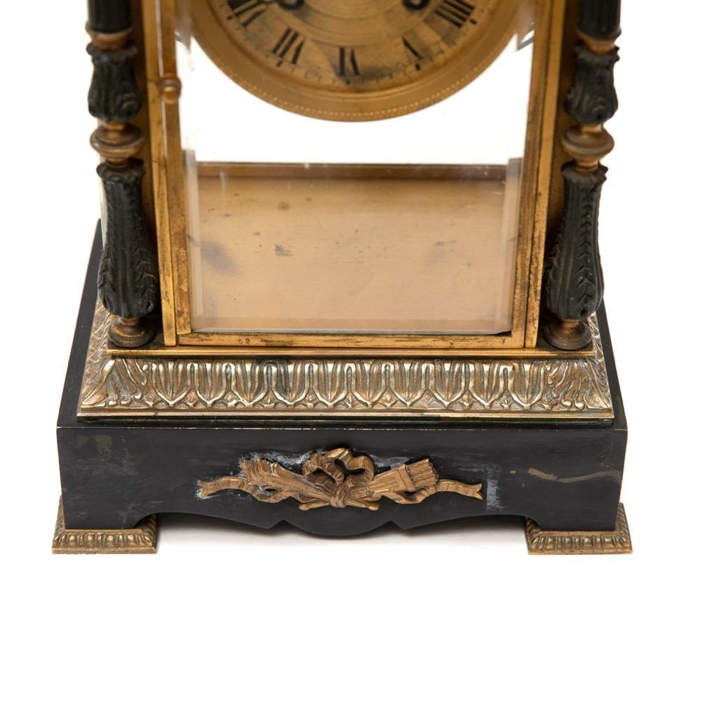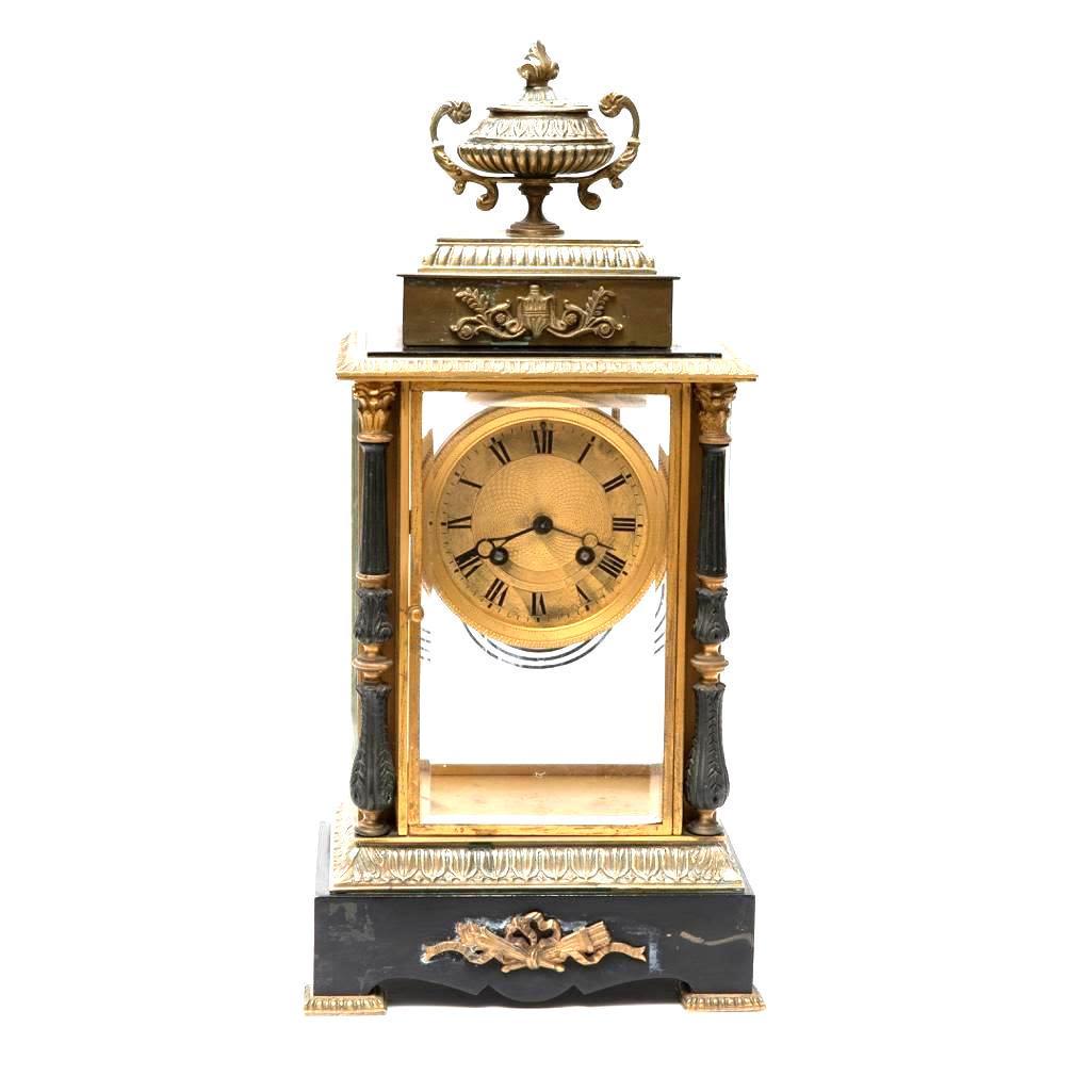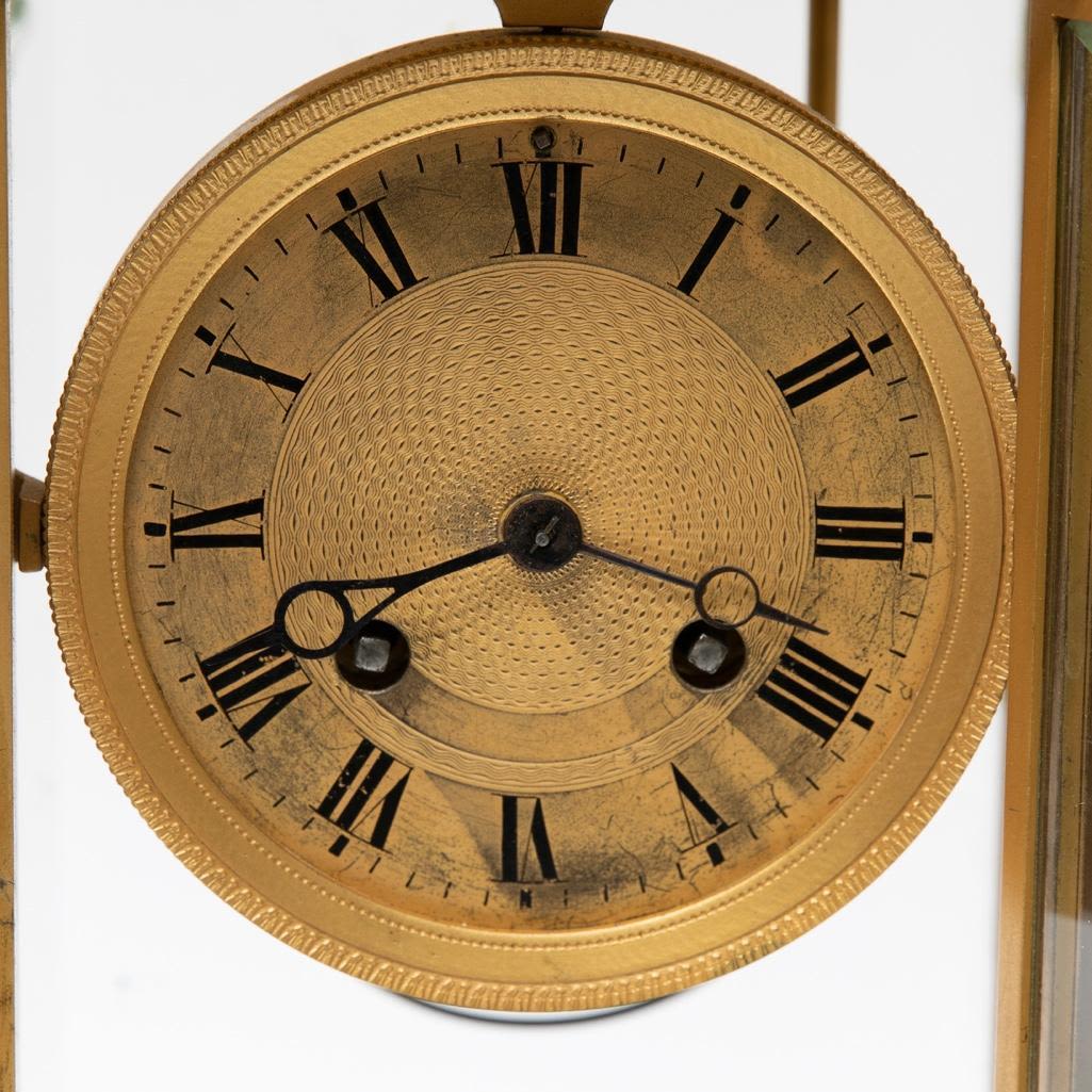 Medaille D’Argent French Neoclassical brass and glass mantel clock, urn-form finial over glass panel case with front door flanked by Corinthian columns, engine turned dial with Roman numerals, movement stamped: "Medaille D’Argent 1889." 16.75" H x 7.75" W x 5.5" D.