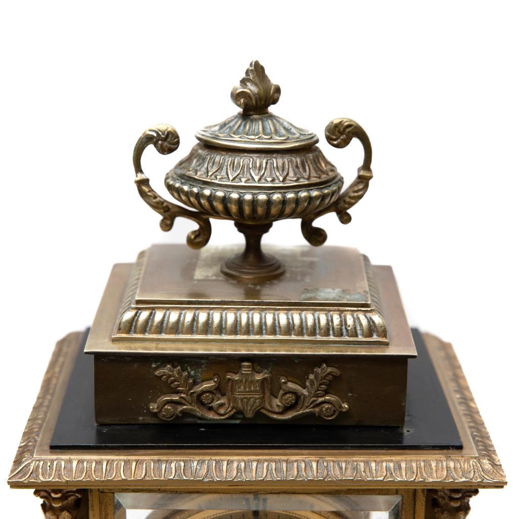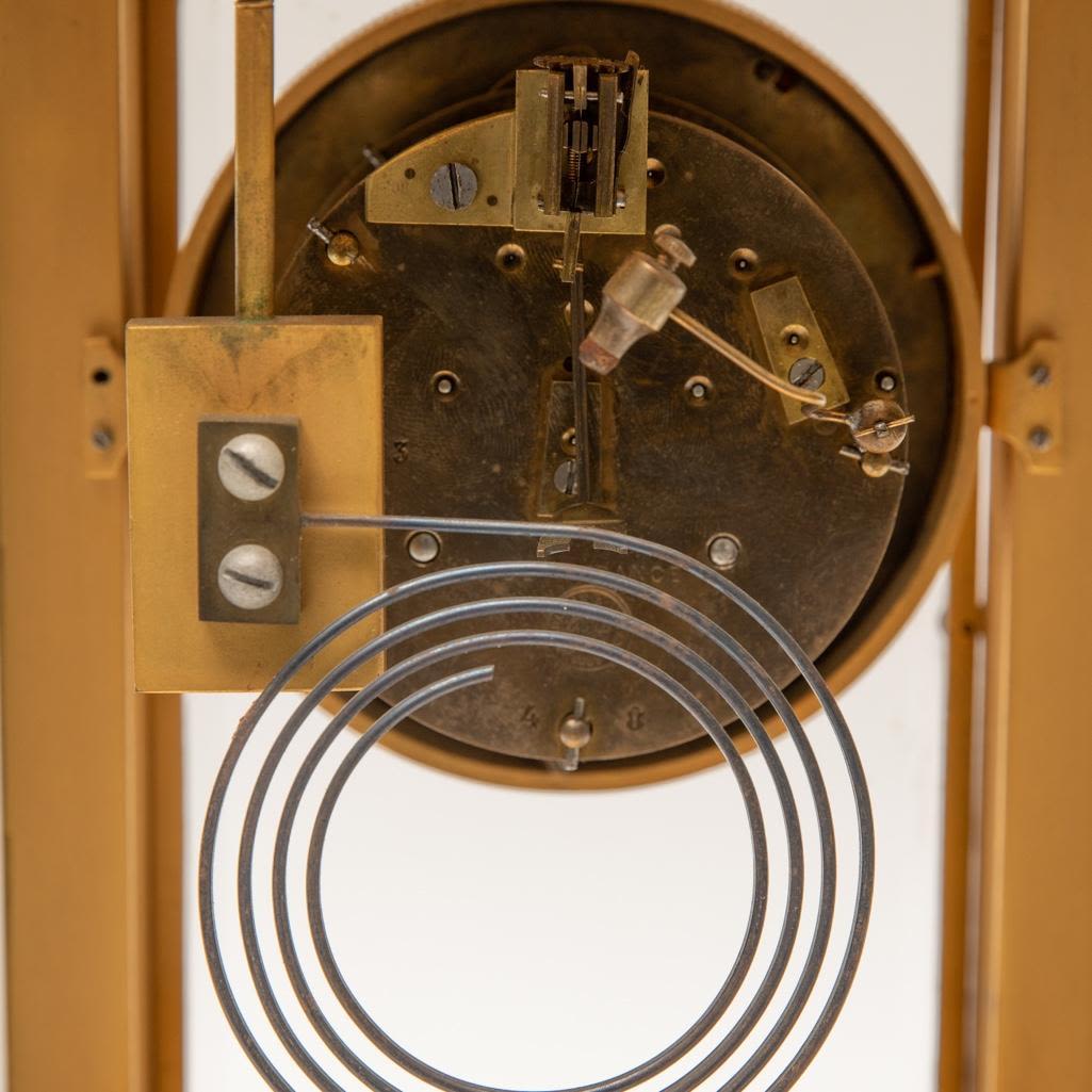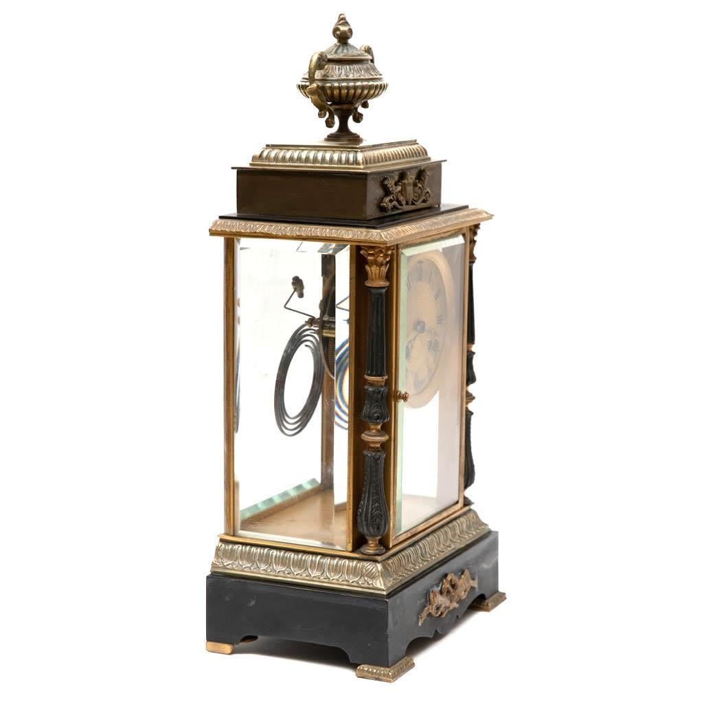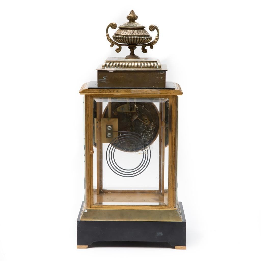 Medaille D’Argent French Neoclassical brass and glass mantel clock, urn-form finial over glass panel case with front door flanked by Corinthian columns, engine turned dial with Roman numerals, movement stamped: "Medaille D’Argent 1889." 16.75" H x 7.75" W x 5.5" D.