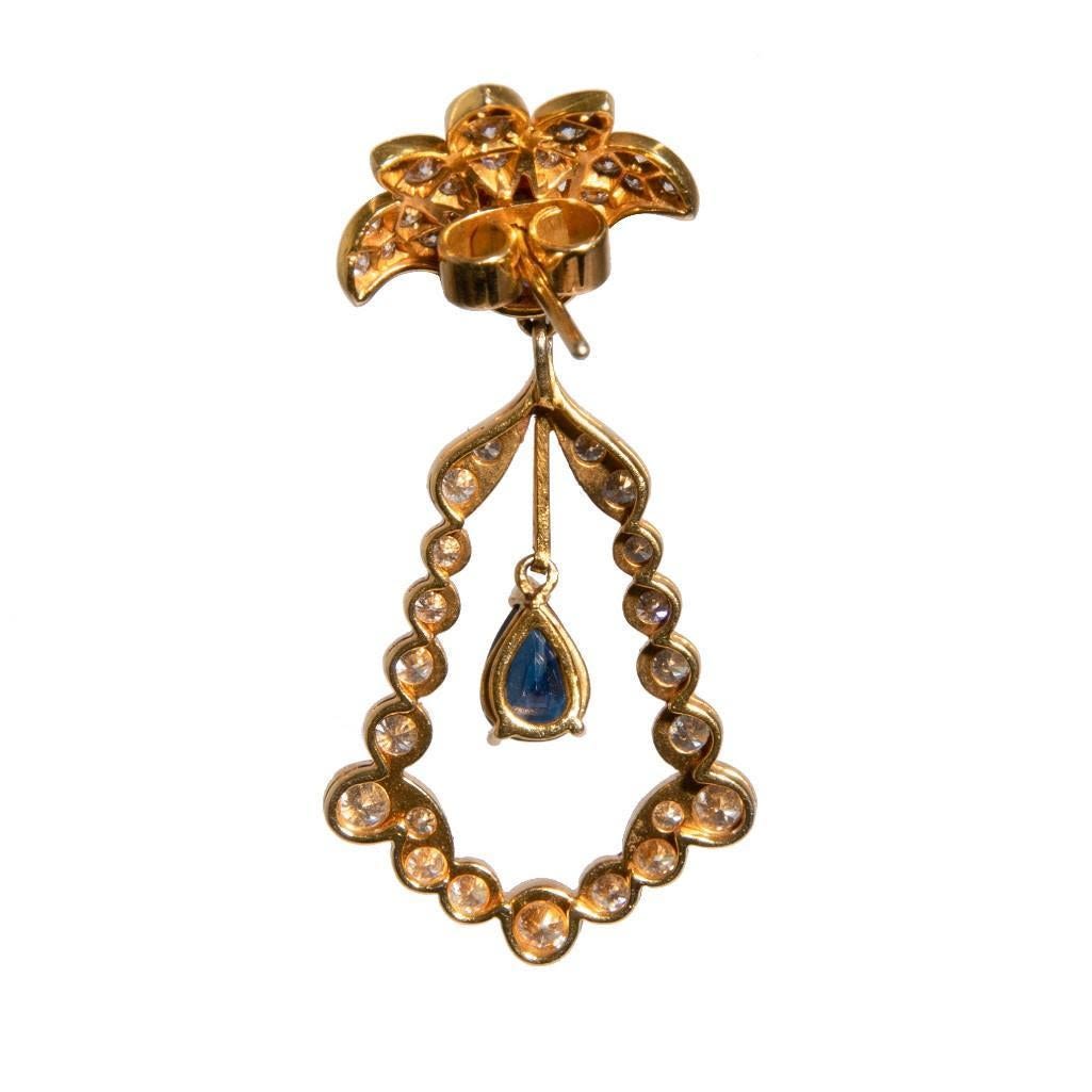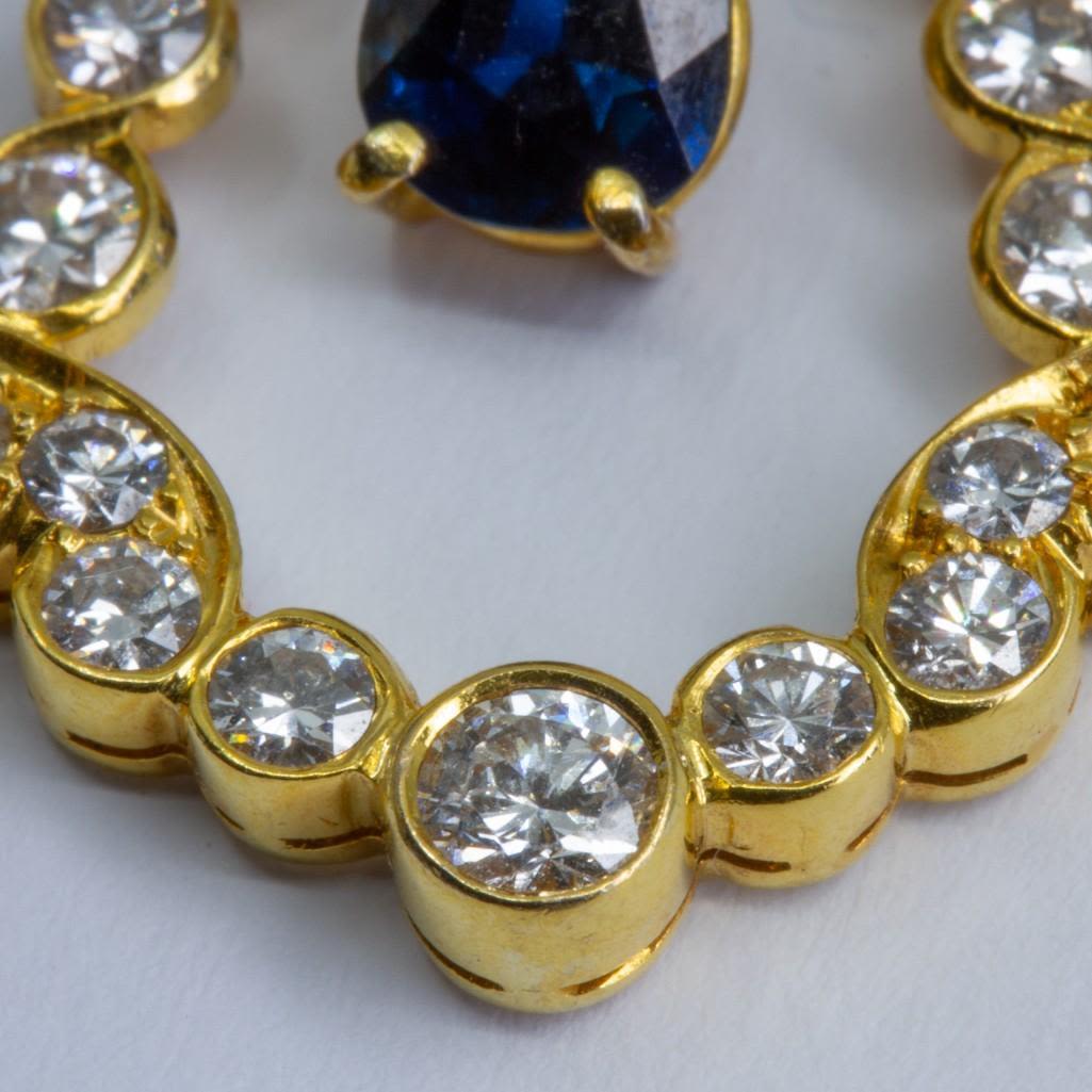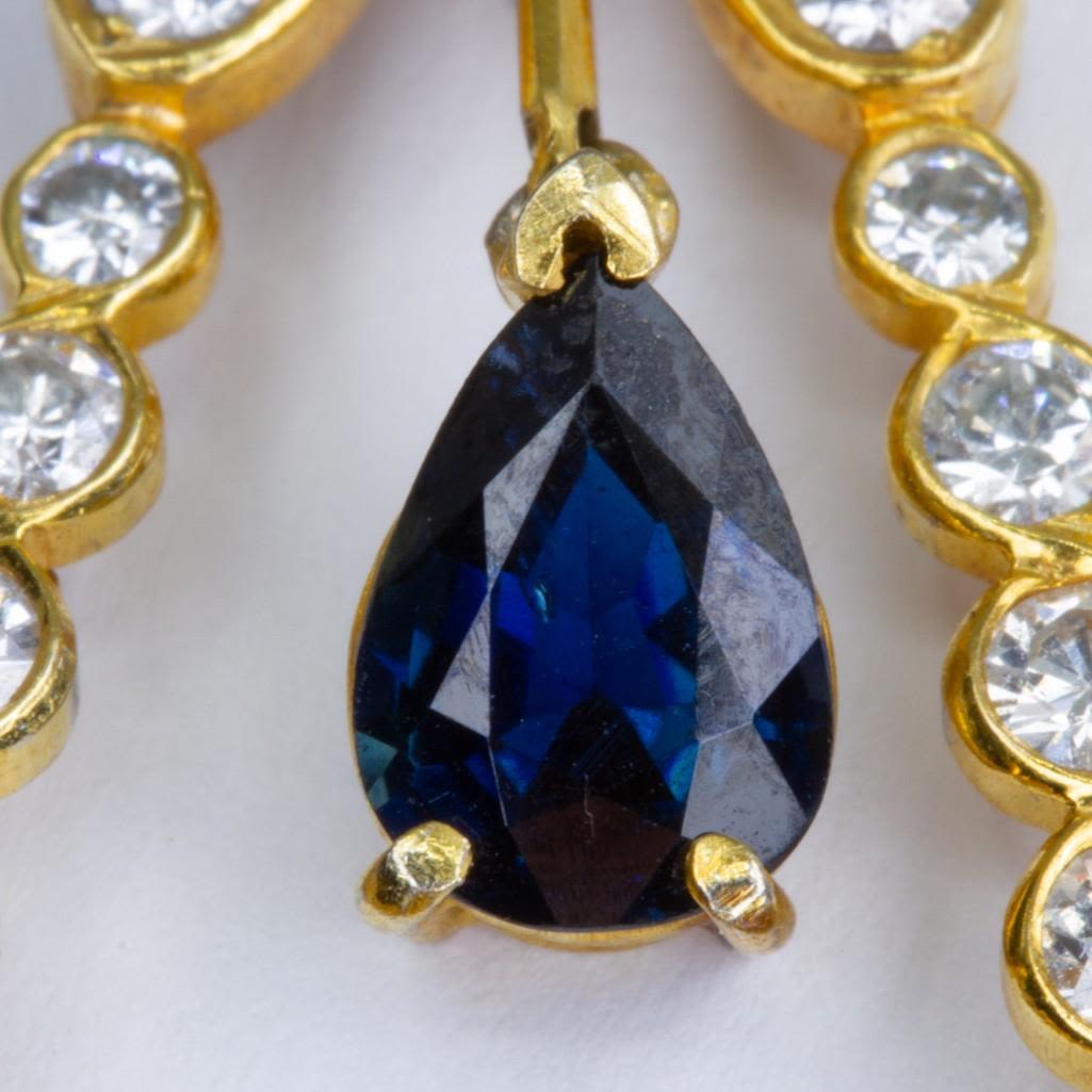 Yellow Gold, Sapphire and Diamond pair of earrings containing two pear shape mixed cut sapphires measuring approximately 7.00 x 5.20 x 3.10 mm, two round sapphires and 90 round brilliant cut diamonds weighing approximately 4.95 carats total. Total weight 7.5dwt. This lot is accompanied by a GIA appraiser letter from an independent and well respected firm established over 75 years ago.