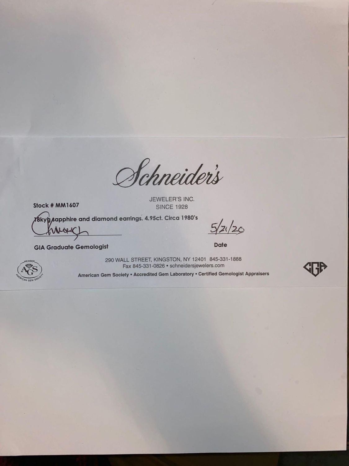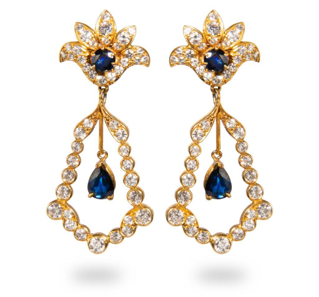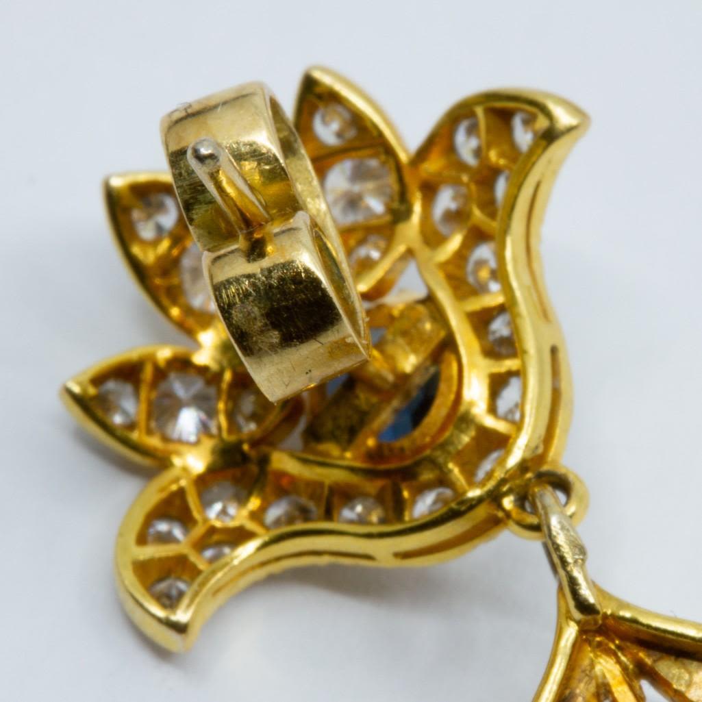 Yellow Gold, Sapphire and Diamond pair of earrings containing two pear shape mixed cut sapphires measuring approximately 7.00 x 5.20 x 3.10 mm, two round sapphires and 90 round brilliant cut diamonds weighing approximately 4.95 carats total. Total weight 7.5dwt. This lot is accompanied by a GIA appraiser letter from an independent and well respected firm established over 75 years ago.