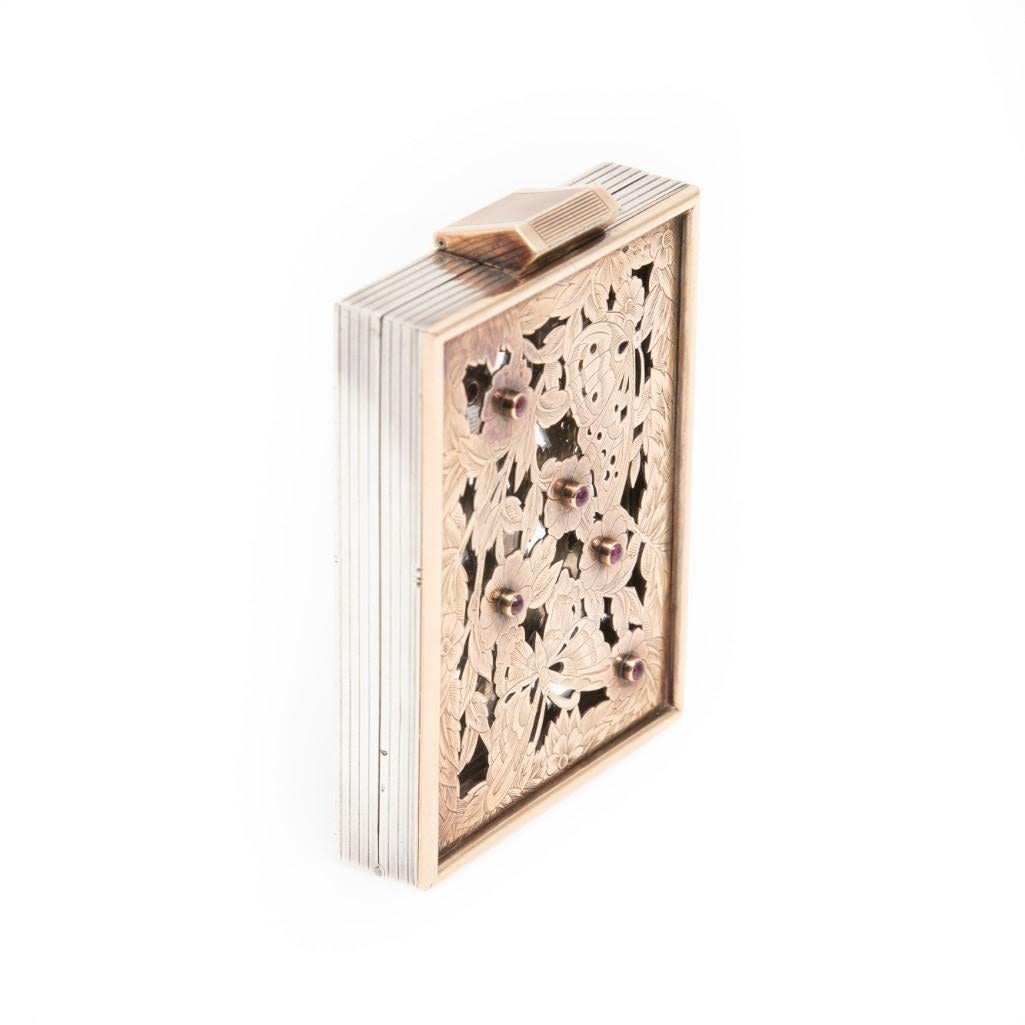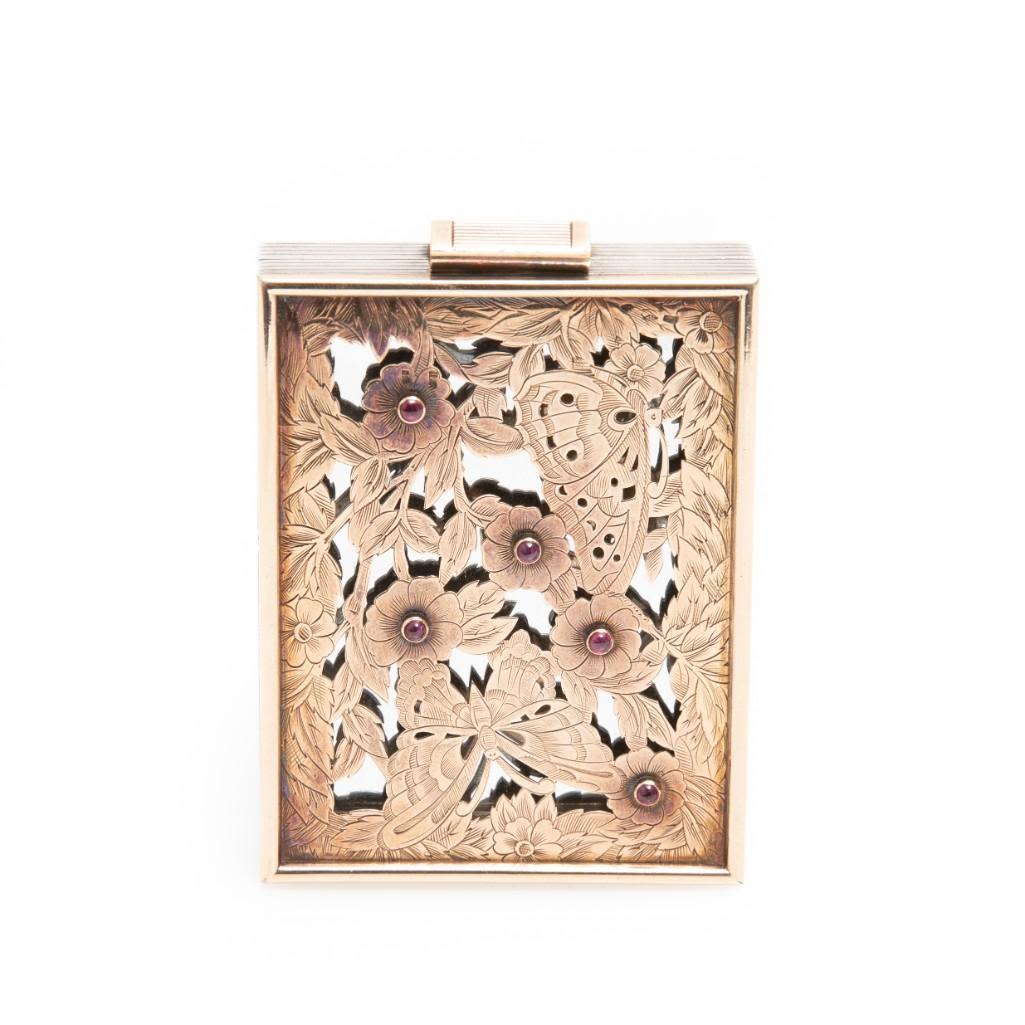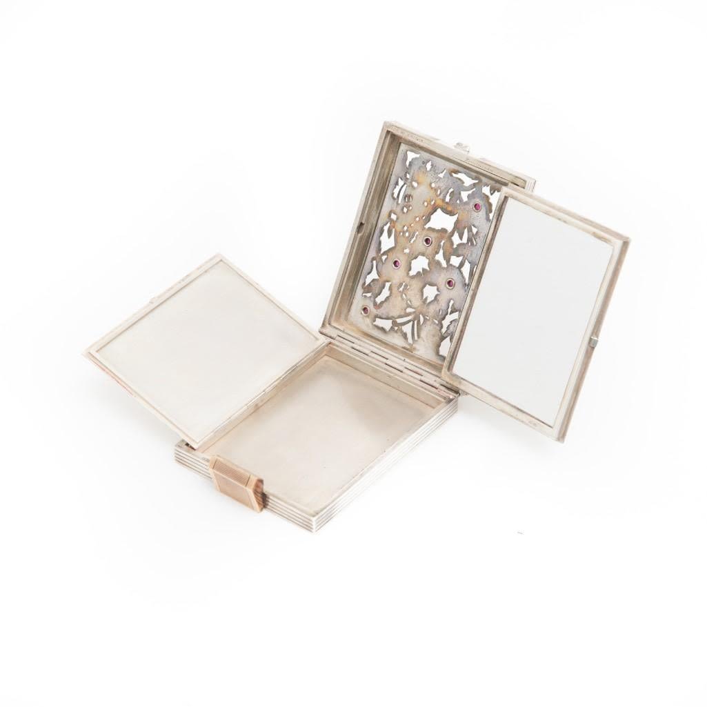 Boucheron, Sterling Silver, Gold, and Ruby Floral Motif Compact fitted into a Carrying Case/purse the compact containing five round cabochon cut rubies bezel set on yellow gold lattice work over sterling silver, the compact is removable from its fitted black fitted handbag. Stamp: Made IN FRANCE BOUCHERON (French hallmarks). 115.15 dwts.