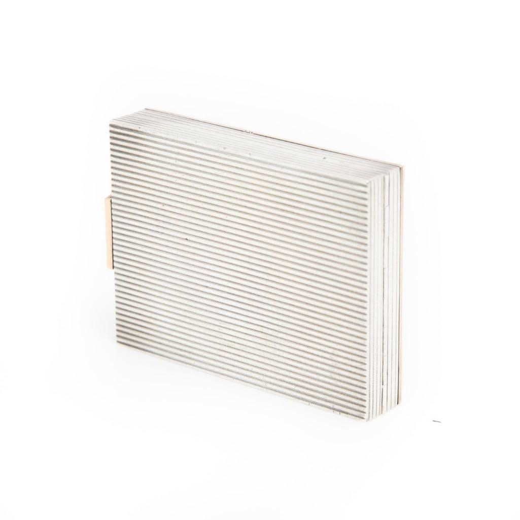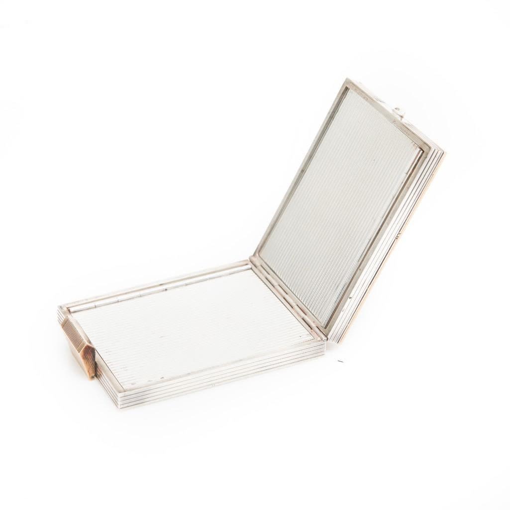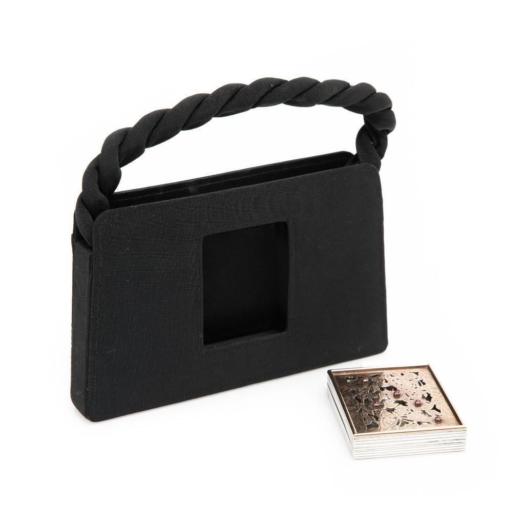 Boucheron, Sterling Silver, Gold, and Ruby Floral Motif Compact fitted into a Carrying Case/purse the compact containing five round cabochon cut rubies bezel set on yellow gold lattice work over sterling silver, the compact is removable from its fitted black fitted handbag. Stamp: Made IN FRANCE BOUCHERON (French hallmarks). 115.15 dwts.