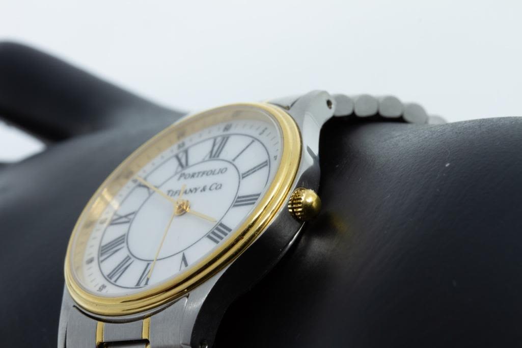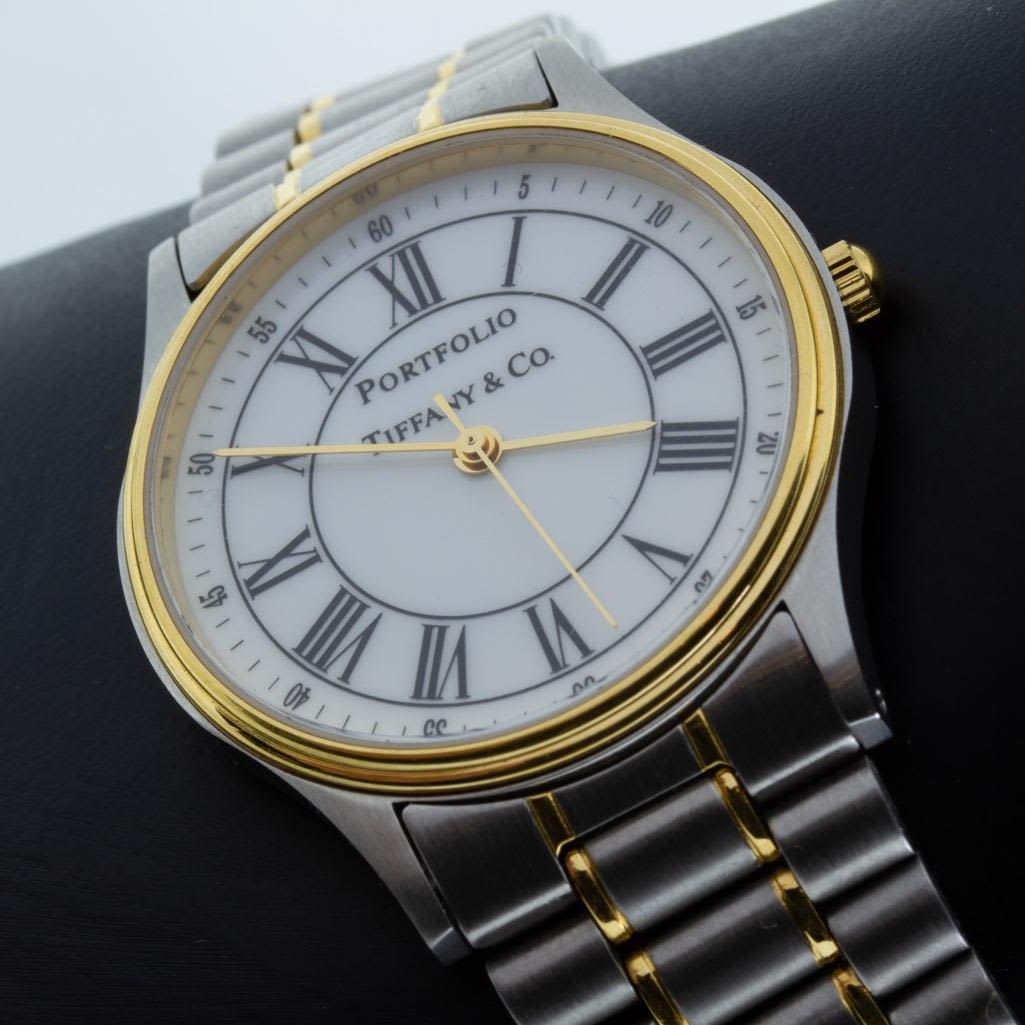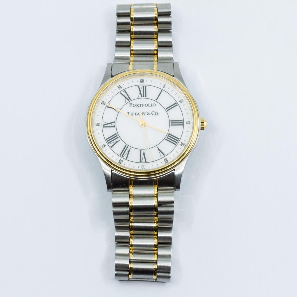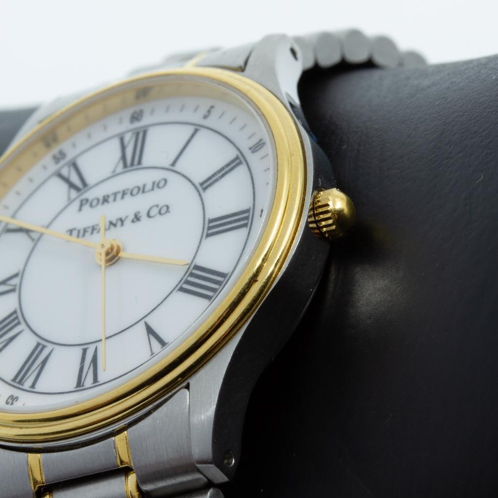 Tiffany & Co portfolio stainless steel and gold wrist watch. Please note the gallery does not warranty the running condition of watches. Probably needs servicing.