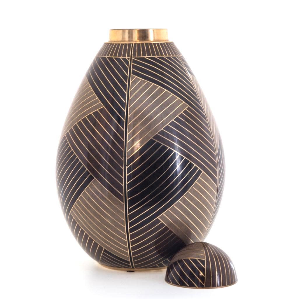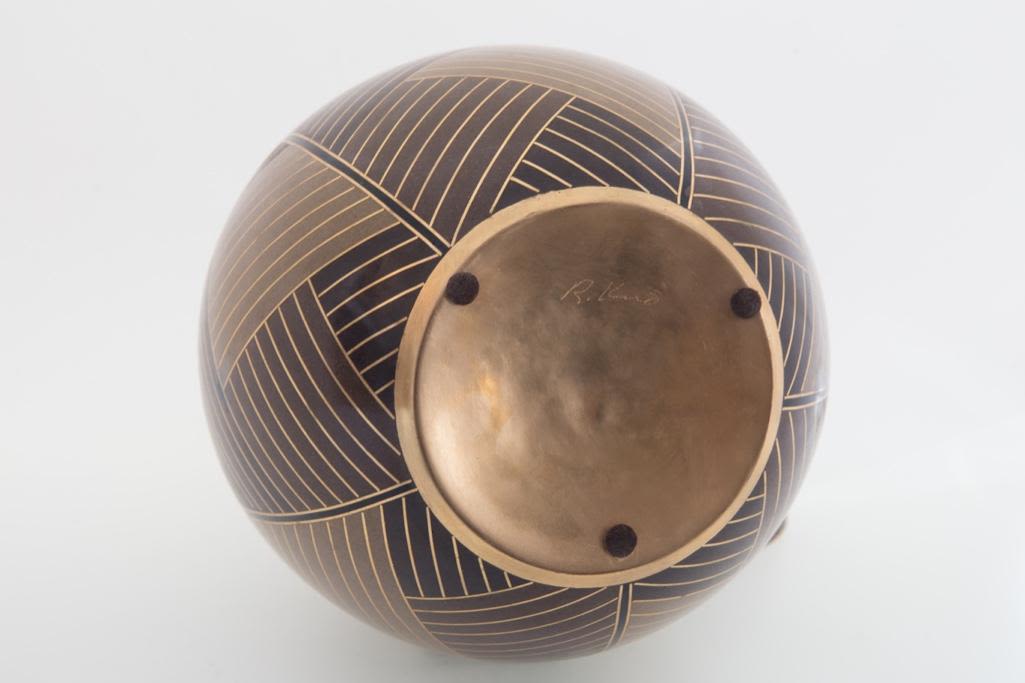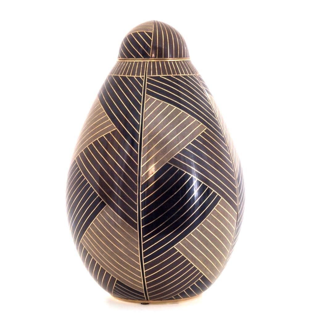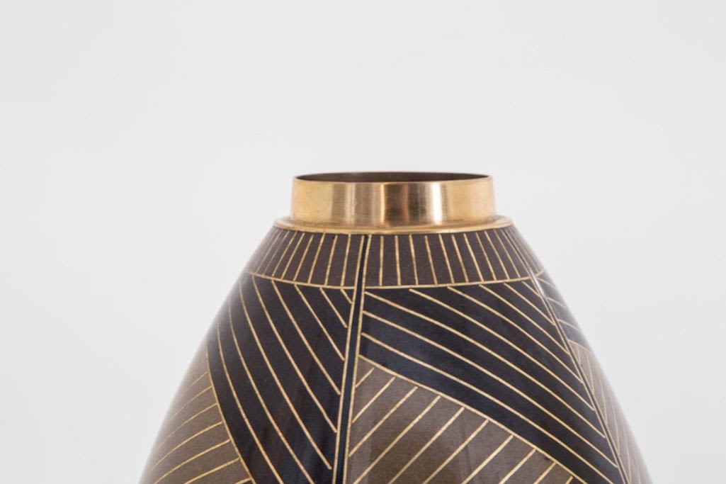 Robert Kuo Art Deco revival brass covered vase with cloisonne enamel in striped geometric motif, signed underside "R. Kuo." Well known and well received in China In 1973, Kuo immigrated to the United States and opened a studio for cloisonne in Beverly Hills. Kuo cultivated a clientele that appreciated the way he "opened up" Chinese tradition. Utilizing the influences of Art Nouveau and Art Deco, Kuo introduced new shapes, finishes, and objects to cloisonne It was during this time that the Smithsonian’s Sackler Gallery exhibited his works this piece measures 14" H x 9.5" diameter.