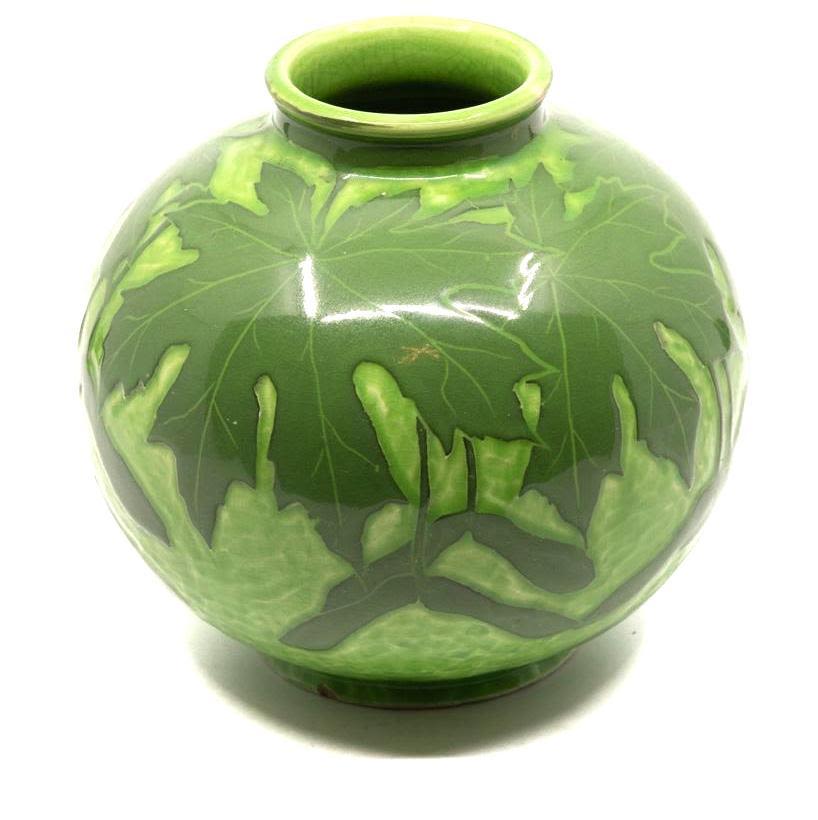 Gustavsberg scraffito art nouveau green on green cut back ceramic vase by Josef Eckberg(attrib) circa 1900.with maple leaf design vase circa 1900 approx 6" x 6" . One very small chip on the base otherwise in very good condition.