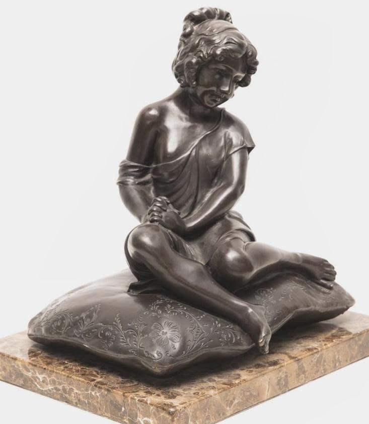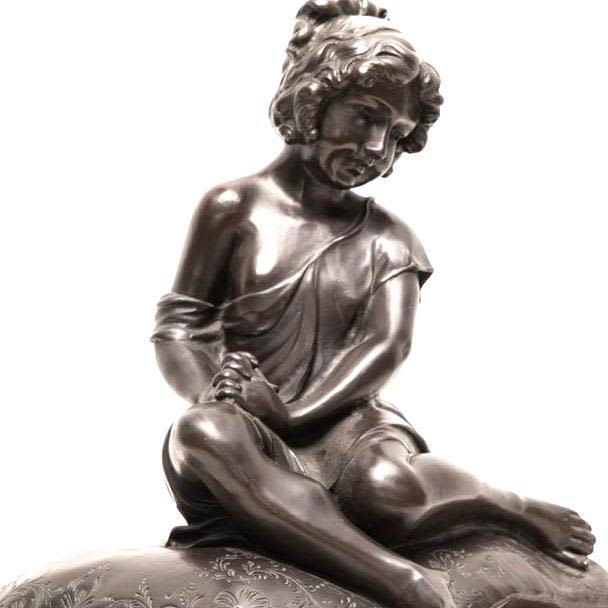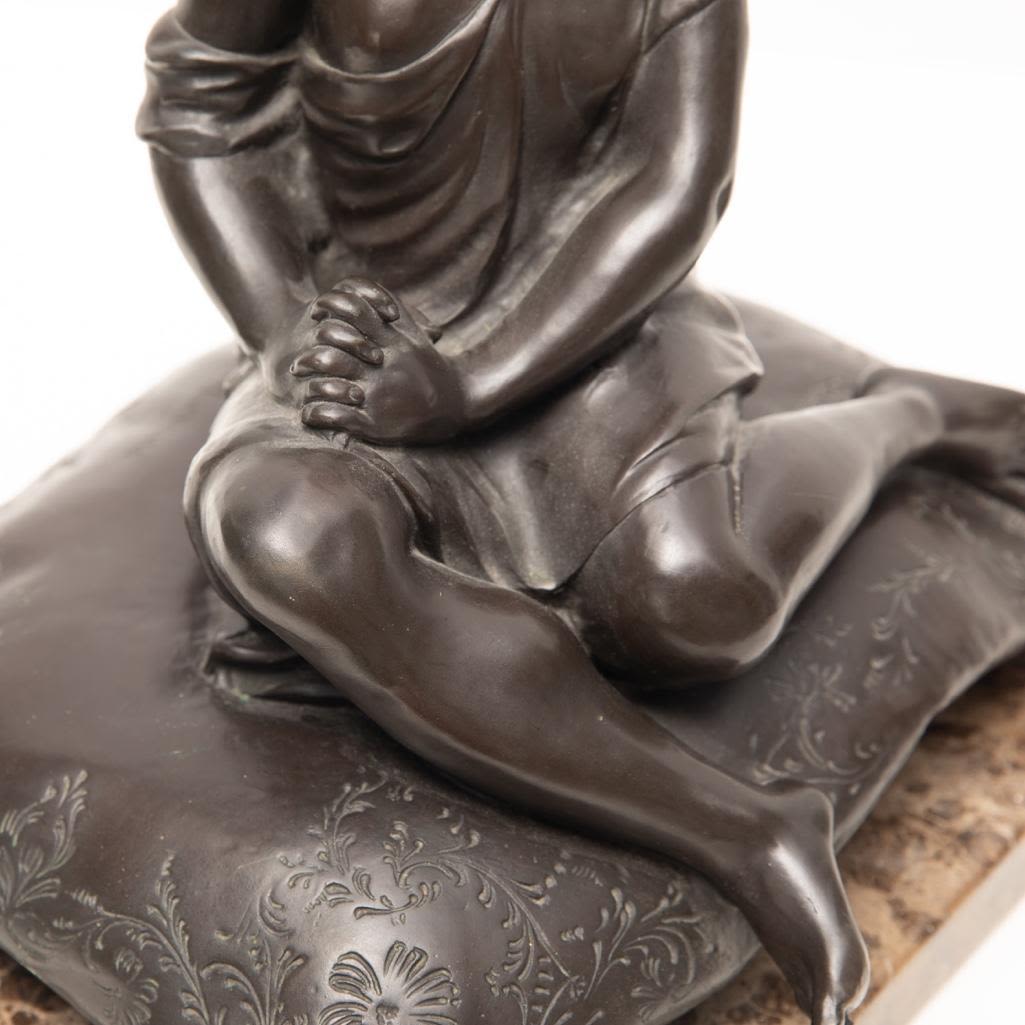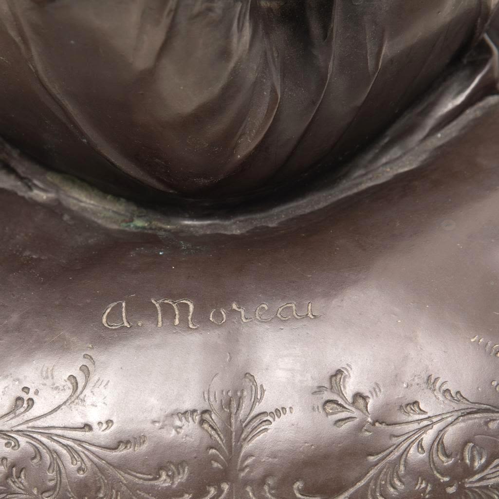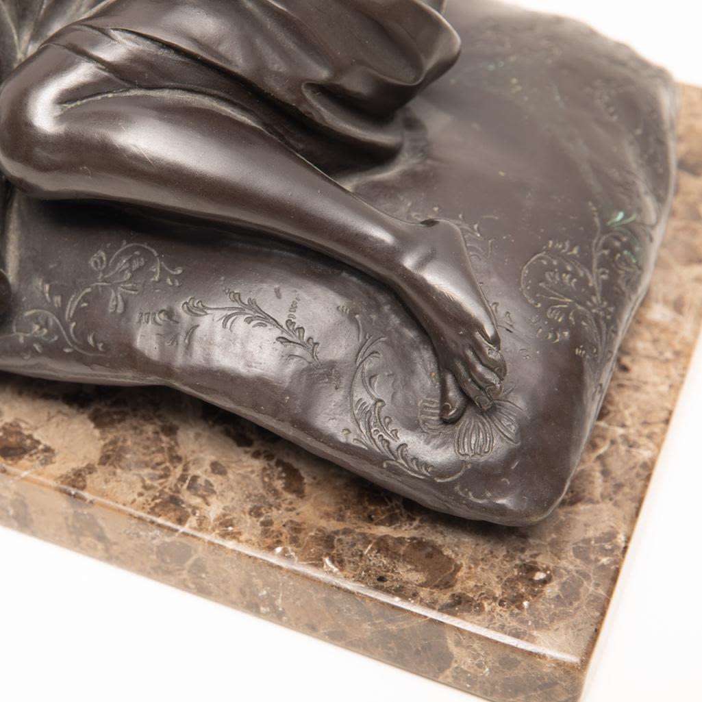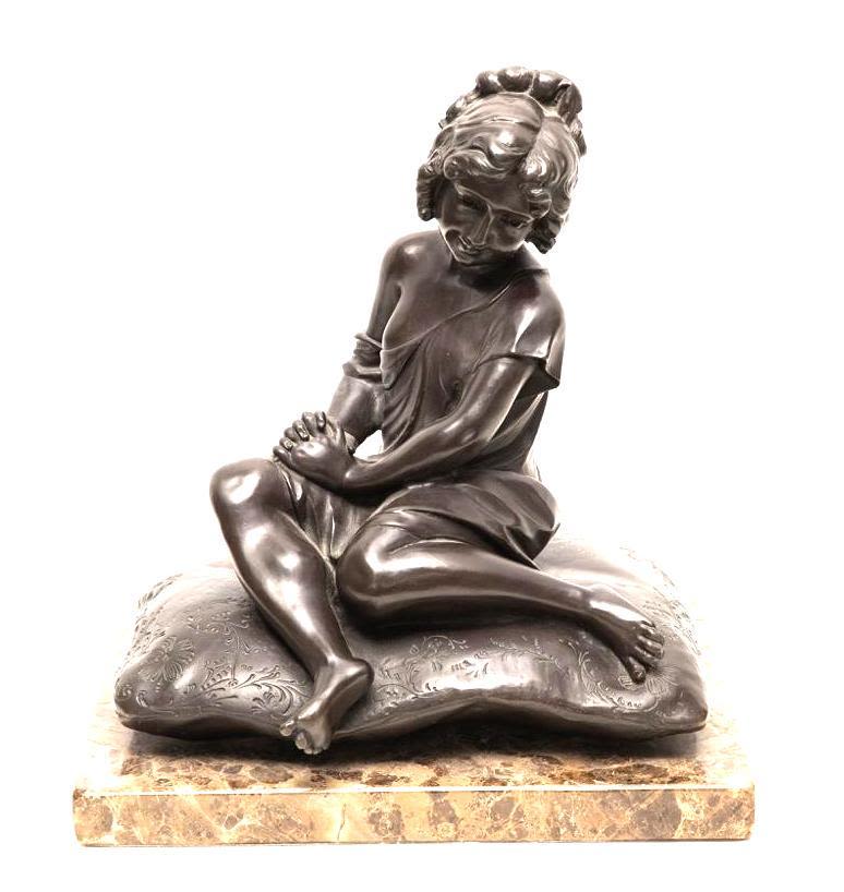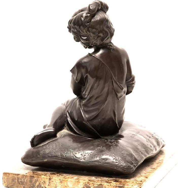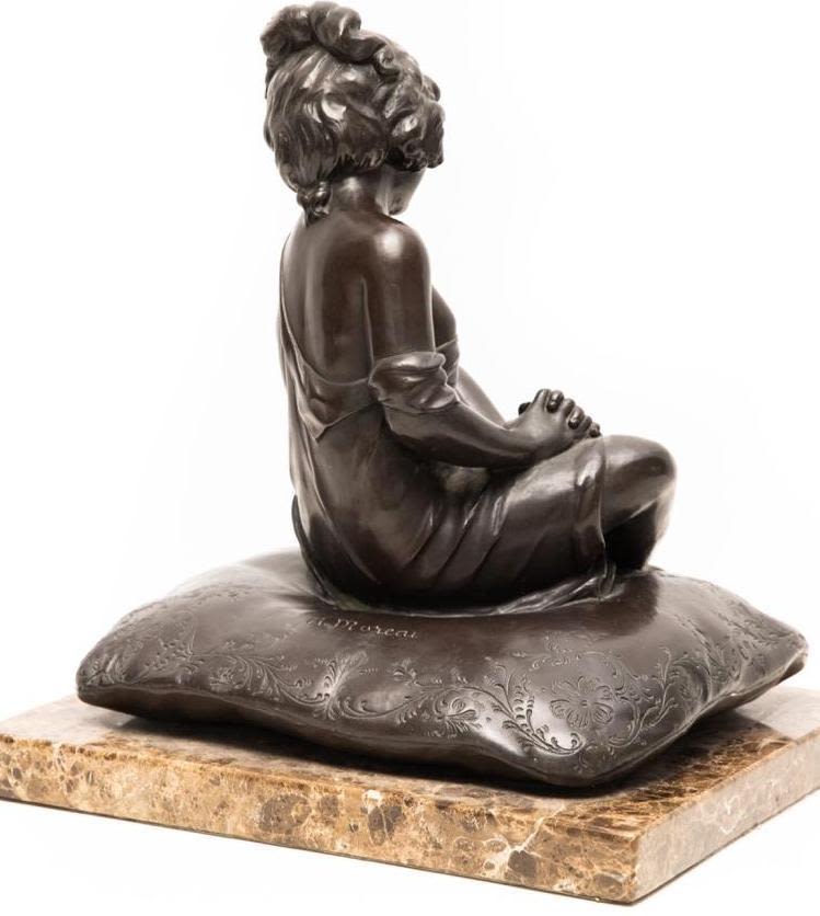 Auguste Moreau (French 1834-1917) "Young Woman on pillow" bronze sculpture on a marble base, depicting a seated girl with her hands clasped, signed "A. Moreau." 15.25" H x 13.25" W x 11" D.