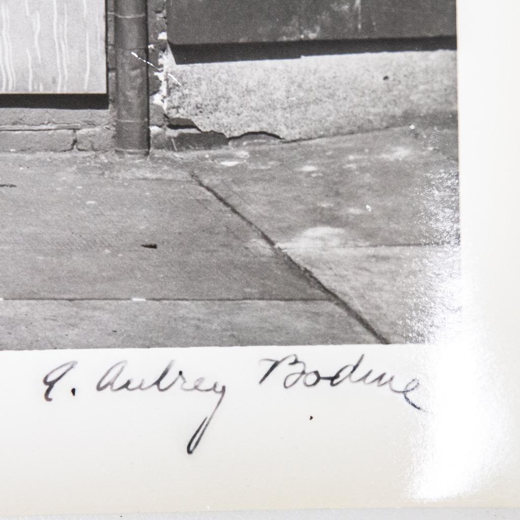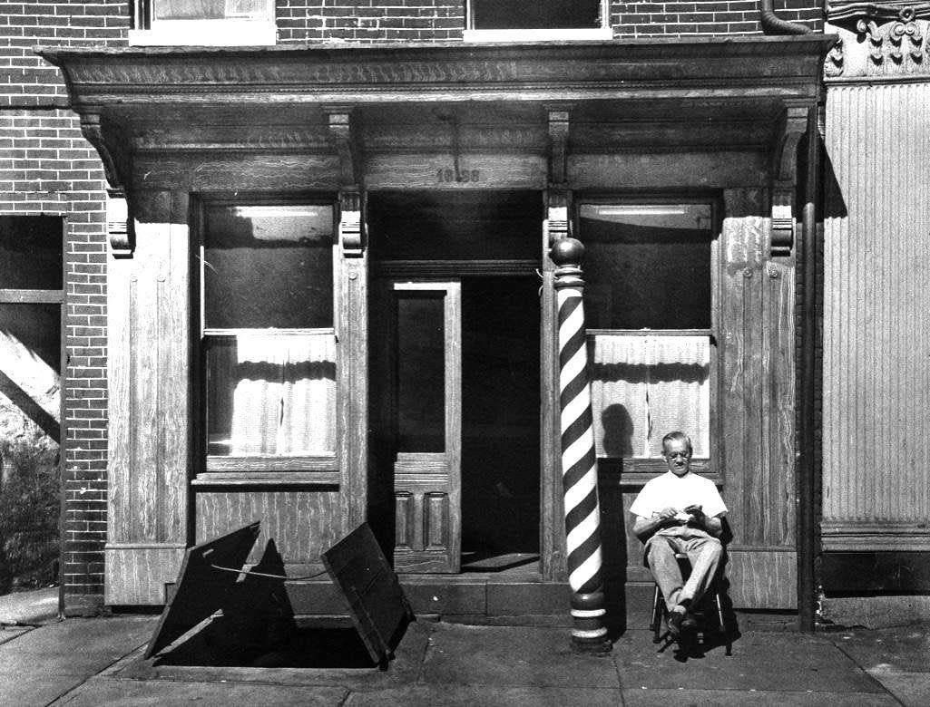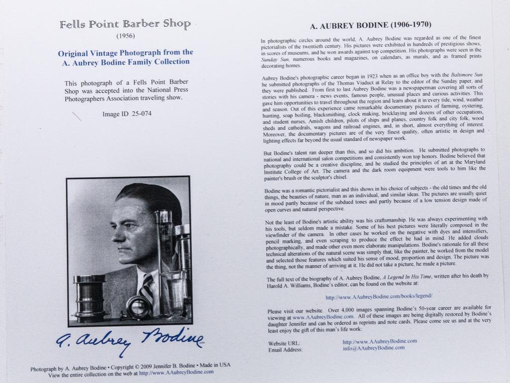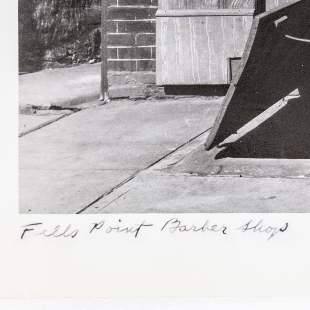 Gelatin silver print, signed "A. Aubrey Bodine" lr, Falls Point Barber Shop, photographer stamp on verso, 11 x 14 in., unframed