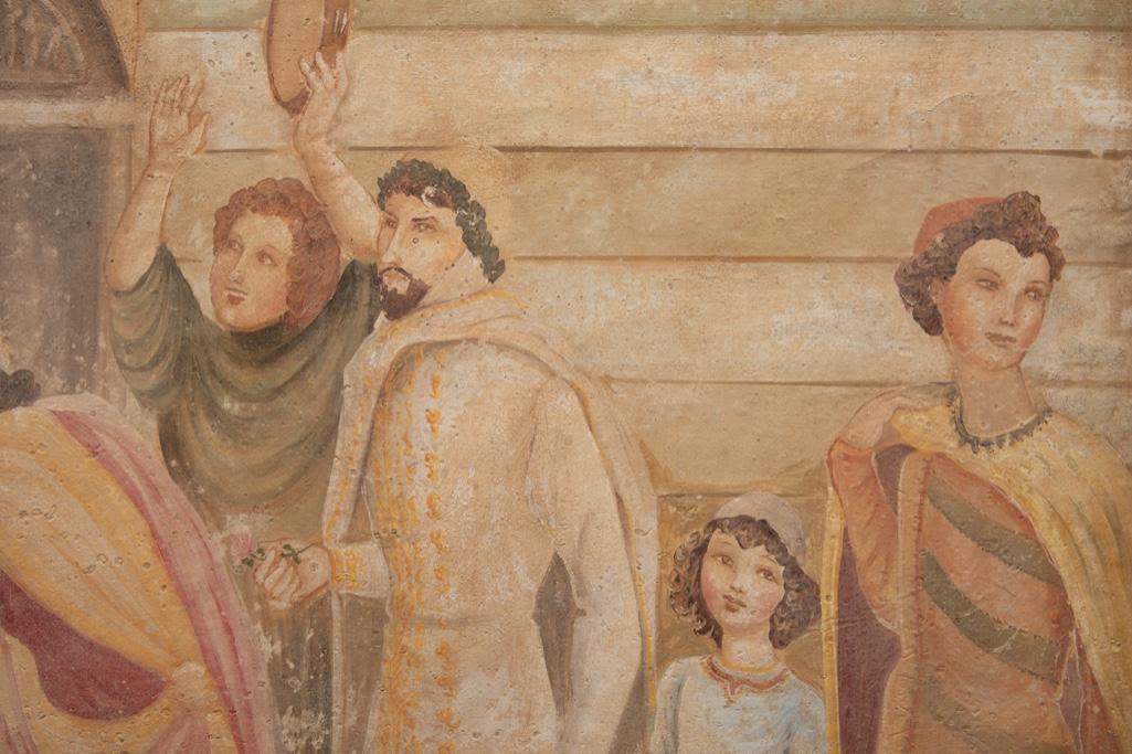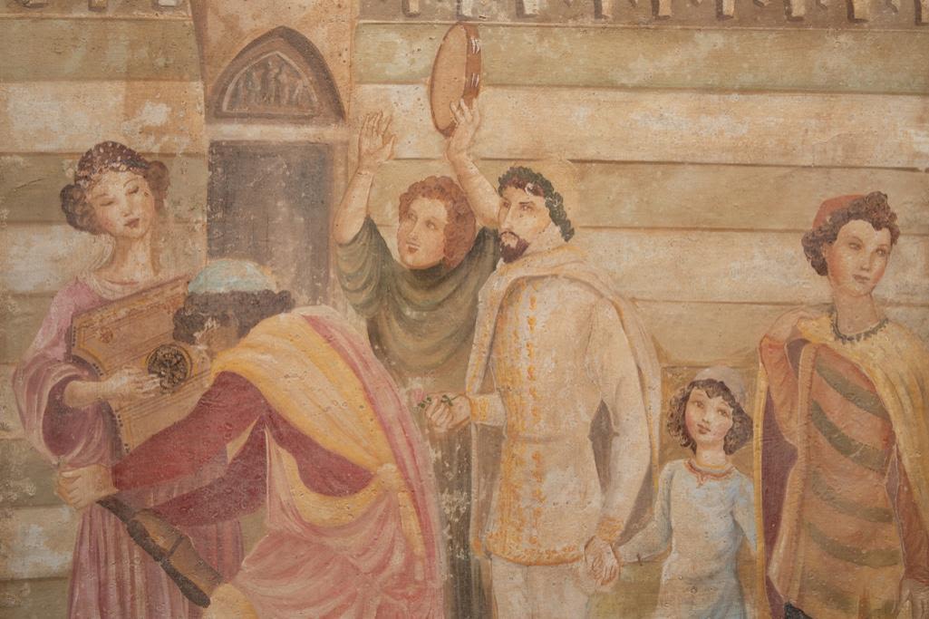 Large French classical fresco technique painting depicting a court celebration with dancing Measure 59 in h x 39 in W Approx. In Fair Condition. Some intentional aging visible for more classical fresco look. early 20th century