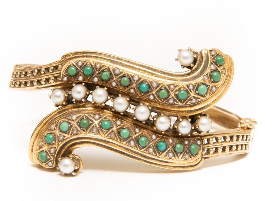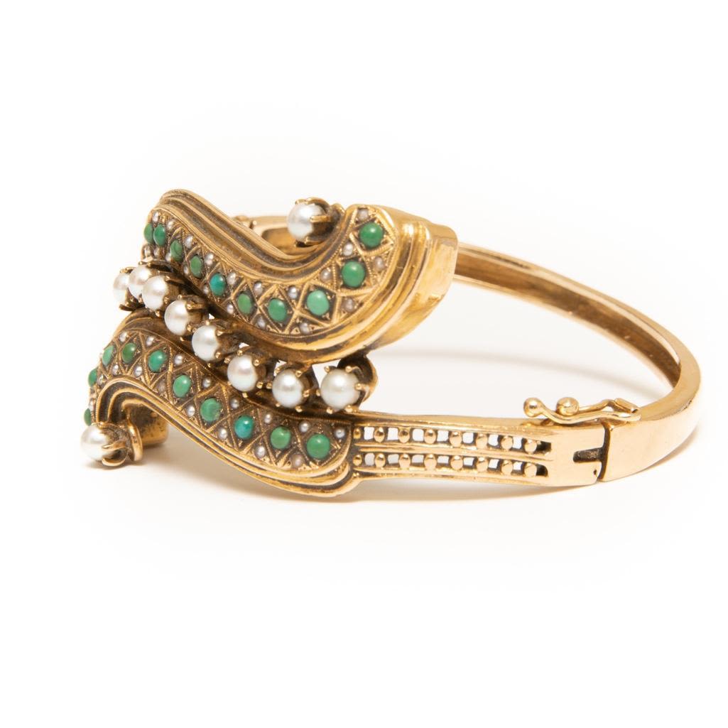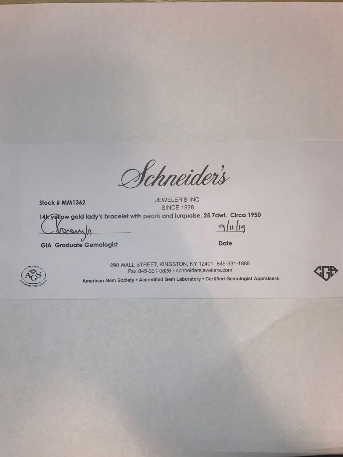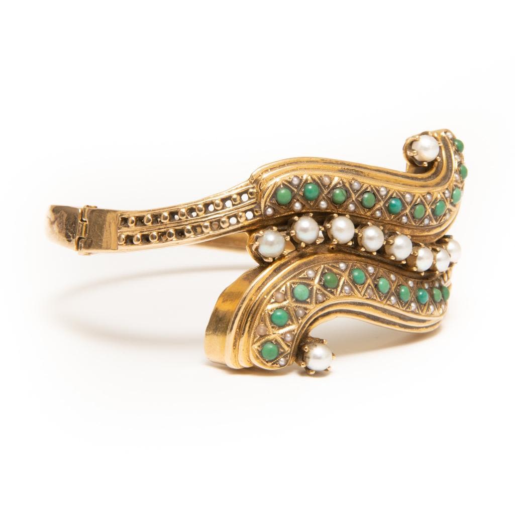 Vintage 14K gold bracelet with pearls and jade. measures 2.5"W and weighs 26.5dwt approx. This lot is accompanied by a GIA appraiser letter from an independent and well respected firm established over 75 years ago.