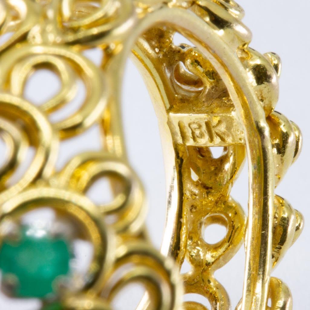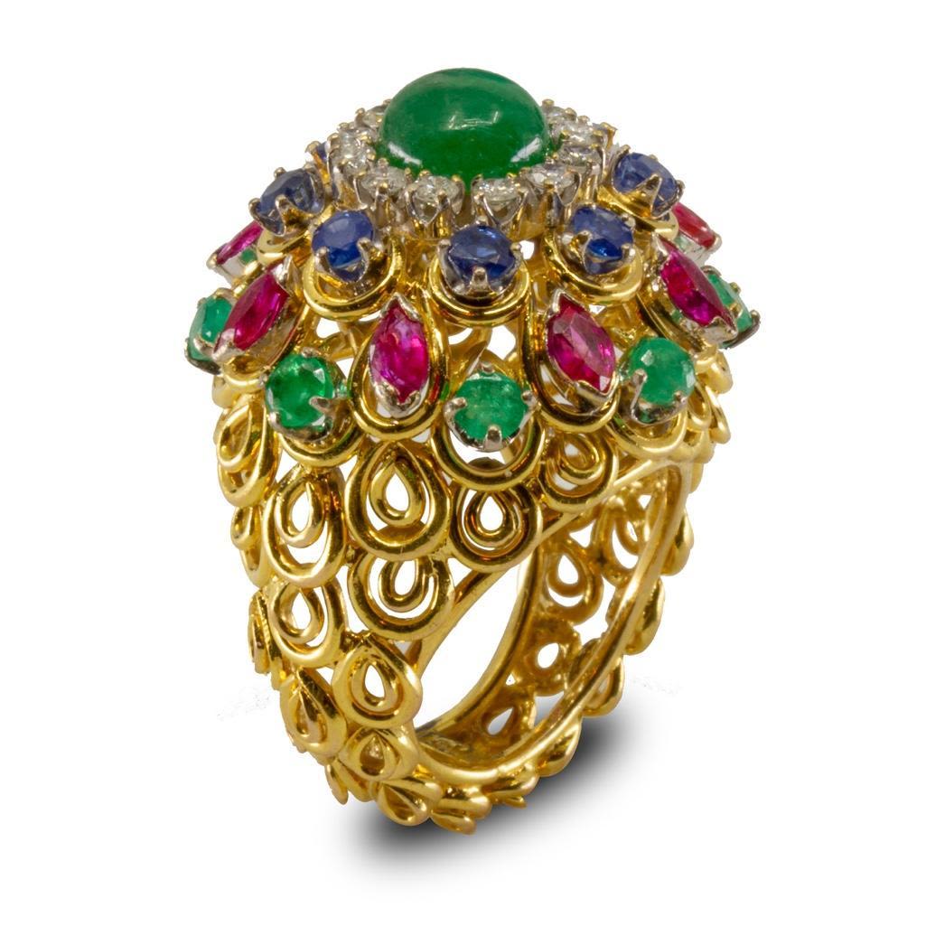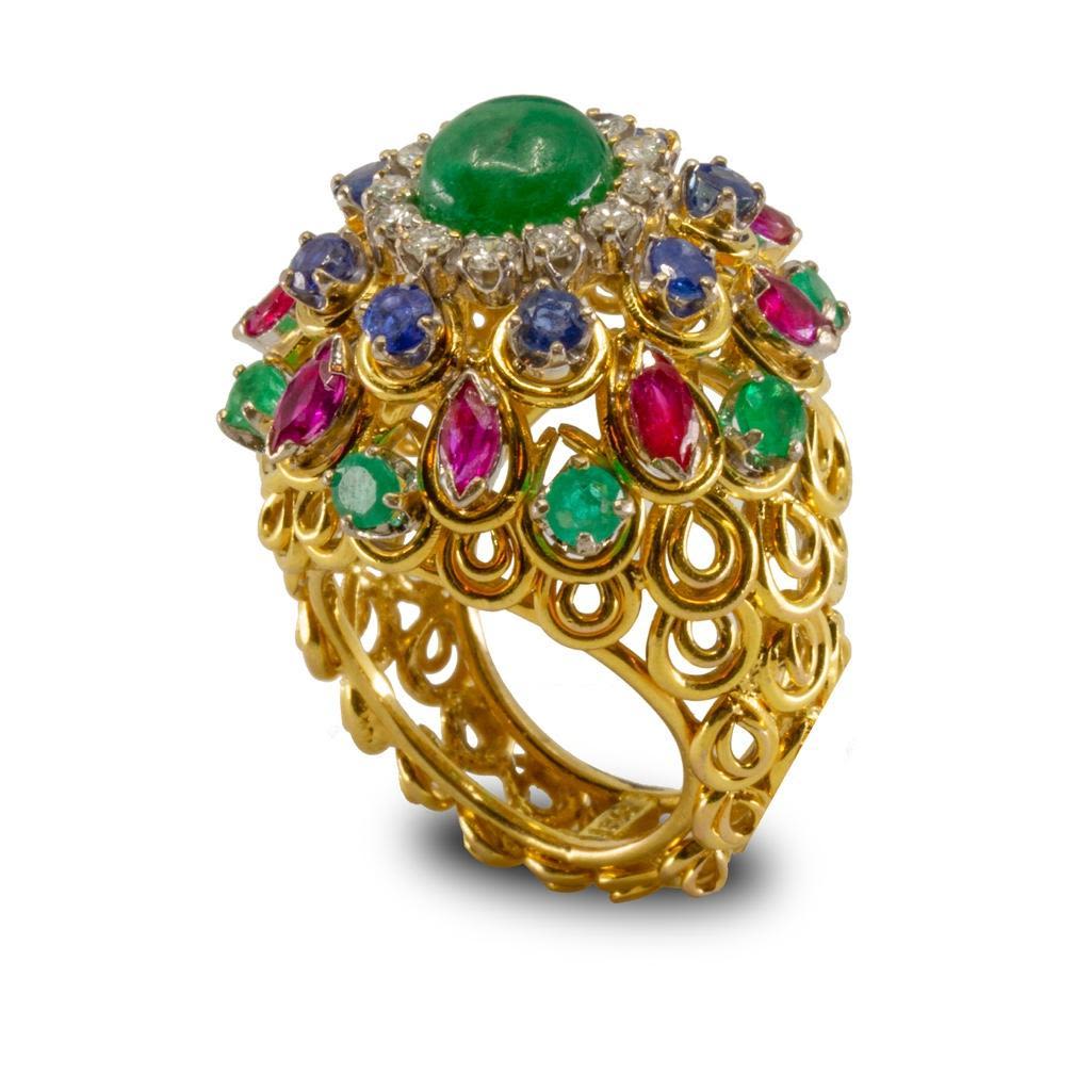 18k gold Diamond sapphire, ruby and emerald bombe statement ring with open work mounting. This lot is accompanied by a GIA appraiser letter from an independent and well respected firm established over 75 years ago.