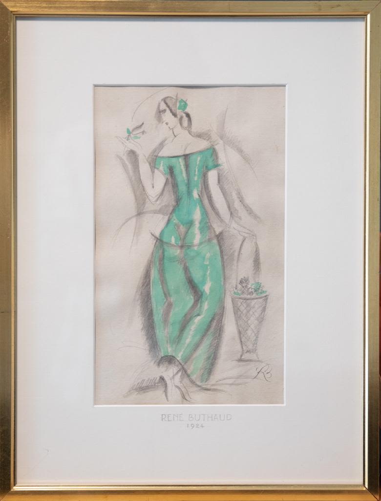 Rene Buthaud mid century woman in green dress, signed and dated 1924 mixed media on paper Provenance: The artist, collection Michel Fortin, Paris: Collection of Stephen Engel, Florida: Literature: Cruège, René Buthaud see page 80. Rene Buthaud mid century nude study, signed gouache on paper Provenance: The artist, collection Michel Fortin, Paris: Collection of Stephen Engel, Florida: Literature: Cruège, René Buthaud. René Buthaud was seen as the most accomplished and important French ceramist of the Art Deco period, an opinion held to this day. He designed simple stoneware forms, made for him by local potters, and used crackle glazes with which to decorate them. He was also influenced by African tribal art, evident in those pieces where he used lusters or what he called ‘peau de serpent’ (snakeskin). Many of his best-known pieces are painted with supine female nudes. Work by Buthaud can be found in the collections of the Musée des Arts Décoratifs in Paris, the Metropolitan Museum of Art, among many others. H 19.5 in. x W 14.75 in. x D .5 in. Framed