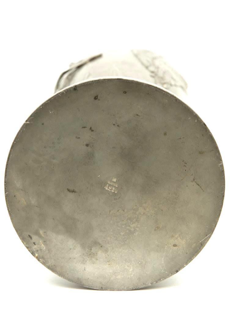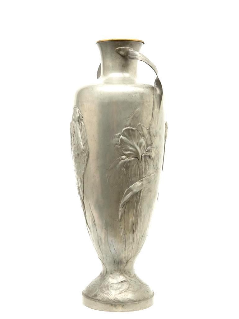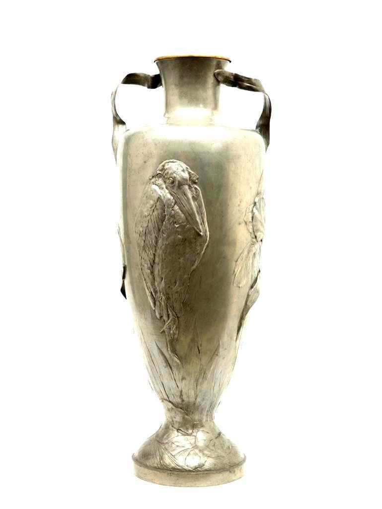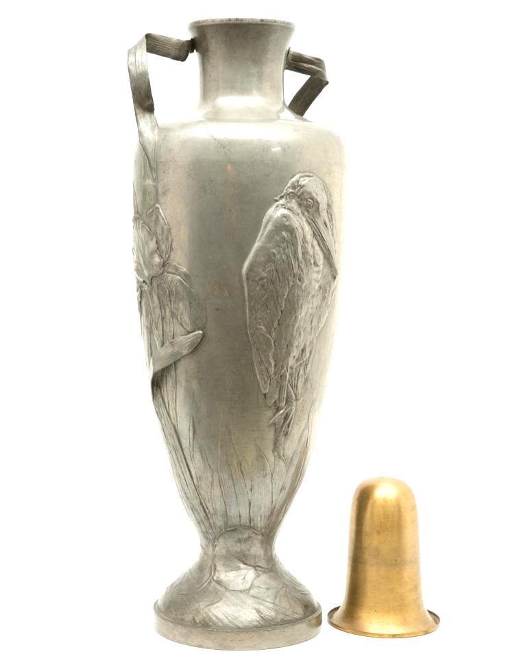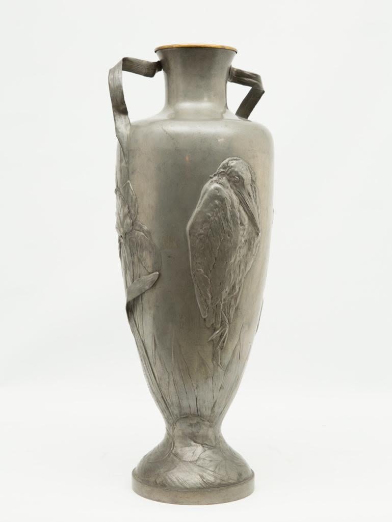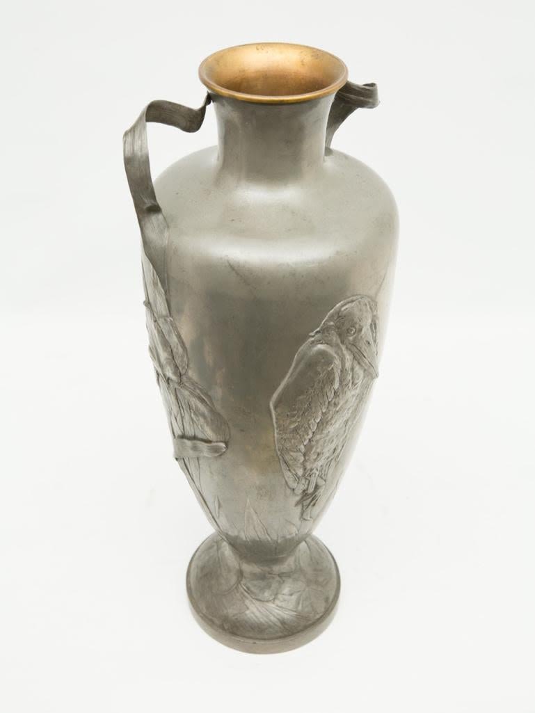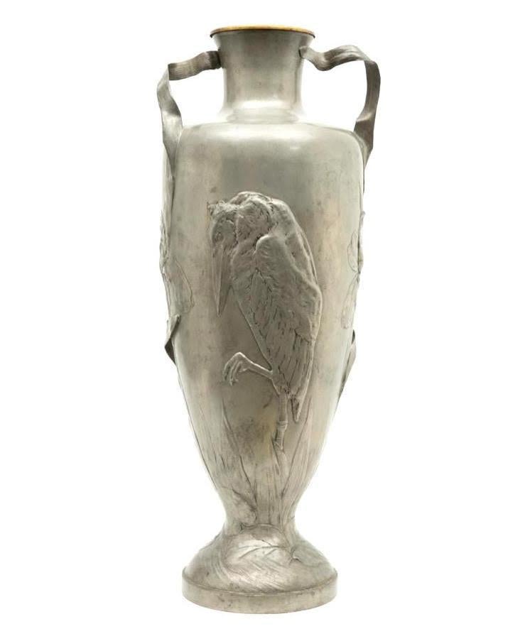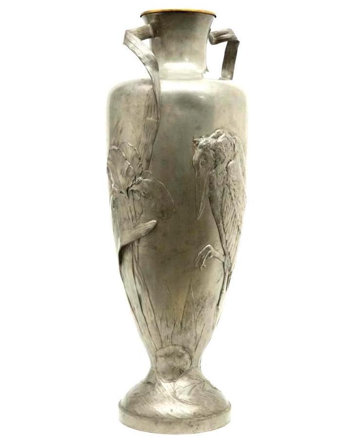 Kayserzinn pewter signed monumental exhibition vase with storks/flowers 24"H circa 1900, Germany