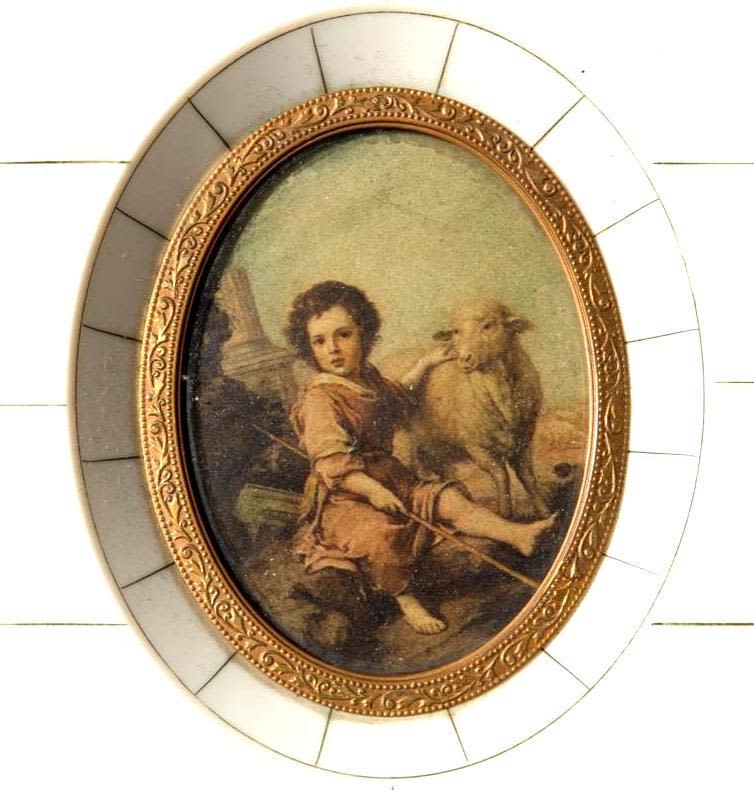 Miniature in bone frame. Boy with Sheep. Measures 4.25"W x 5"H Framed