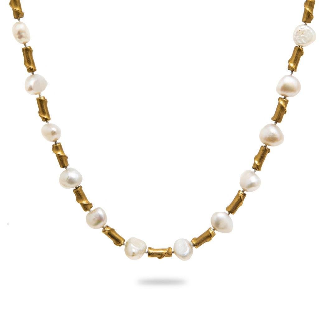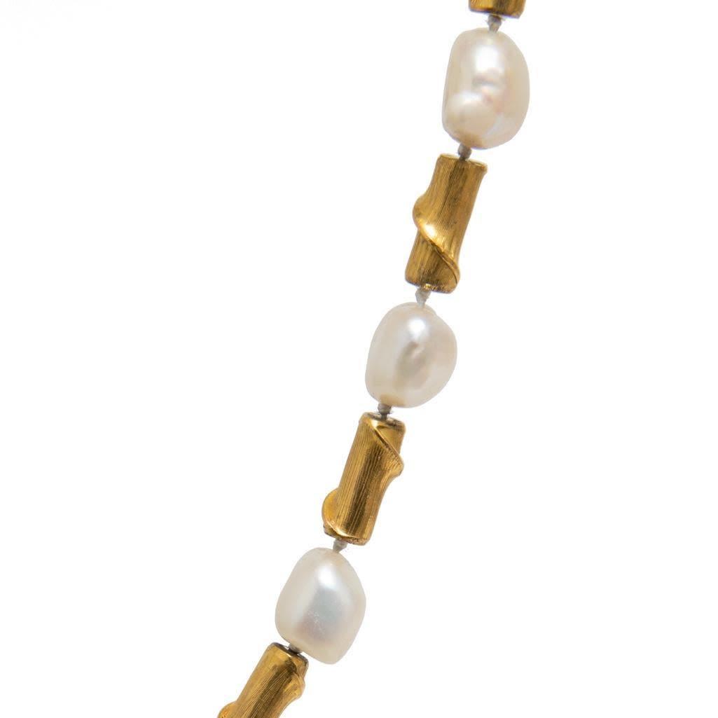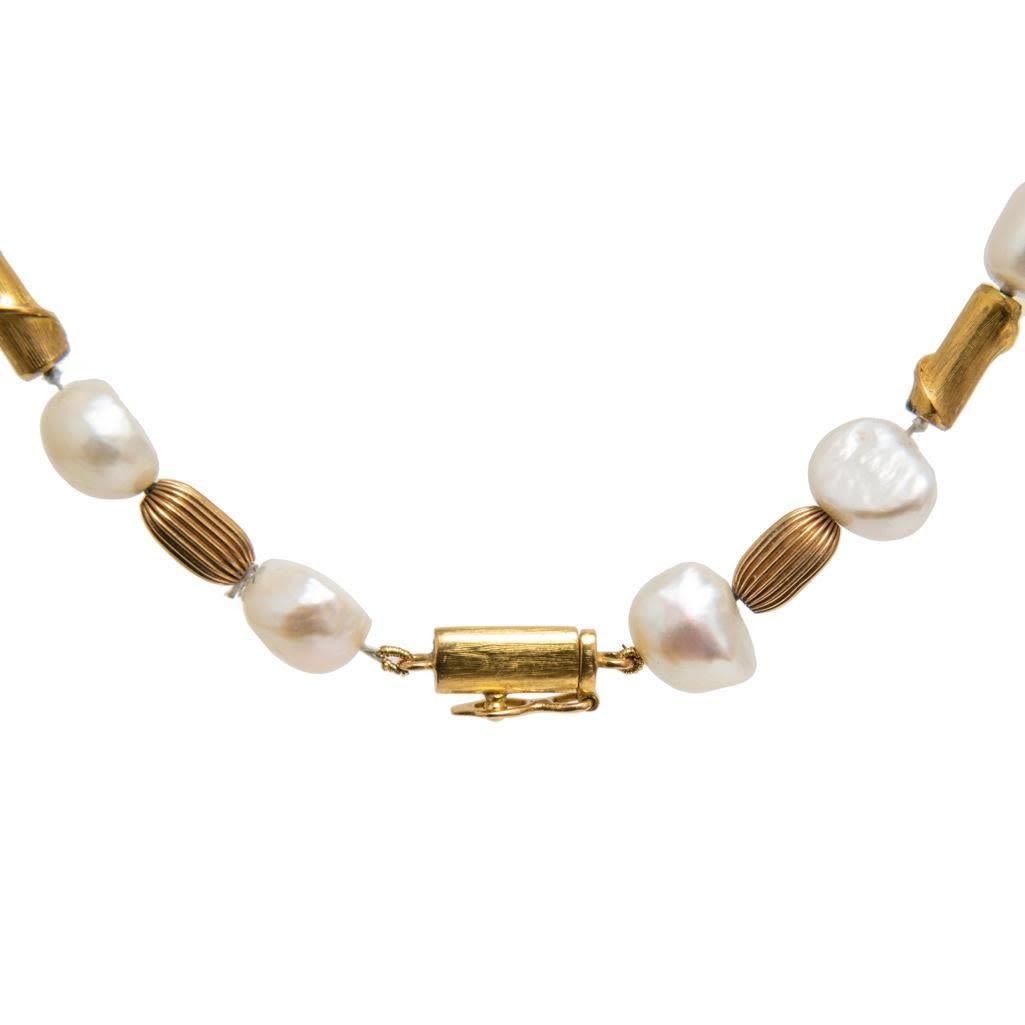 18K Yellow Gold Branch-Form Motif Tubular Beads and Freshwater Pearls Necklace. Hallmarked "AB CE." 17.5"L Approx 28.5 dwt. This lot is accompanied by a GIA appraiser letter from an independent and well respected firm established over 75 years ago.