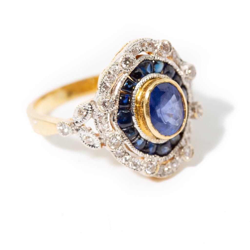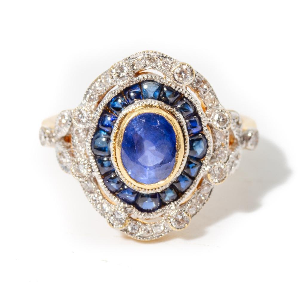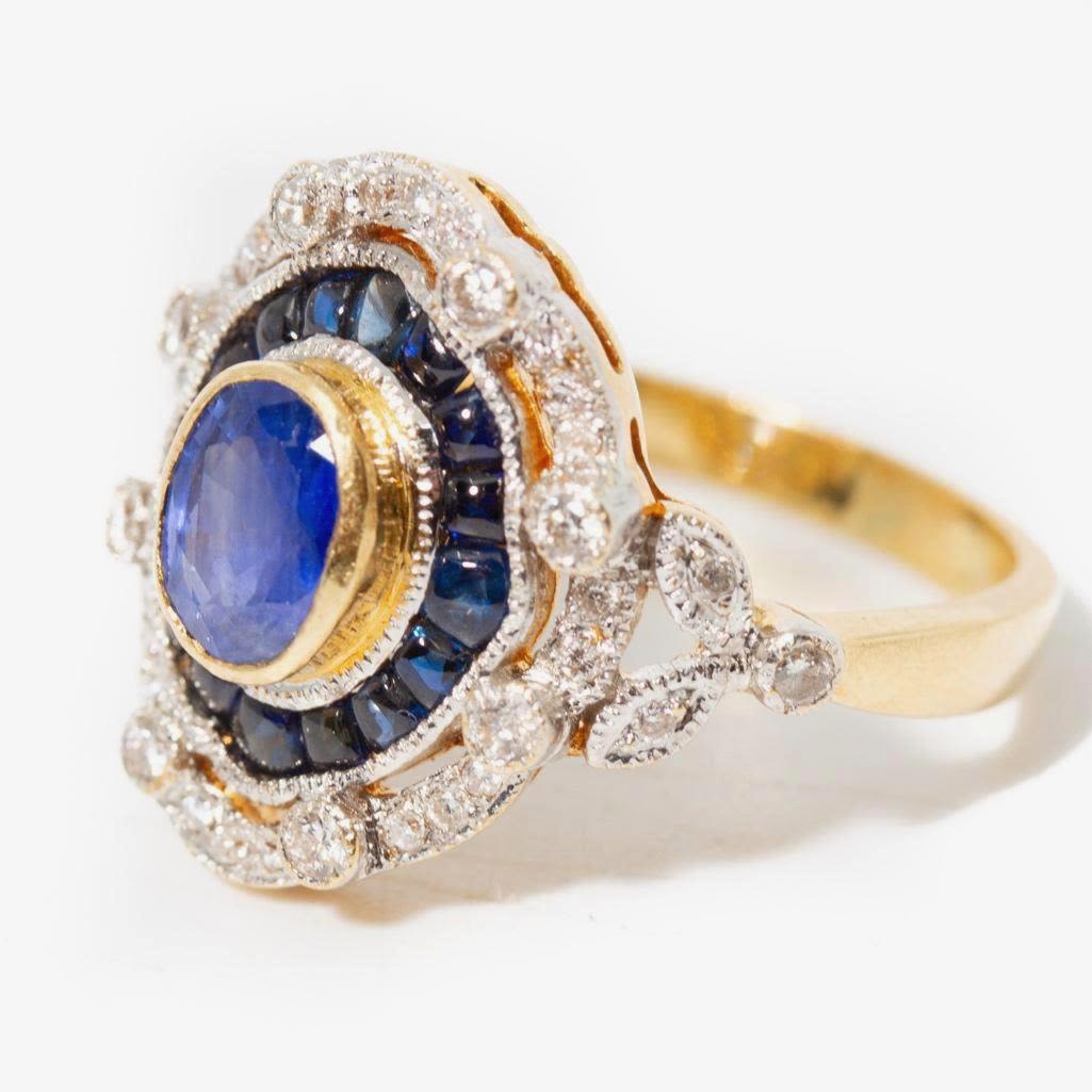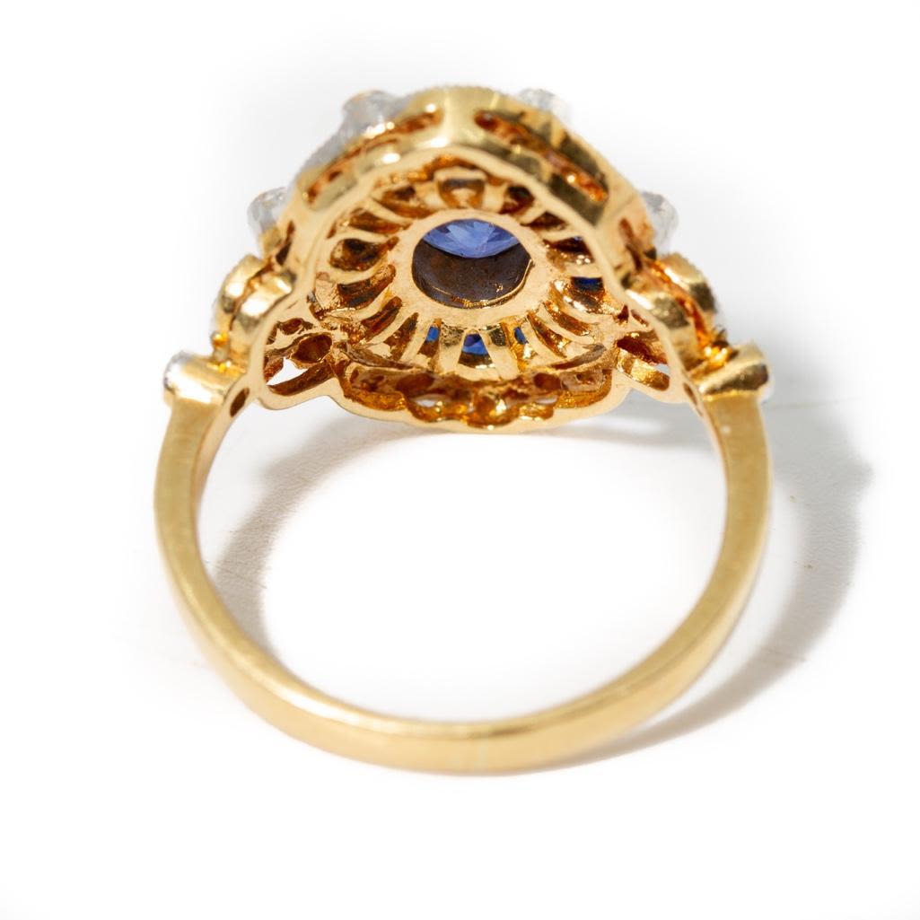 good quaity estate 18k Gold Sapphire Diamond Rosetta central sapphire Approx 0.8CT Diamonds Approx 0.3CT. Ring Size: 6.5
