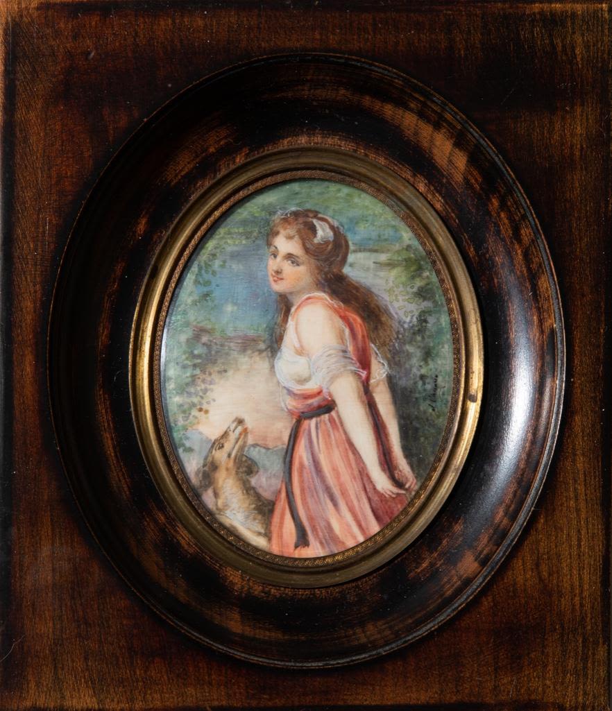 19th Century Miniature Painting of Young woman with dog. Measures 5.5"W x 6.25"H