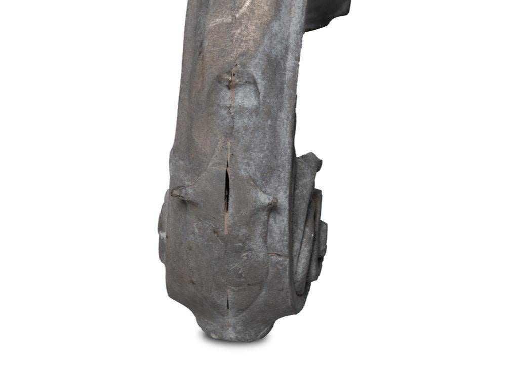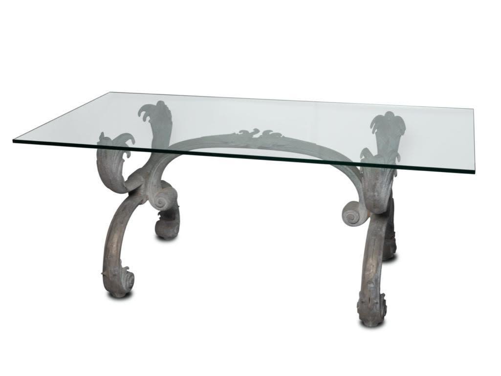 The zinc trestle base with curvilinear foliate designs is beautifully weathered patina and supports a glass top It measures approximate 28" height x 70" long and 34" wide. Condition is good with one minor seam split on one foot.